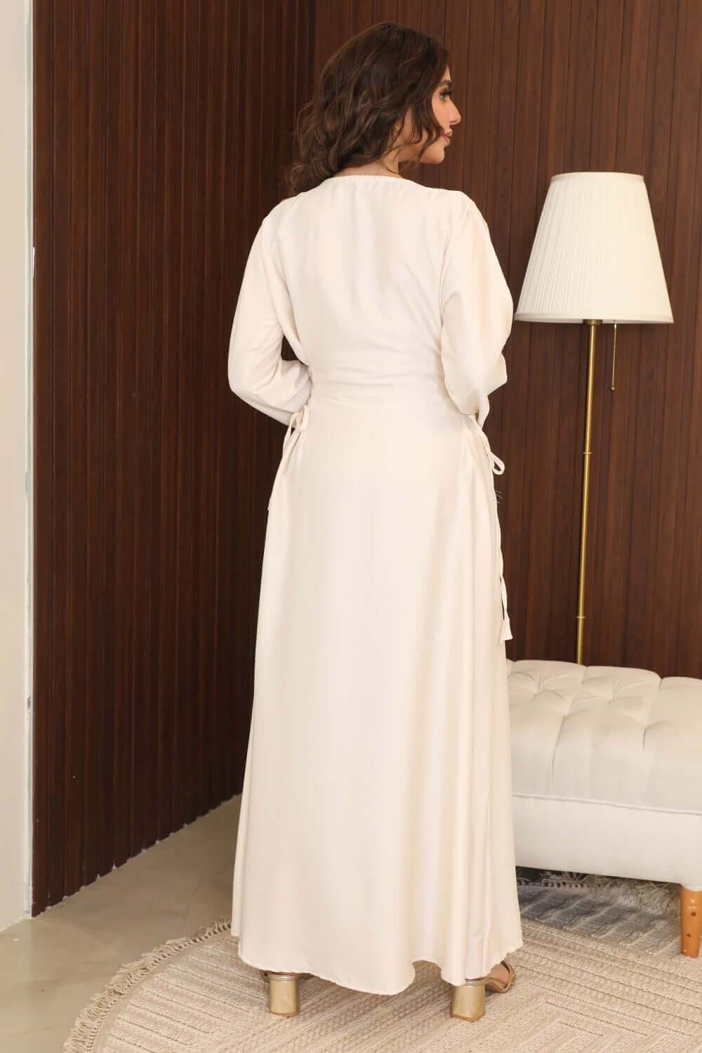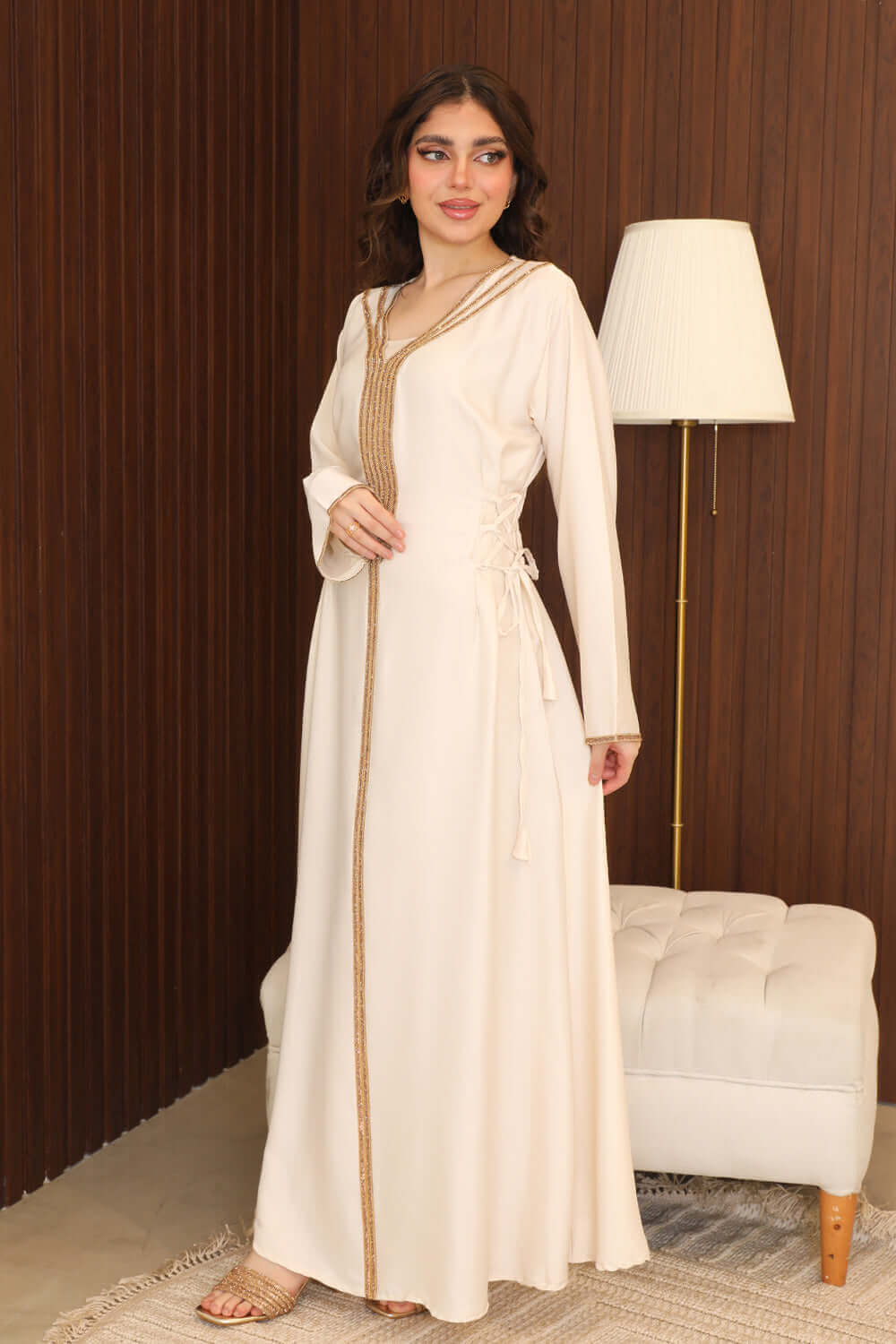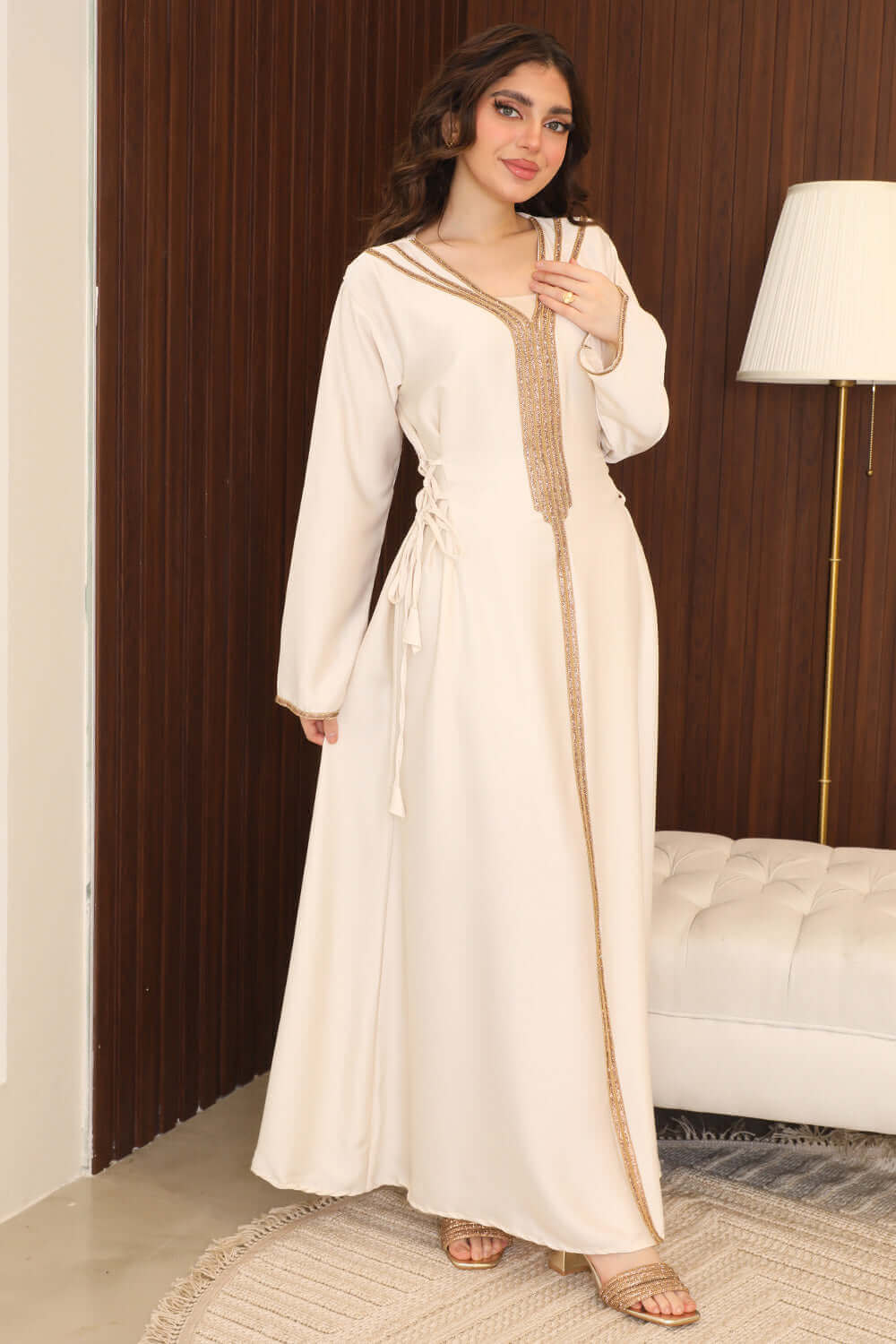 Design type A jalabiya with a tie on the sides decorated with golden stones Story type Maxi jalabiya with side ties and gold studs, long sleeves The occasion Occasions or public outings waist wide collar v sleeves long stretching Non-stretchable Material crepe Care instructions Machine wash and iron with steam at low temperature (40%) and hang dry.