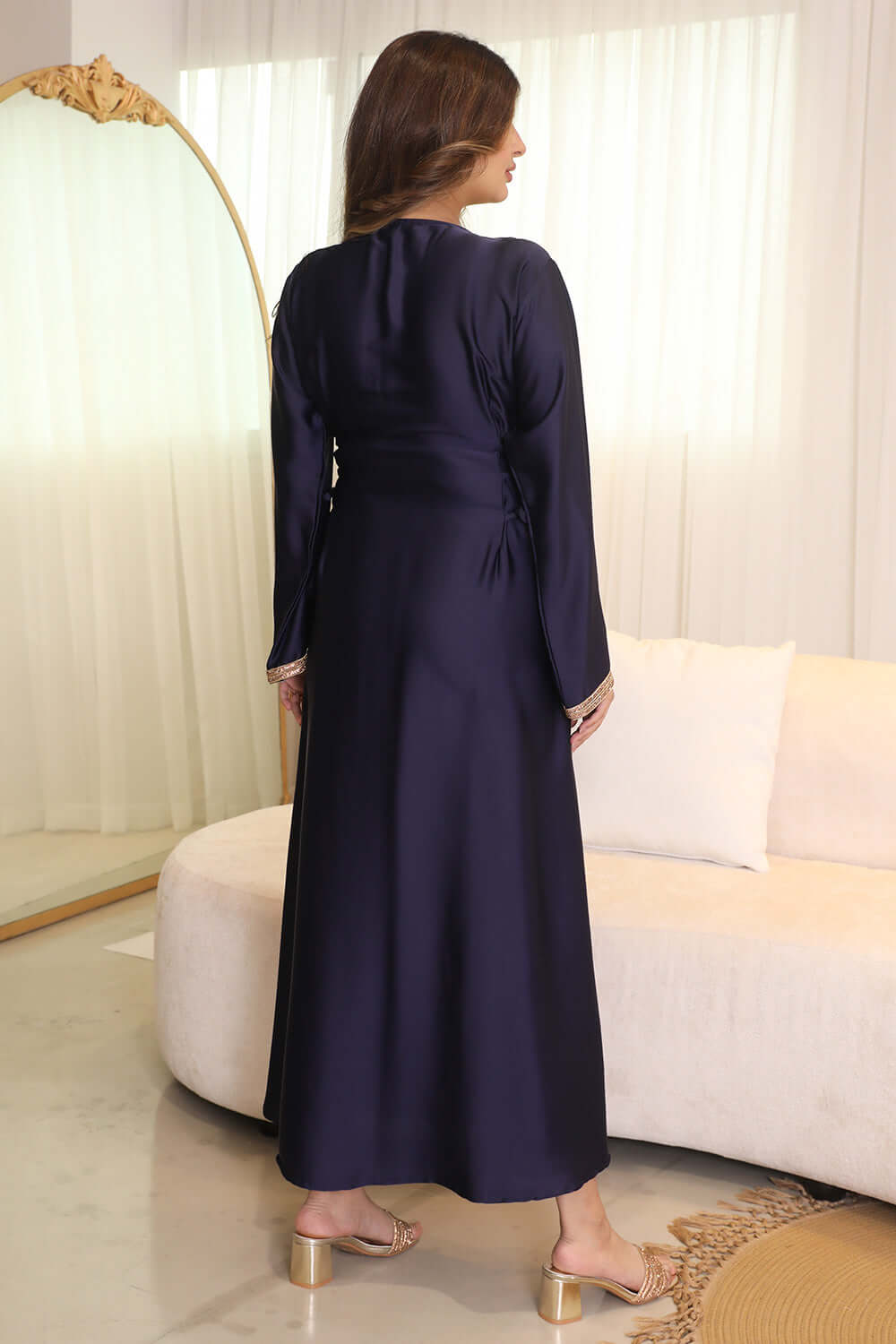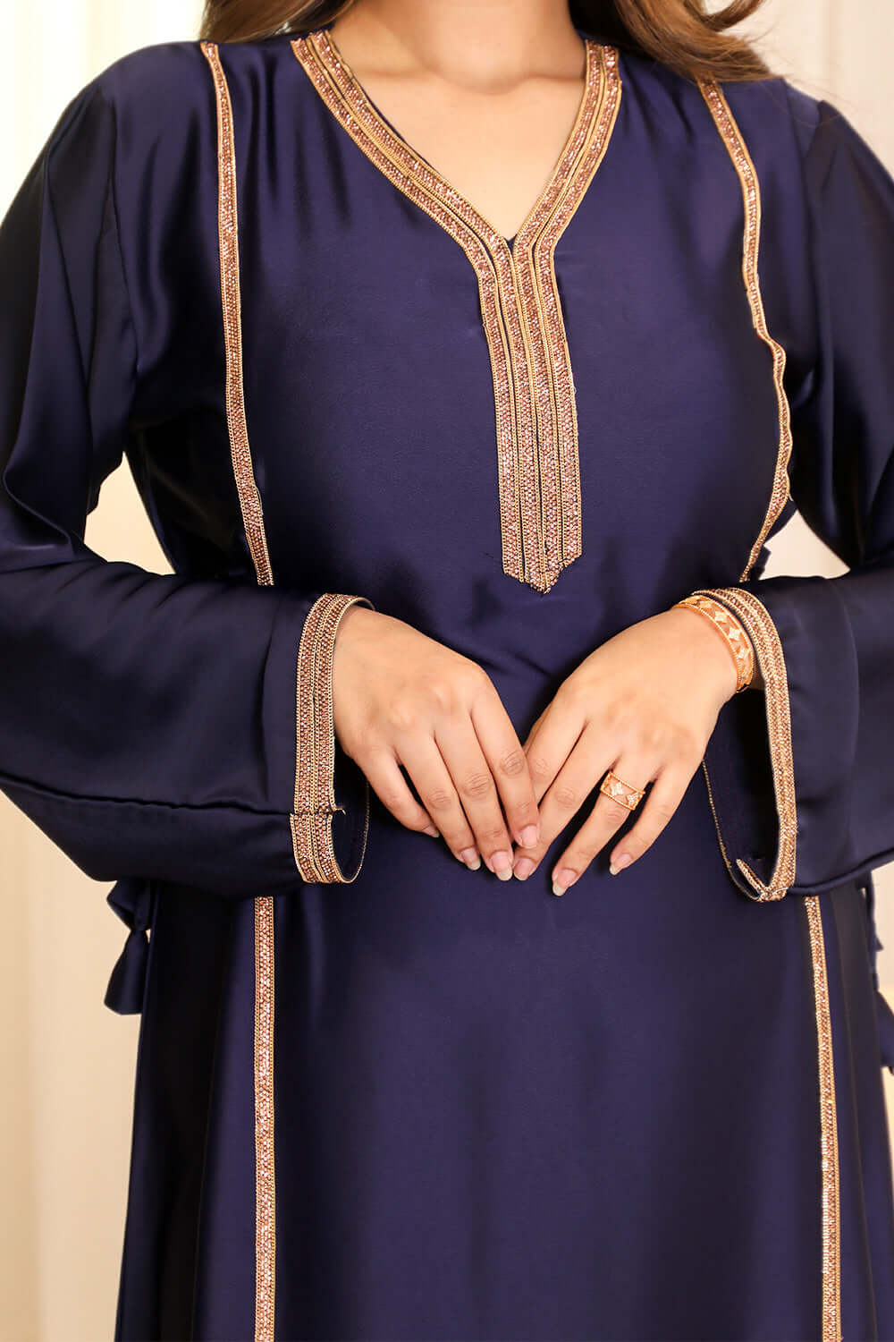 Design type A jalabiya with a tie on the sides decorated with golden stones Story type Maxi jalabiya with side ties and gold studs, long sleeves The occasion Occasions or public outings waist wide collar v sleeves long stretching Non-stretchable Material crepe Care instructions Machine wash and iron with steam at low temperature (40%) and hang dry.