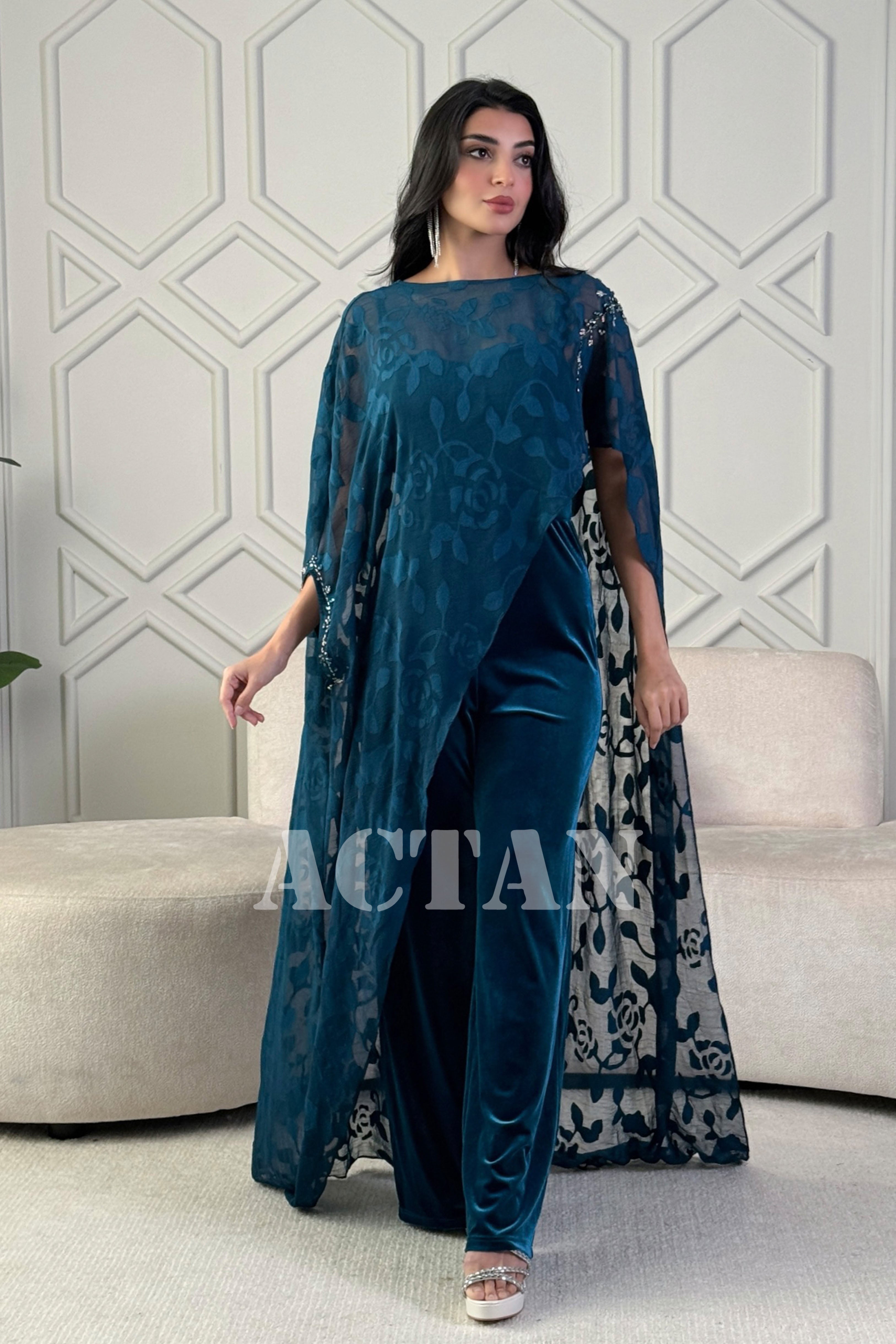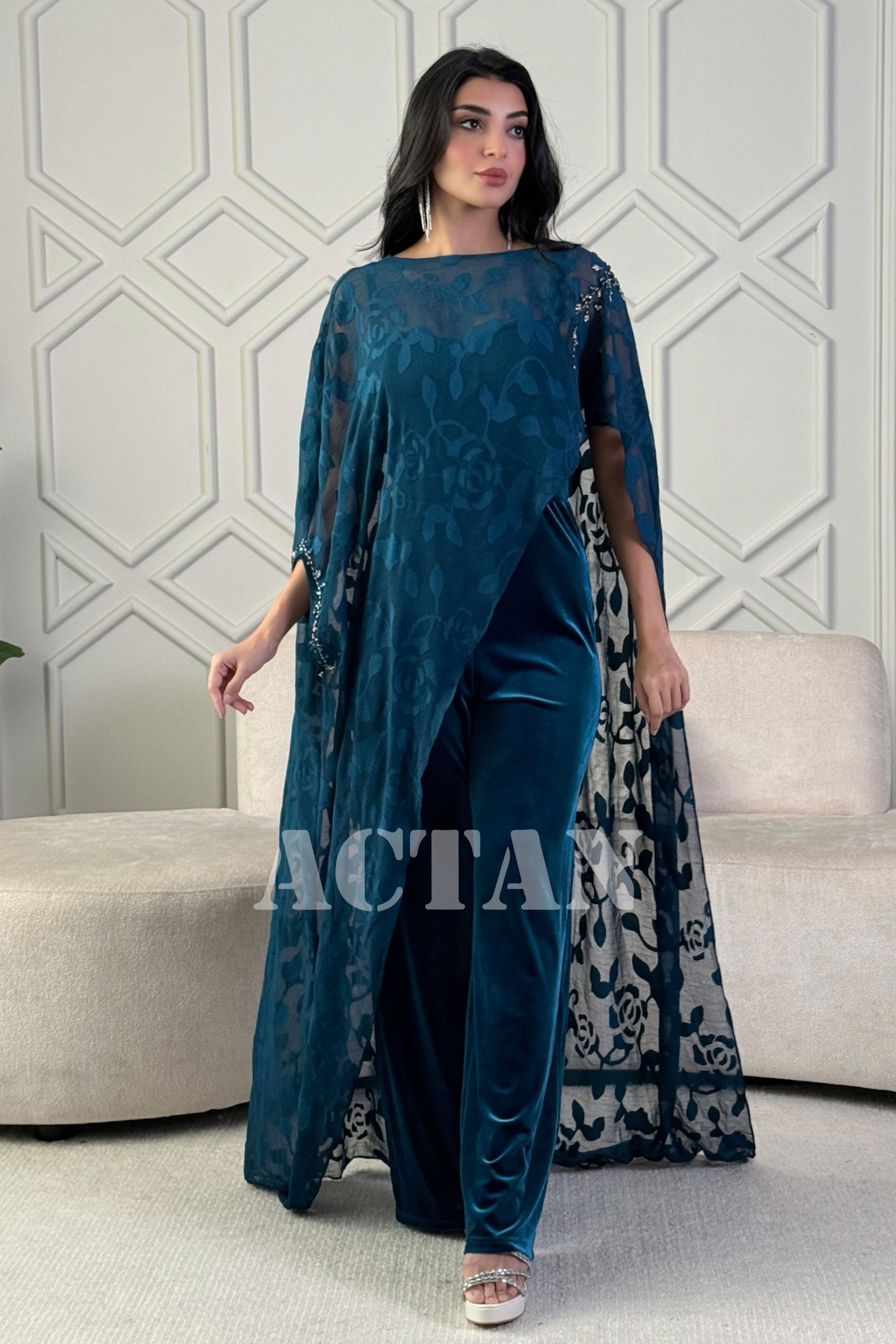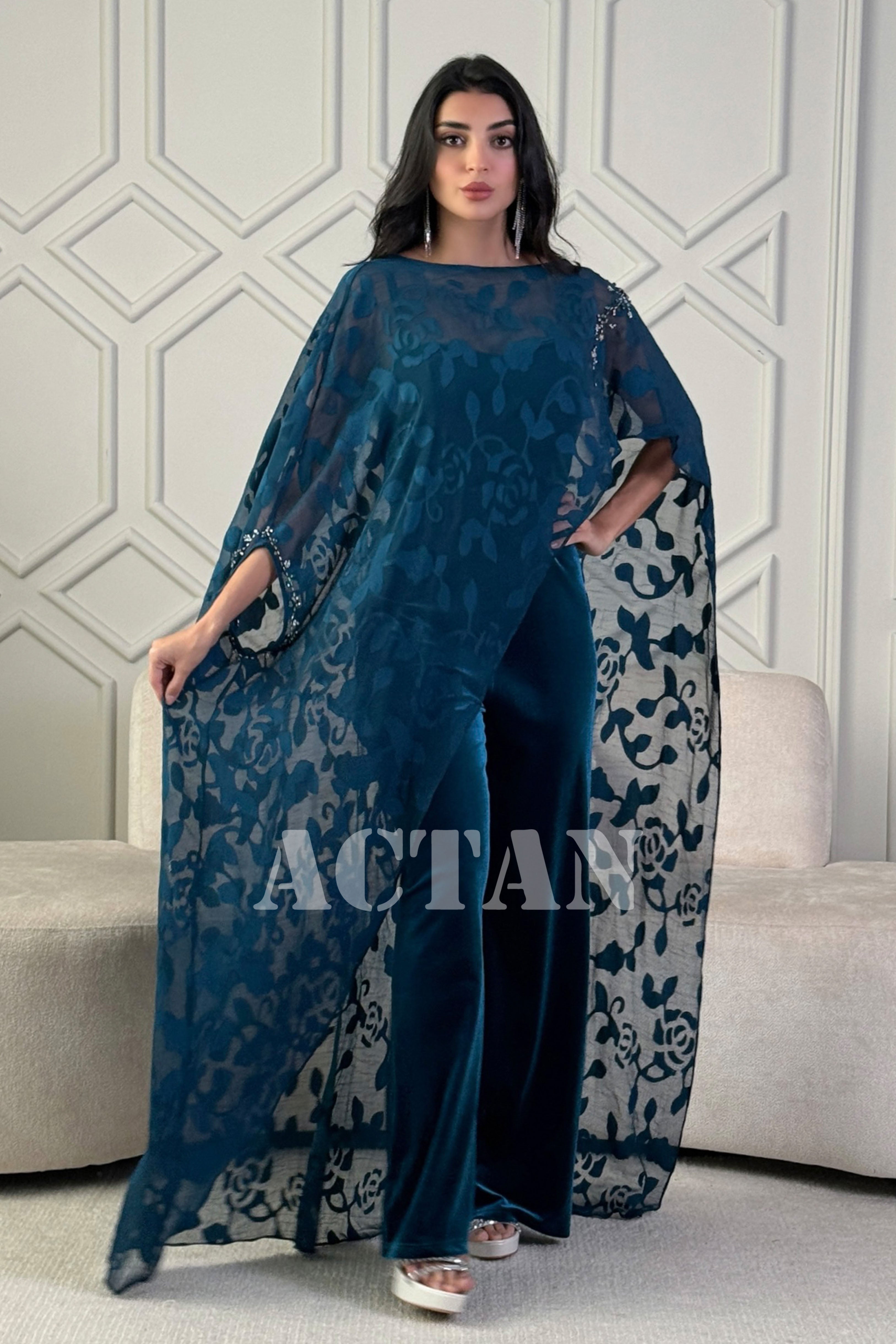 Design type Velvet jumpsuit with floral print scarf Story type Floral print embellished jumpsuit with a scarf The occasion Public outing or special occasions waist narrow collar Heart Story sleeves long stretching Expandable Material velvet Care instructions Wash and steam iron at low temperature 40 percent and hang dry