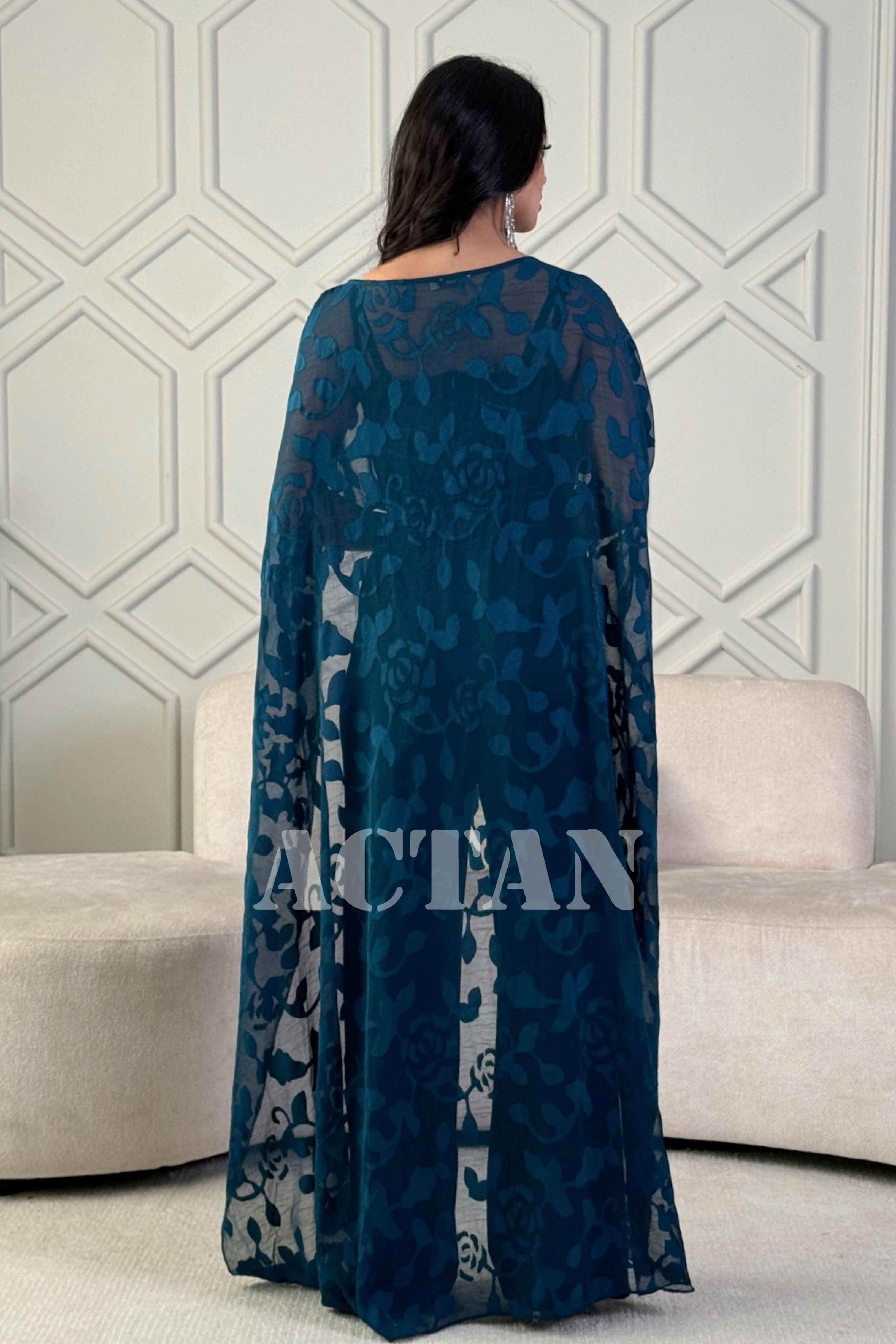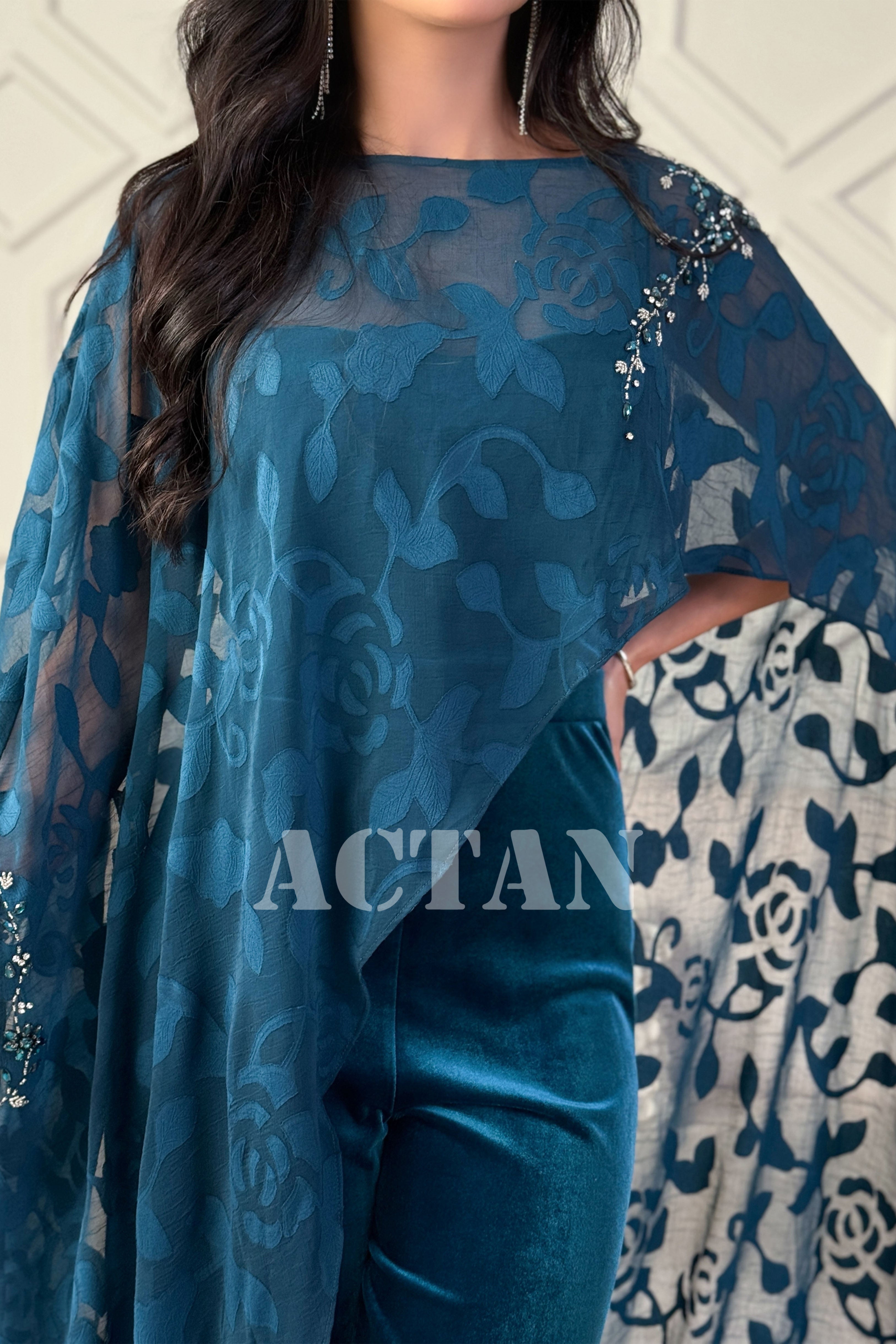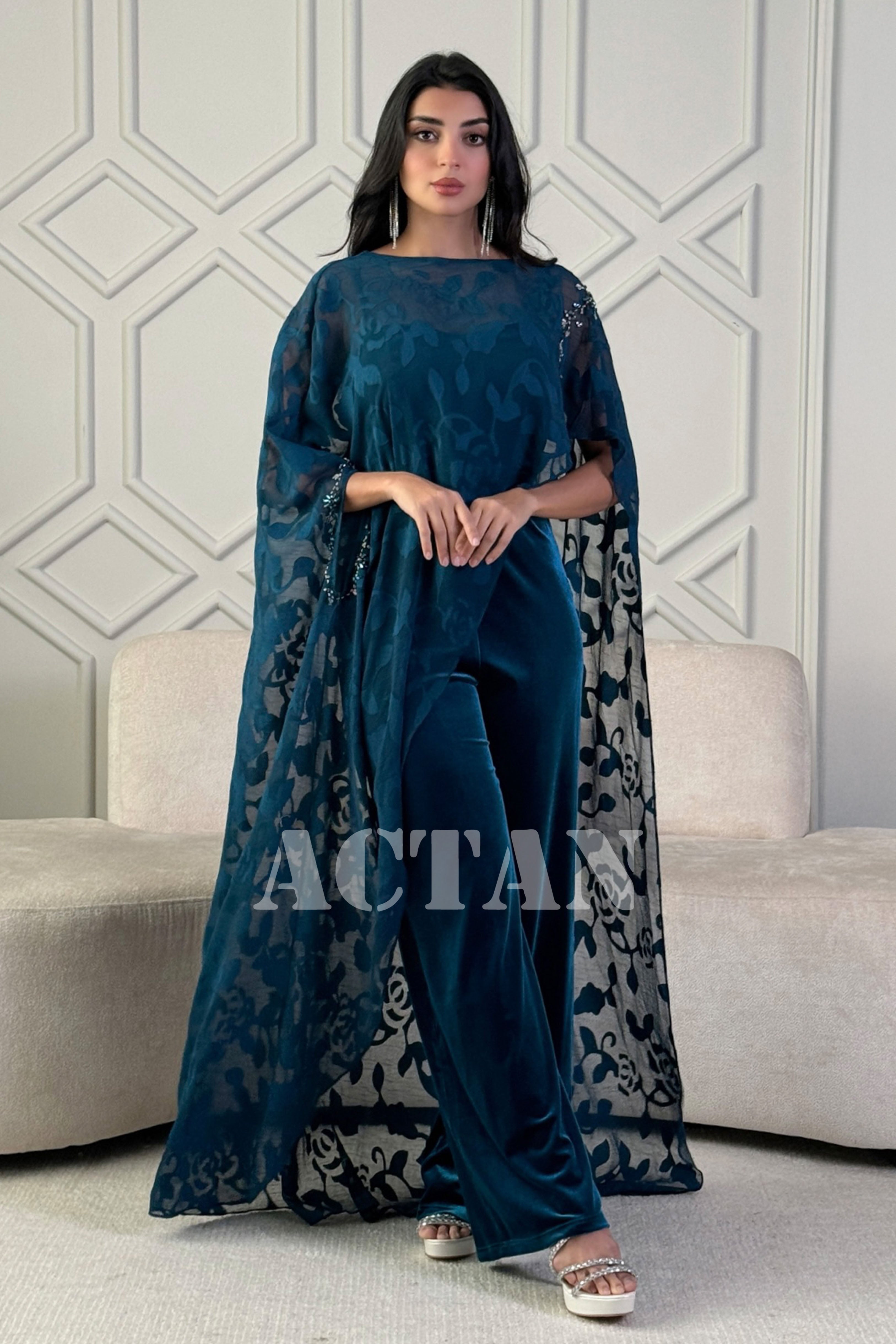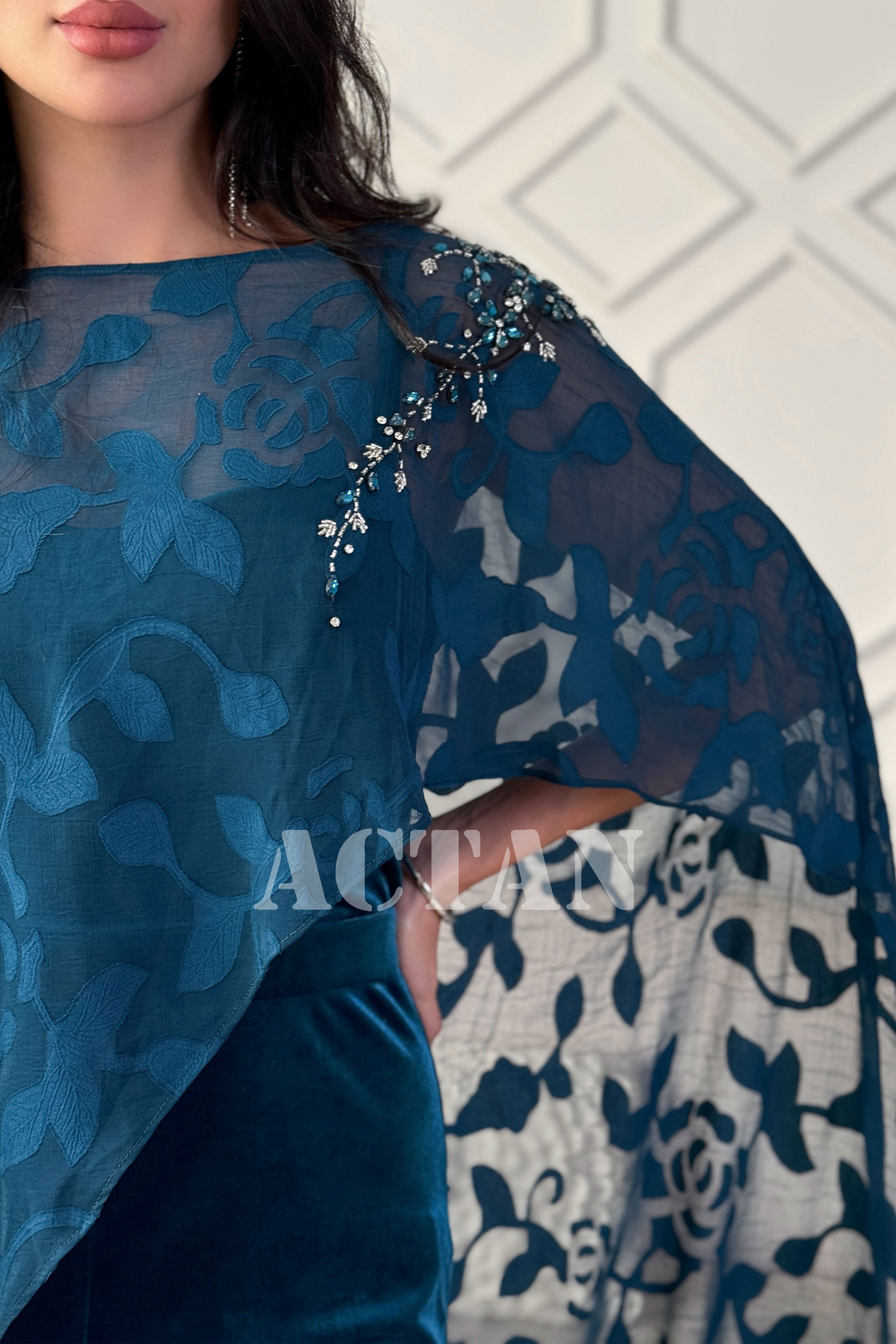 Design type Velvet jumpsuit with floral print scarf Story type Floral print embellished jumpsuit with a scarf The occasion Public outing or special occasions waist narrow collar Heart Story sleeves long stretching Expandable Material velvet Care instructions Wash and steam iron at low temperature 40 percent and hang dry