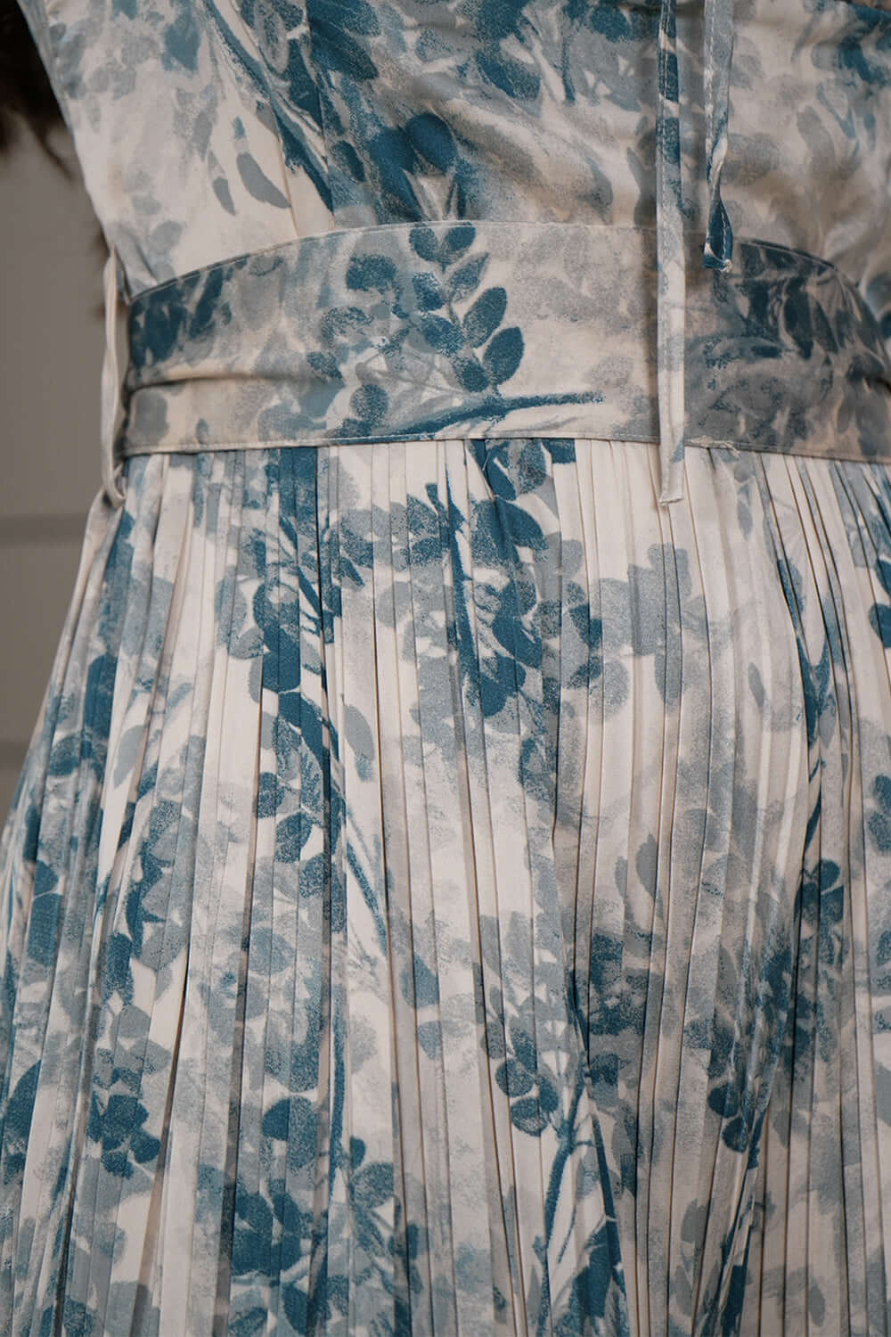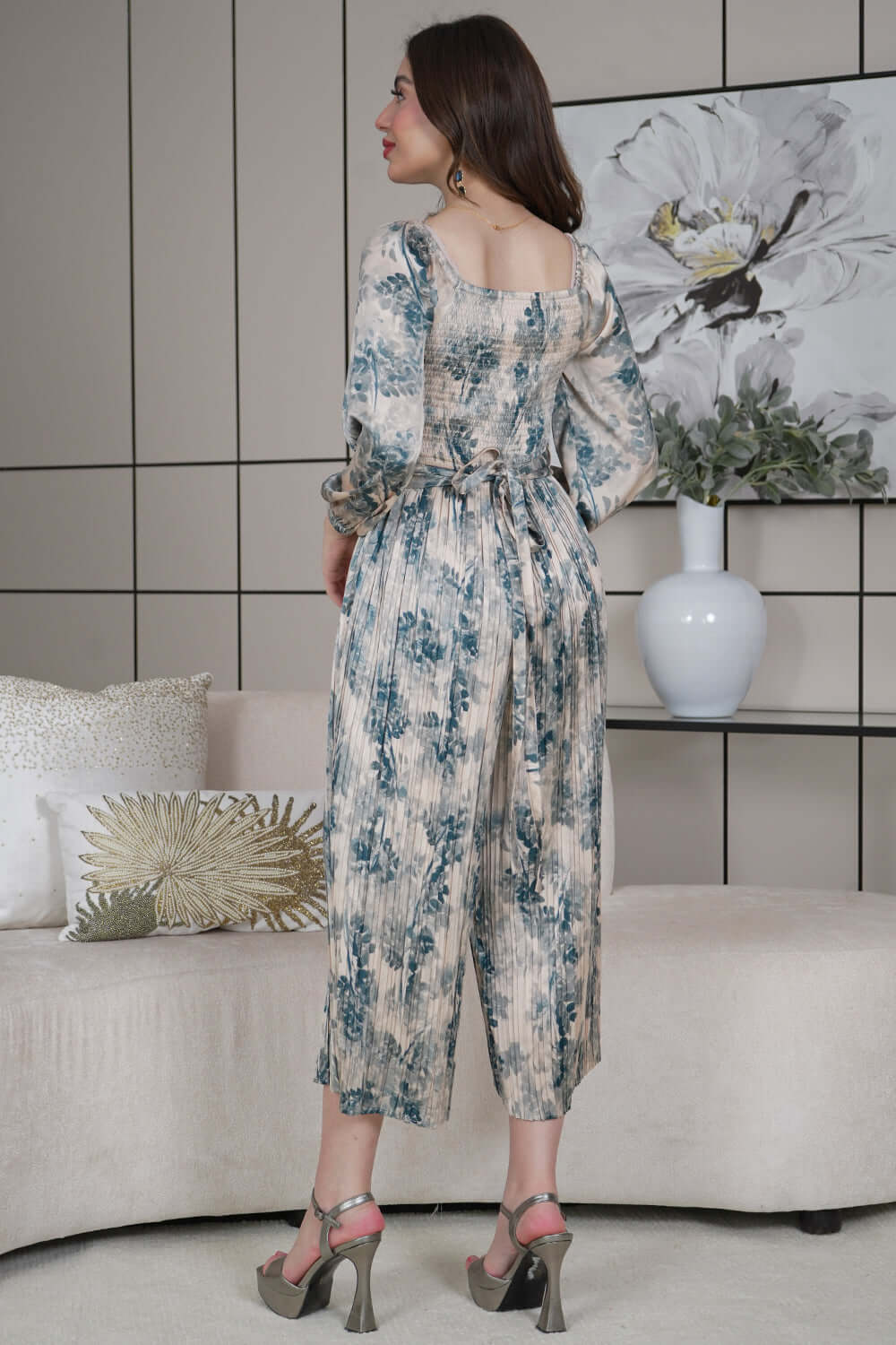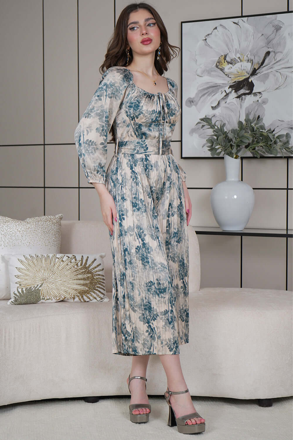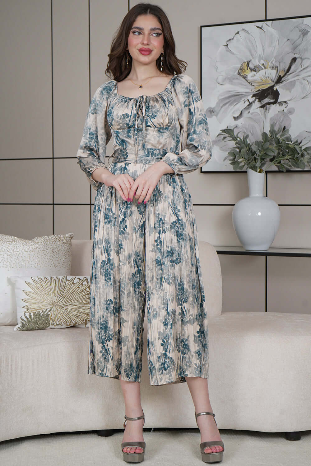 Design type Pleated midi jumpsuit Story type Pleated midi jumpsuit with tie waist, long sleeves and square neck The occasion Public outing or special occasions waist narrow collar square sleeves long stretching Non-stretchable Material satin Add-ons With a tie Care instructions Machine wash and iron with steam at low temperature (40%) and hang dry.