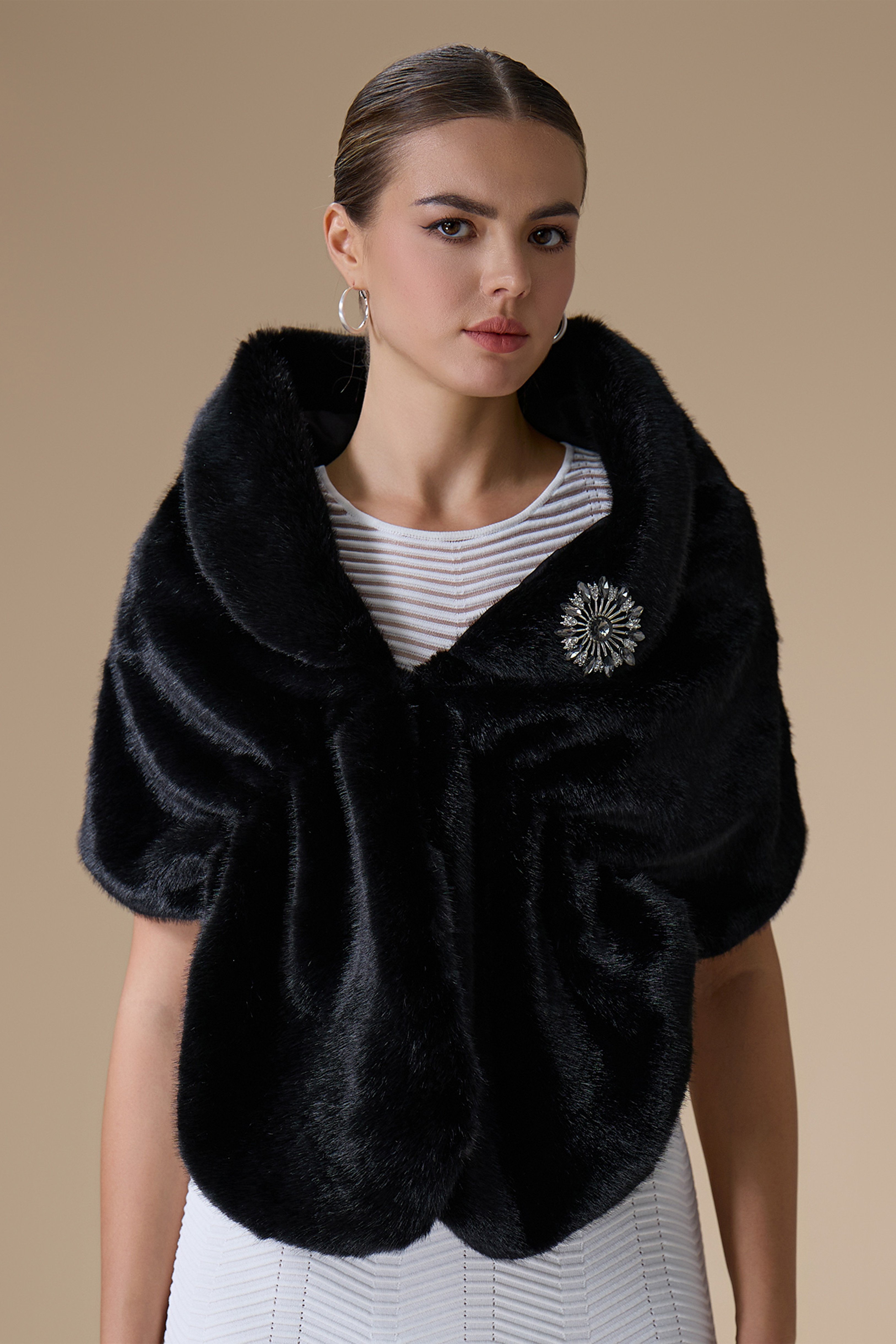 - نوع القصة: شال فرو فاخر بلون أسود مزين ببروش معدني