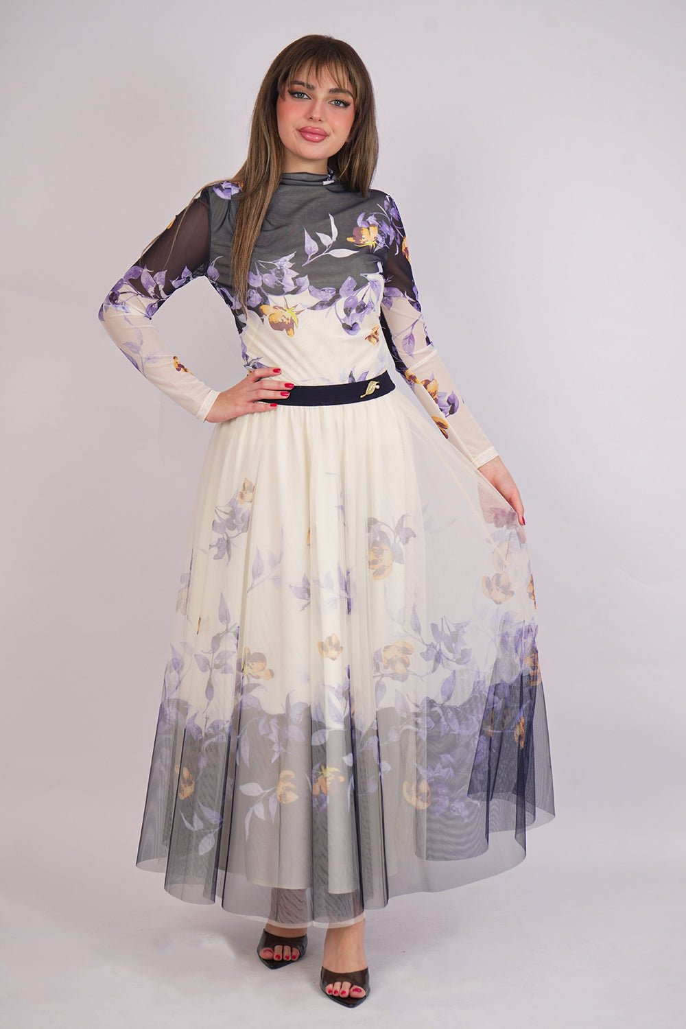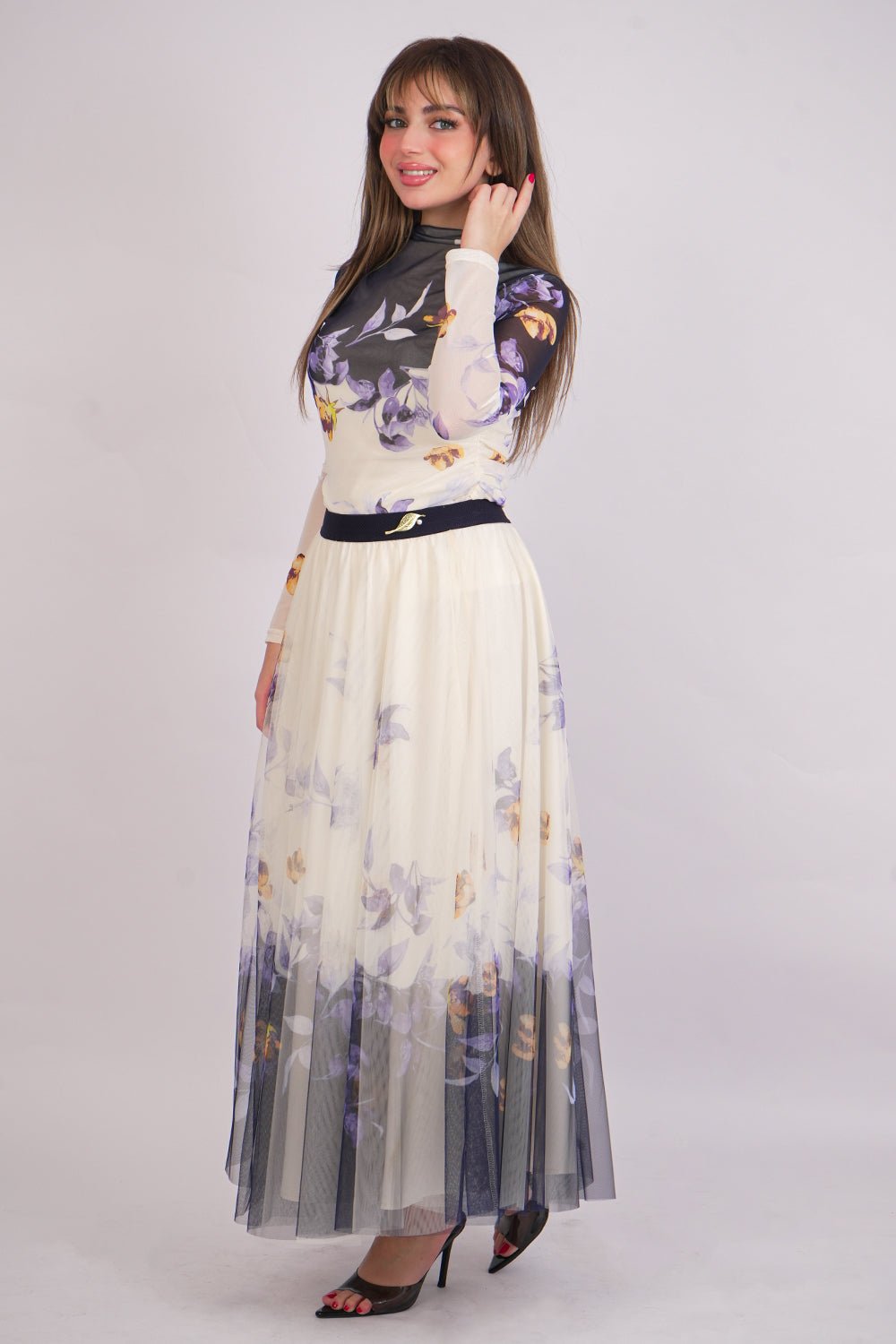 Design type Floral Print Tulle Skirt and Blouse Set Story type Floral Print Tulle Skirt and Blouse Set with Brooch The occasion Public outing or special occasions waist narrow collar Circular sleeves long stretching Expandable Material Tull Care instructions Machine wash and iron with steam at low temperature (40%) and hang dry.