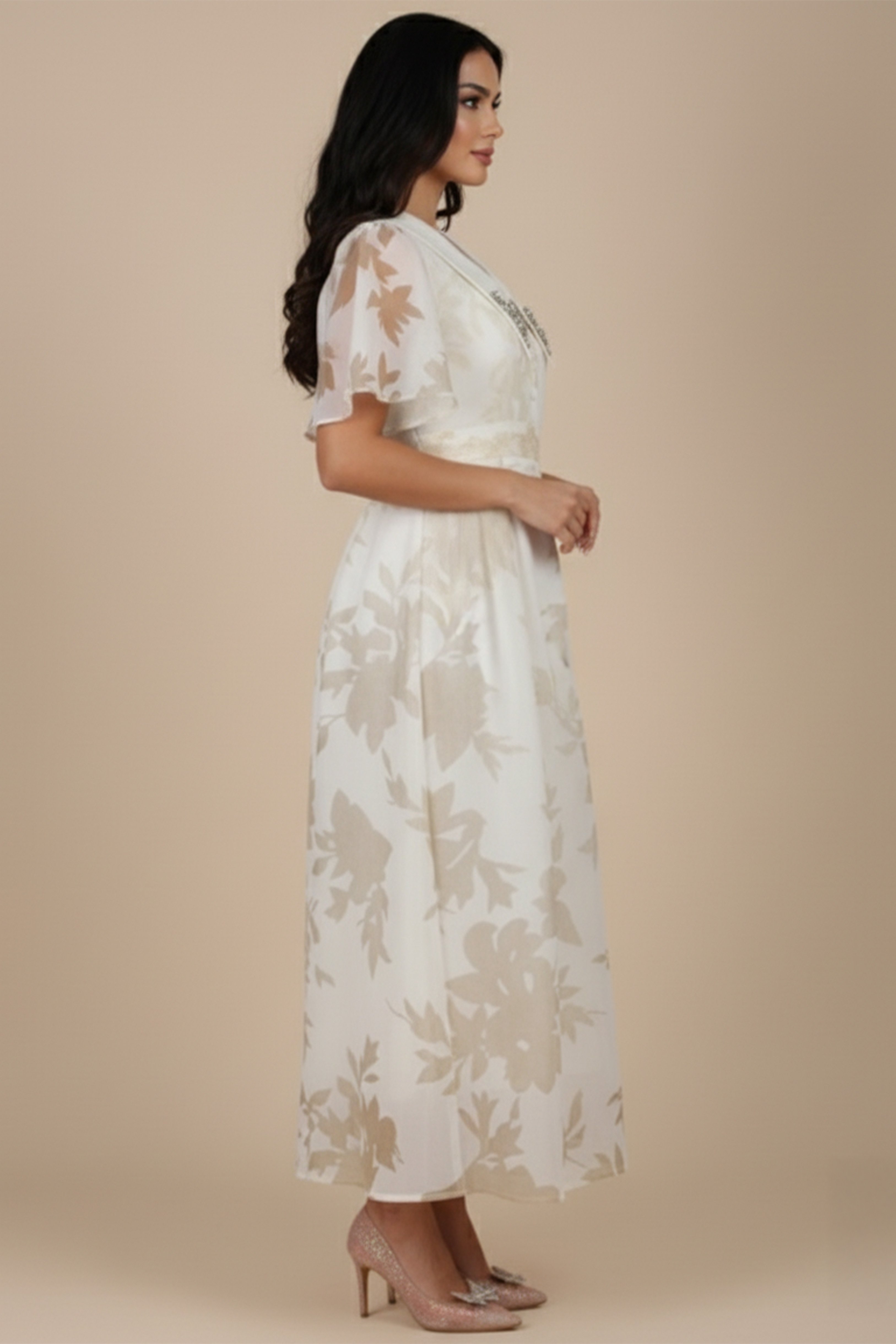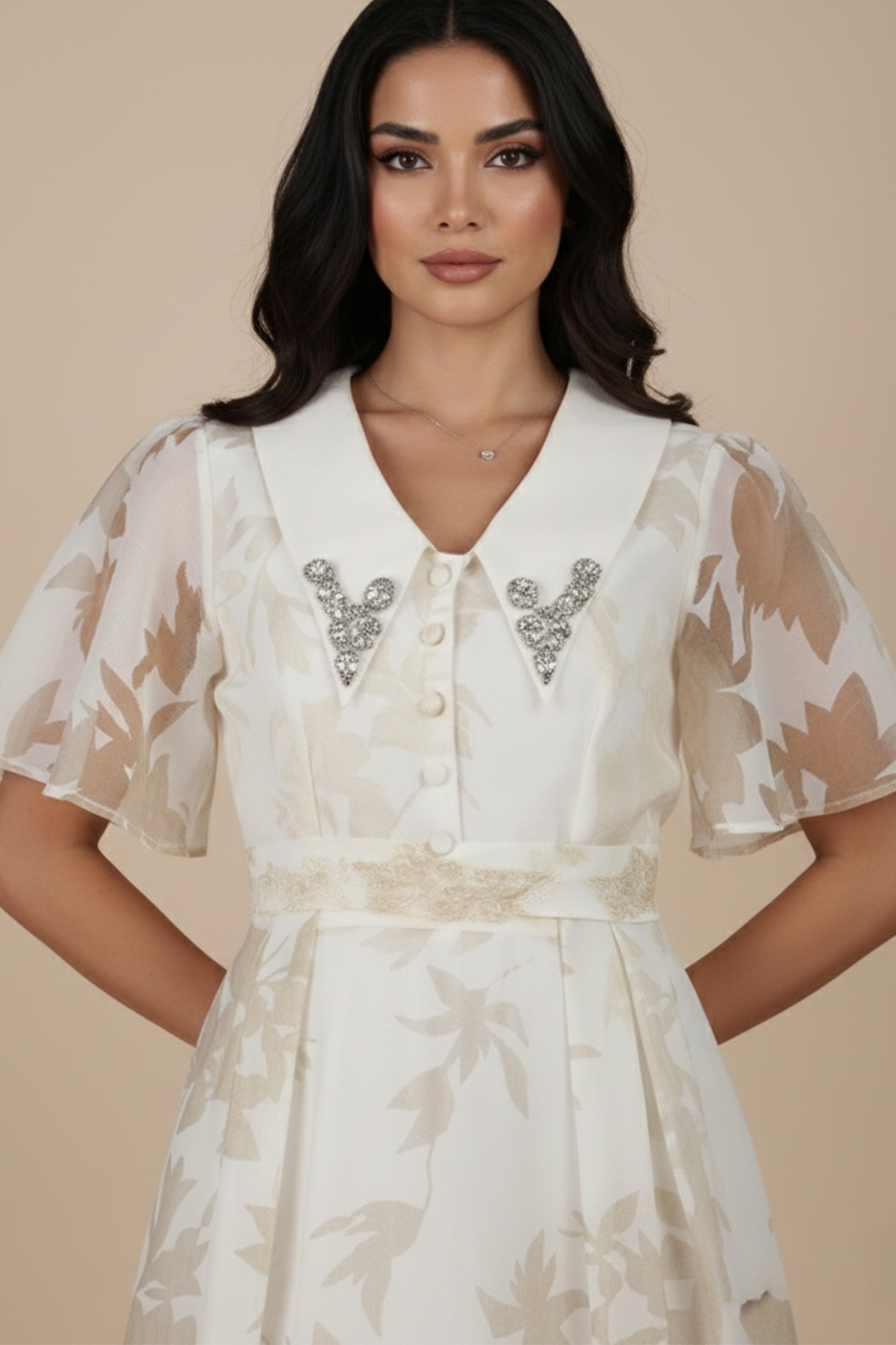 الخامة اورغنزا نوع التصميم فستان ميدي اورجنزا بياقه كرستال نوع القصة ميدي كلوش بزم عالخصر واكمام بف كلوش وياقه مطرزه بالخرز والكريستال المناسبة خروج حفله او سهره الخصر زم بحزام الياقة مطرزه بالخرز والكرستال الاكمام بف منفوش التمدد غير قابل لتمدد الاضافات تطريز عالياقه ارشادات العناية قابل للغسيل والكي بدرجة حراره منخفضه <!-- -->