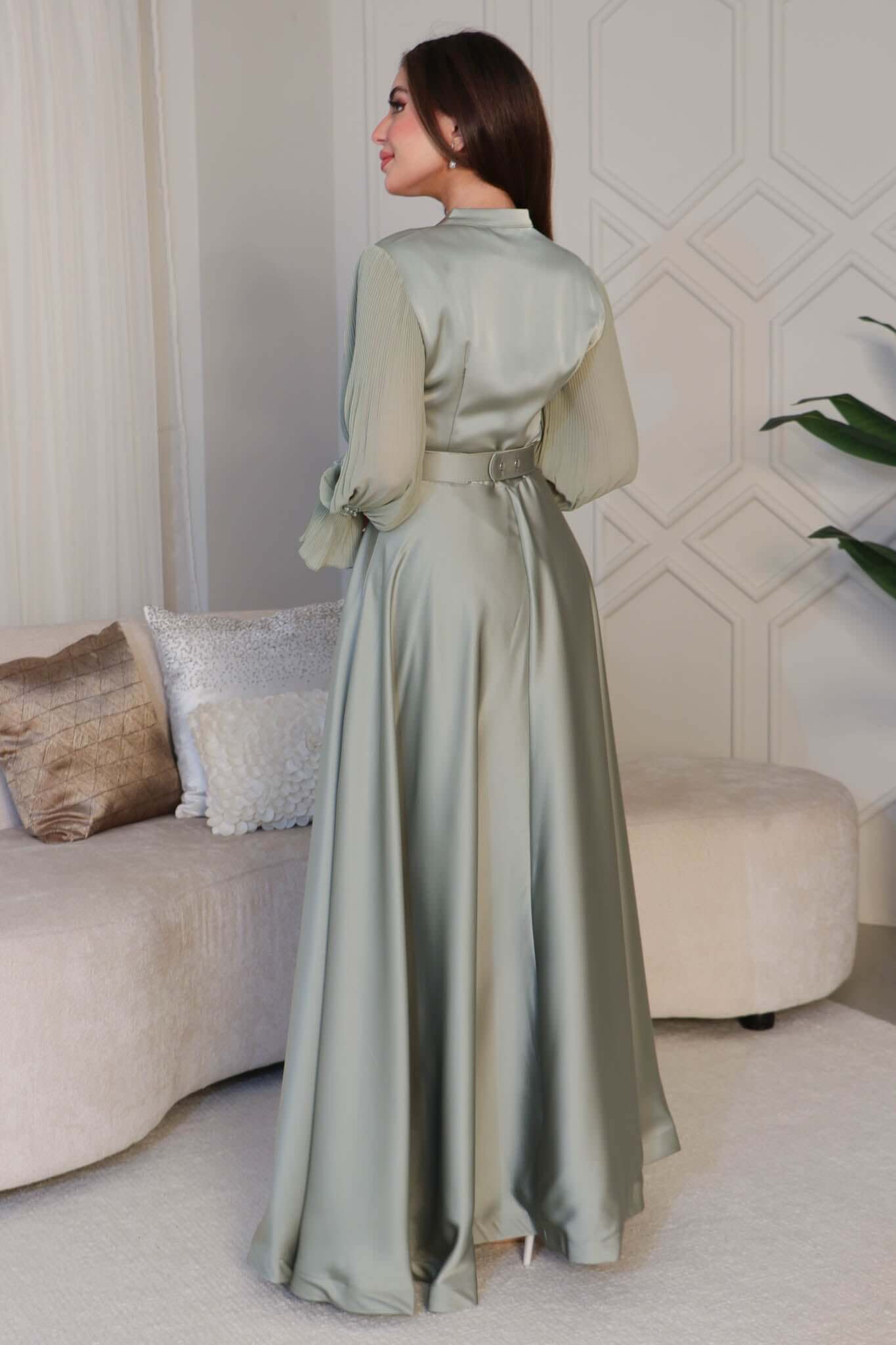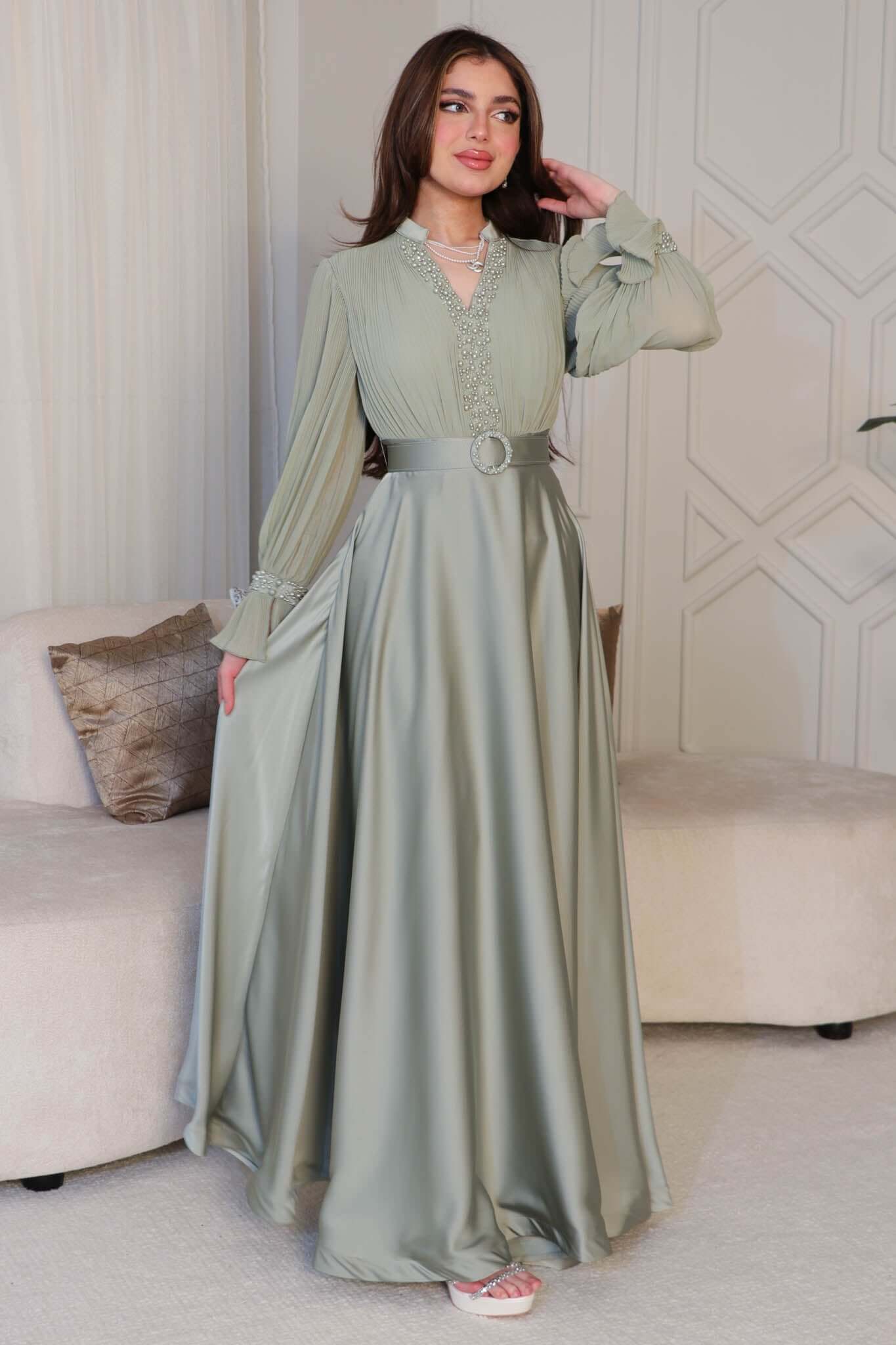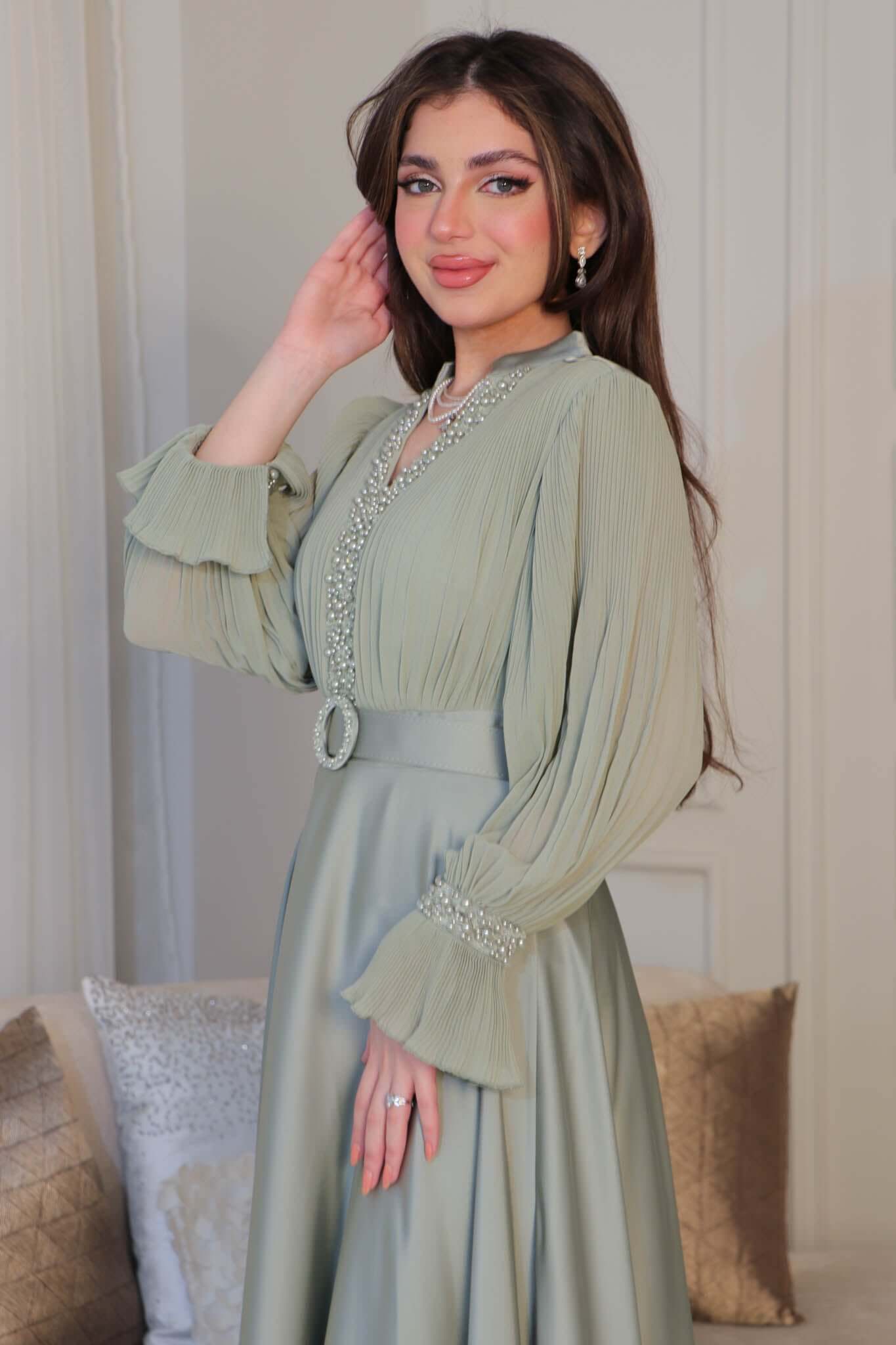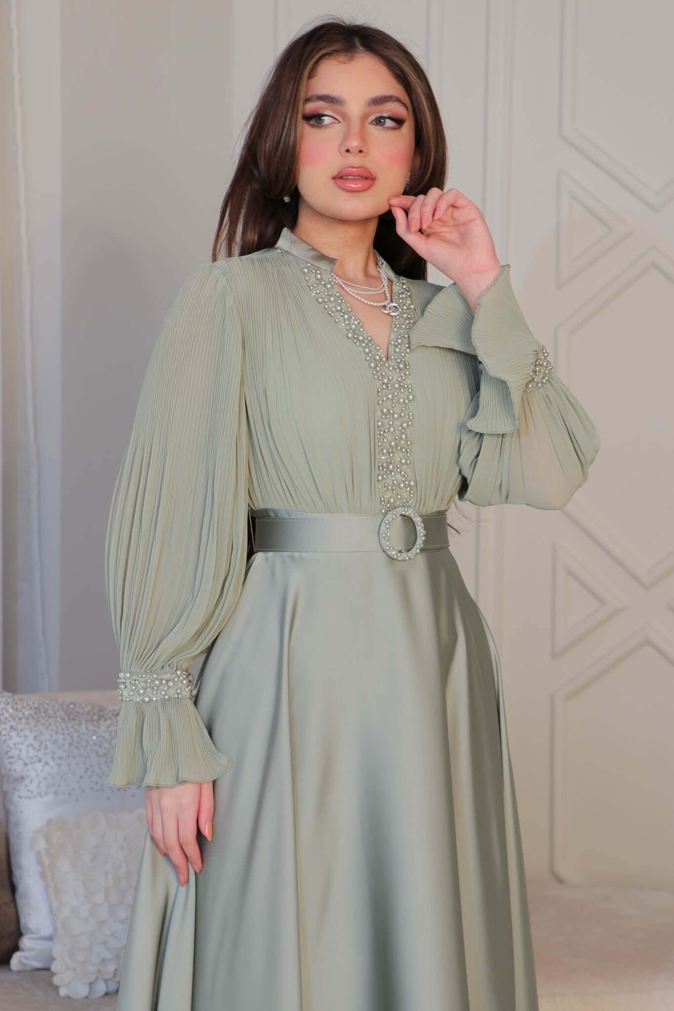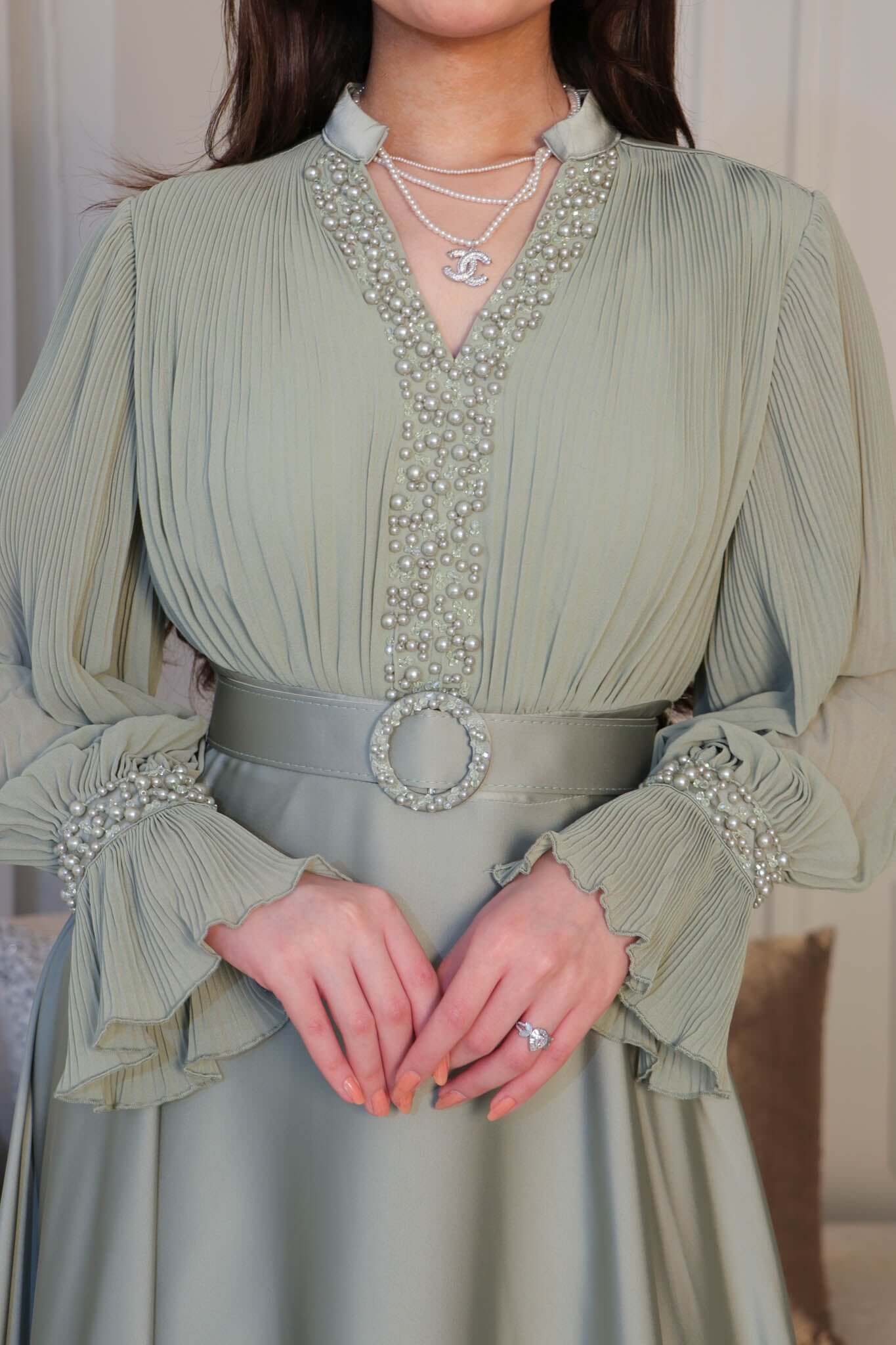 Design type Pearl-embellished pleated maxi dress Story type Pearl-embellished pleated maxi dress with belt The occasion General exit waist narrow collar v sleeves long stretching Non-stretchable Material satin Add-ons belt Care instructions Wash and steam iron at low temperature 40 percent and hang dry <!-- -->