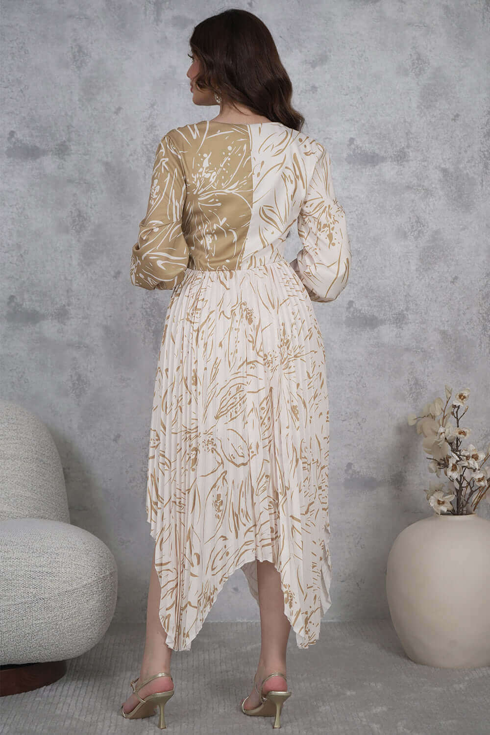 Design type Elegant pleated dress with a cinched waist Story type Elegant pleated asymmetrical dress with a cinched waist and long sleeves The occasion Occasions or public outings waist narrow collar v sleeves long stretching Non-stretchable Material Satin crepe Care instructions Machine wash and iron with steam at low temperature (40%) and hang dry.