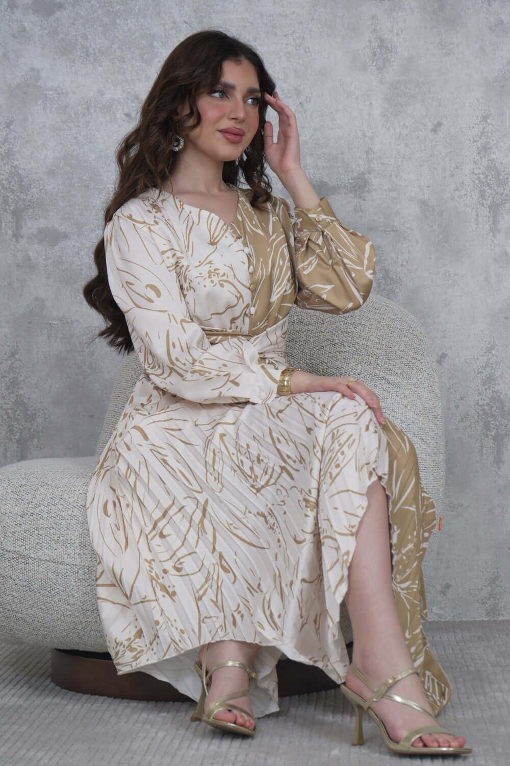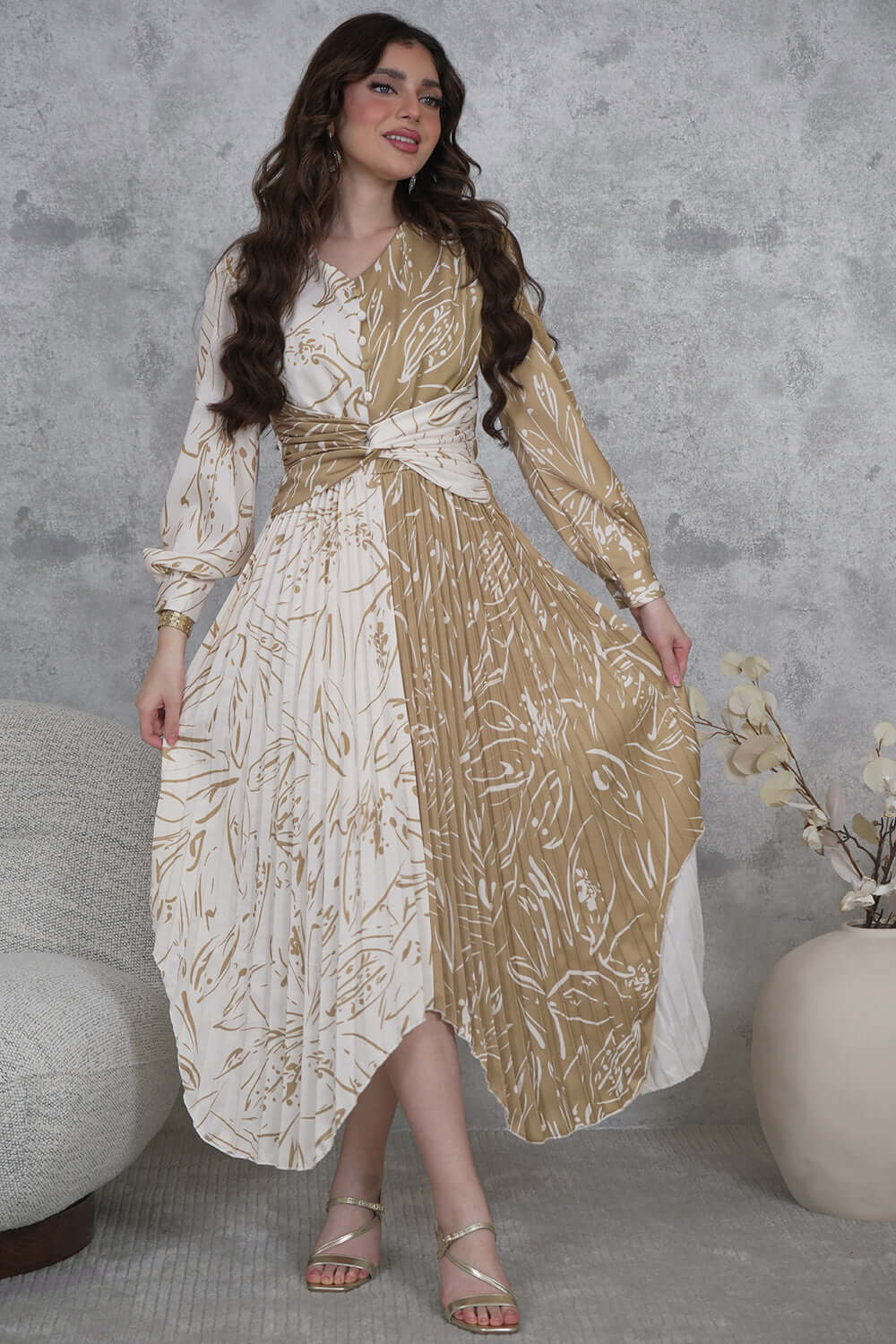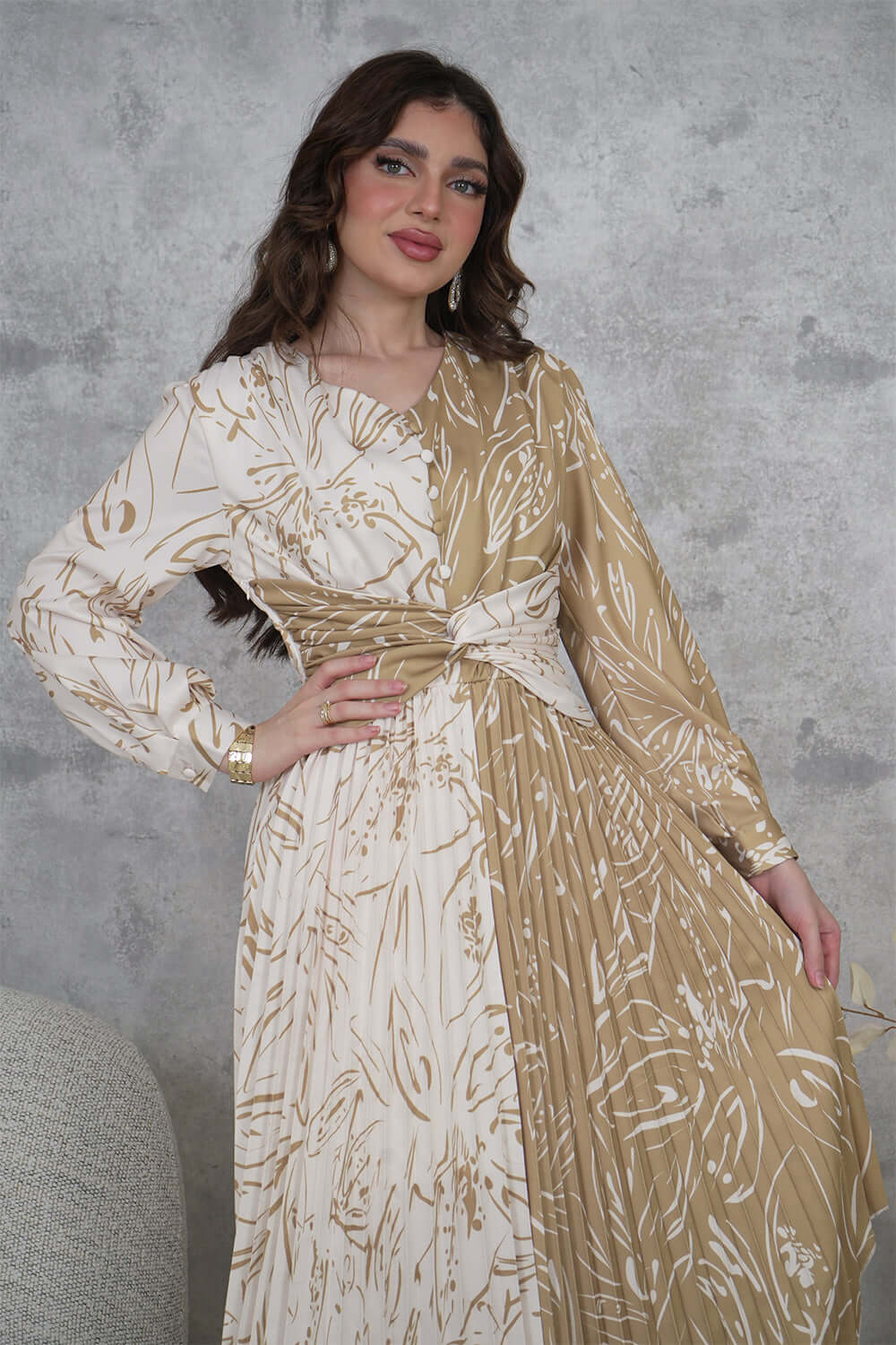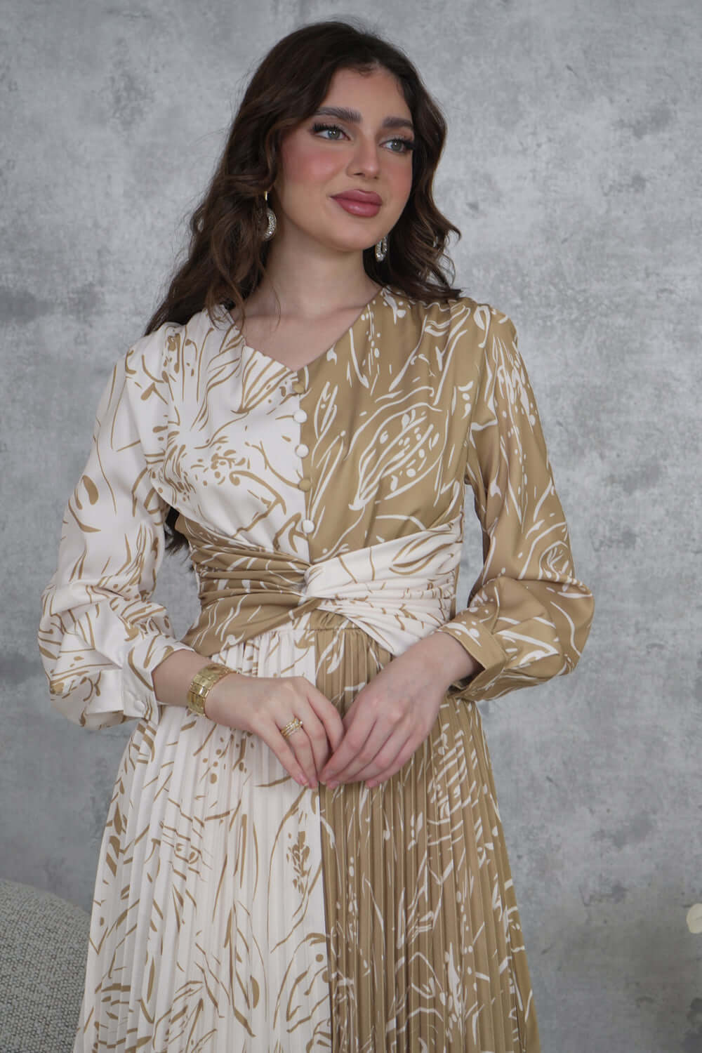 : فستان أنيق بليسيه غير متماثل الطول واللون بزم عالخصر وأكمام طويلة