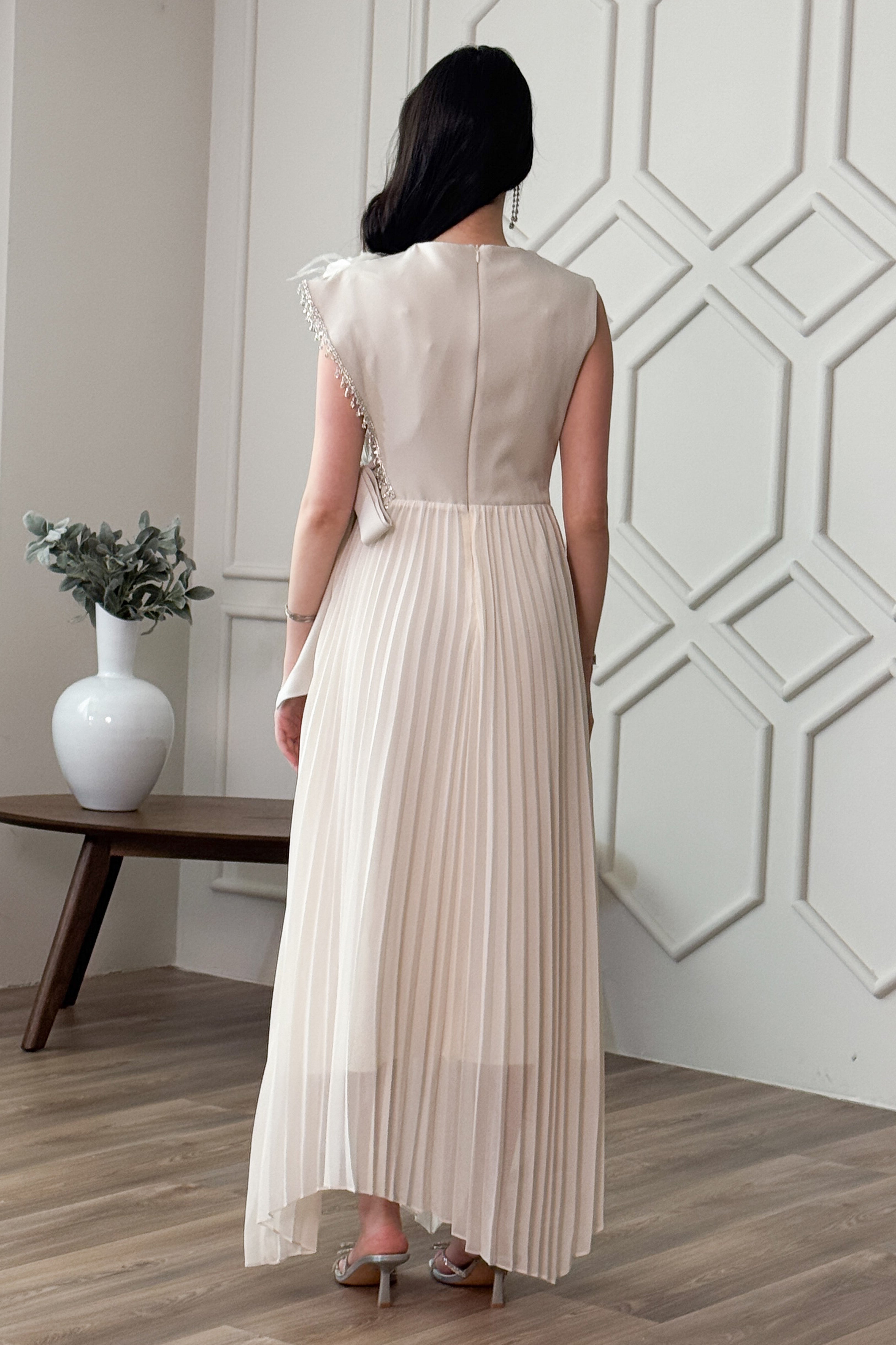 Design type pleated dress with a tie at the waist Story type Pleated dress with a tie at the waist, decorated with a brooch and crystal ribbon The occasion Public outing or special occasions waist narrow collar Circular sleeves stretching Non-stretchable Material crepe Care instructions Machine wash and iron with steam at low temperature (40%) and hang dry.