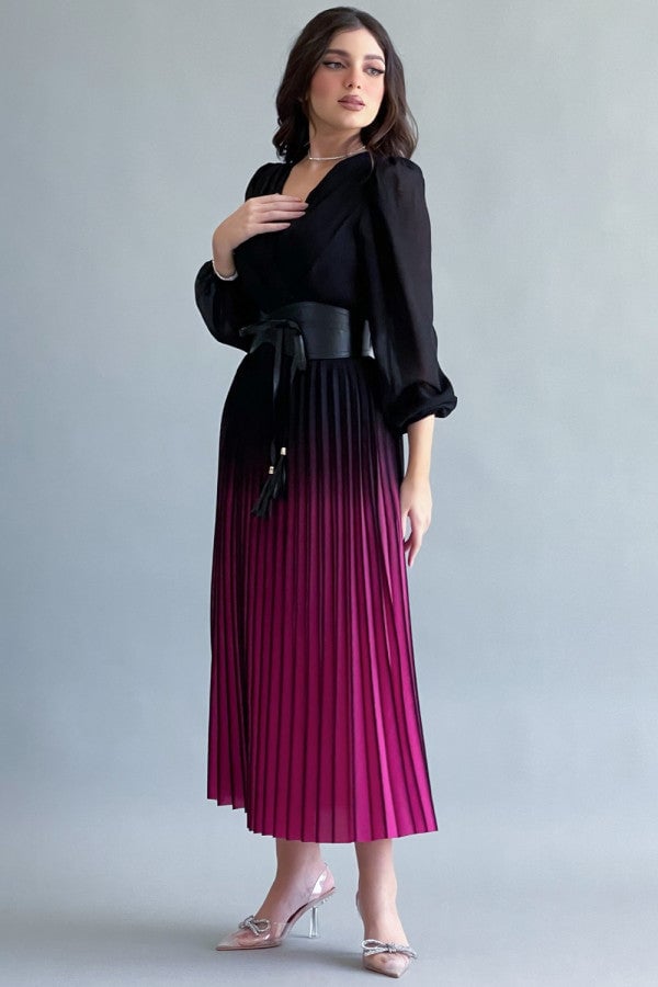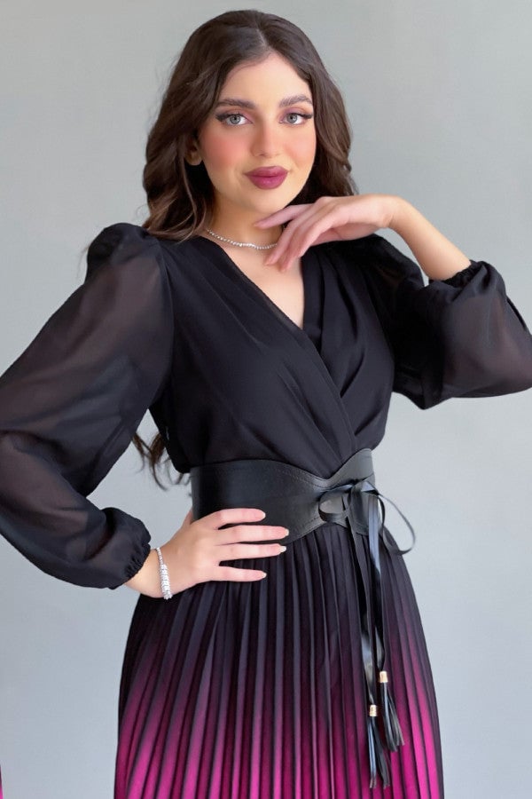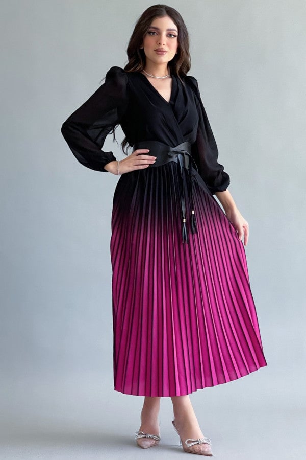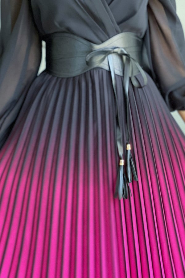 Fuchsia pleated wavy dress with belt