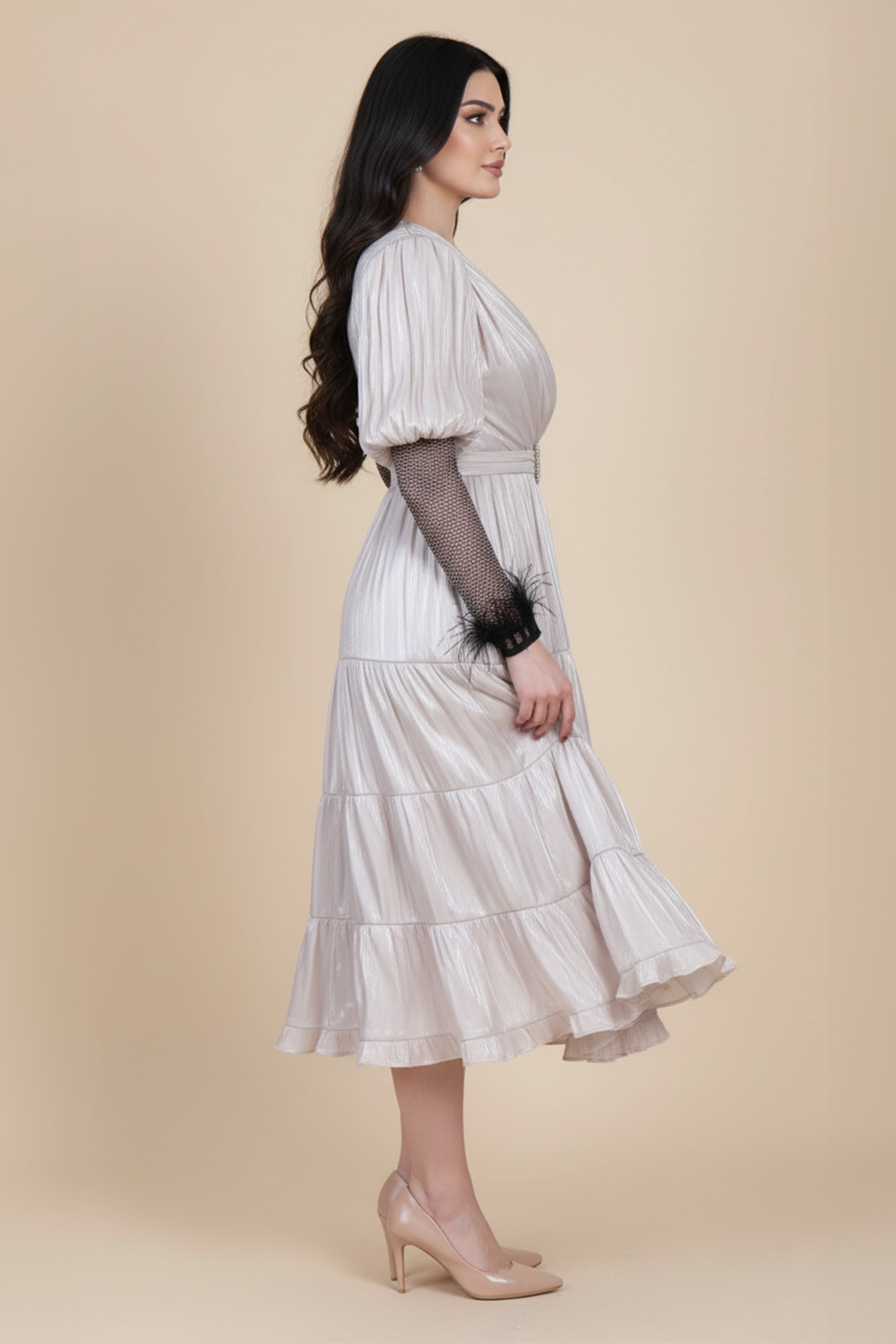 Design type Midi dress with separate mesh insert Story type Feather-embellished mesh split midi dress with belt The occasion Public outing or special occasions waist narrow collar V sleeves long stretching Non-stretchable Material metallic Add-ons belt Care instructions Machine wash and iron with steam at low temperature (40%) and hang dry.