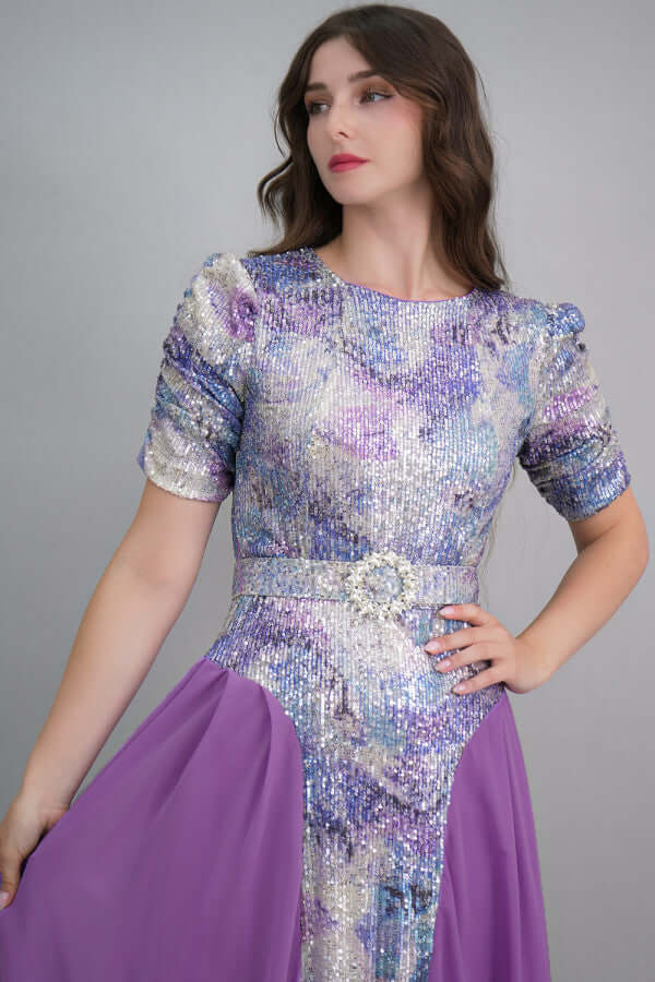 Material sequins Design type Wavy sequin dress with pleats Story type Long with pleated design on the sides, round neck, short sleeves and a belt at the waist occasion Night out waist tight belt collar Circular sleeves Short stretching Non-stretchable Add-ons belt Care instructions Wash and iron with steam at a low temperature of 40