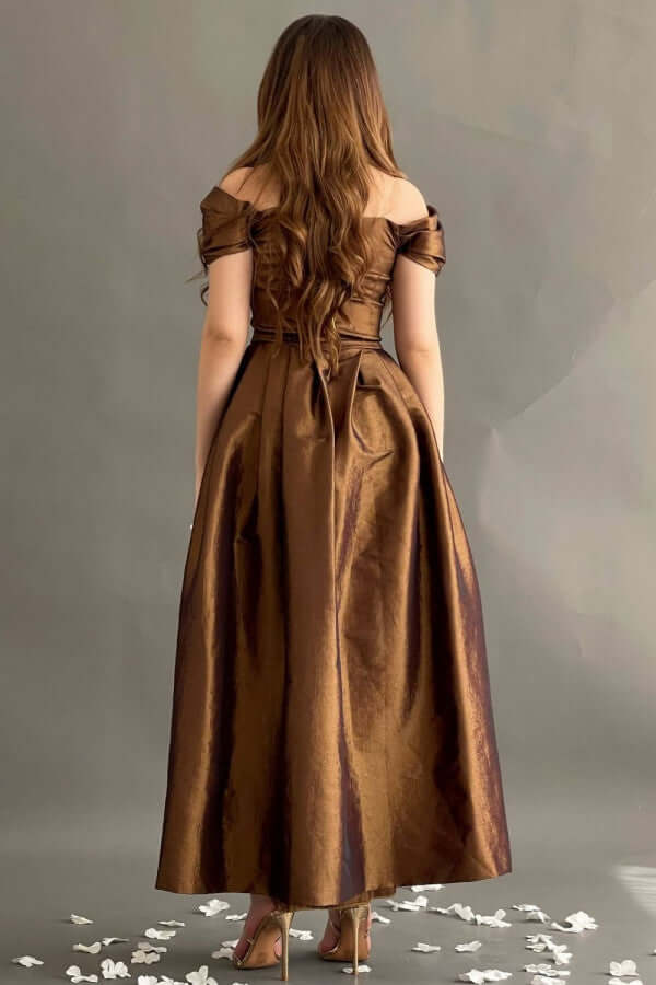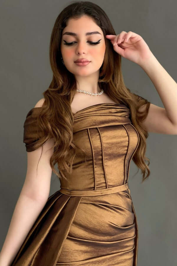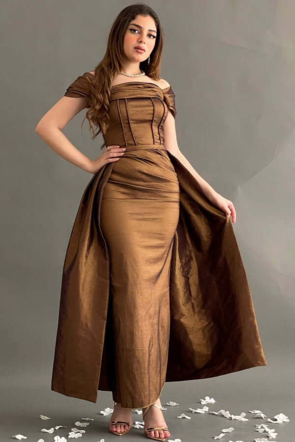 - نوع القصة: فستان طويل بقصة ضيقة، صدر كروسيه مع درابيه، وياقة توب، وأكمام أوف شولدر بذيل خلفي