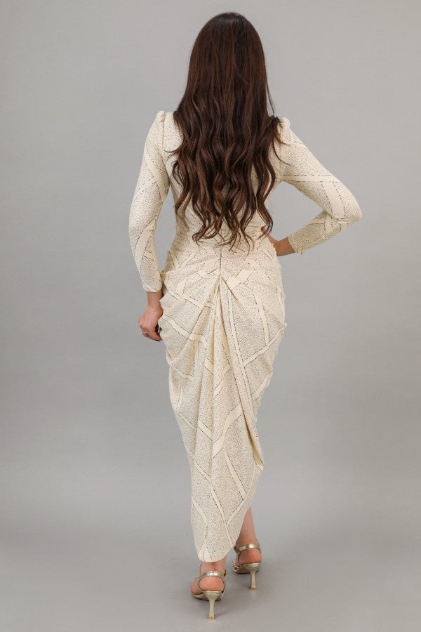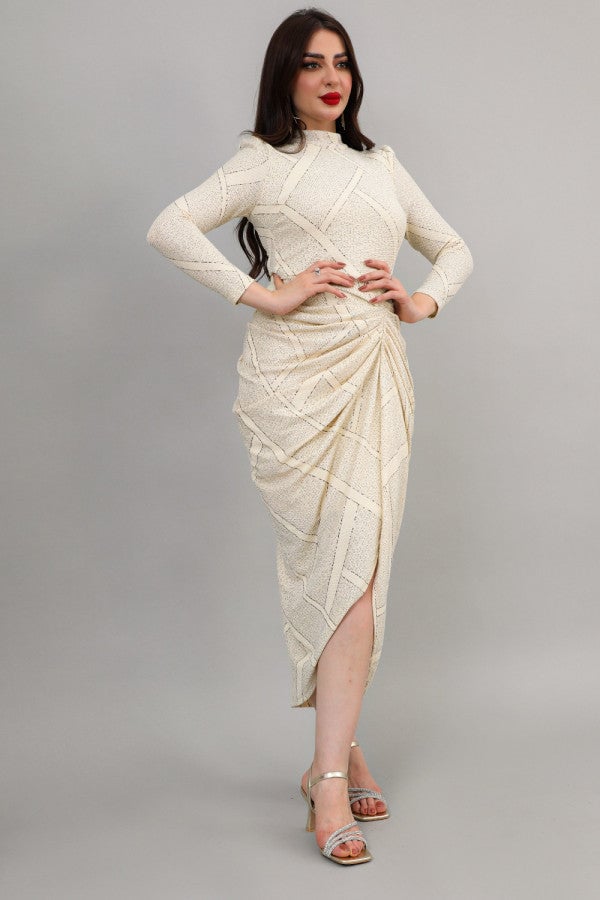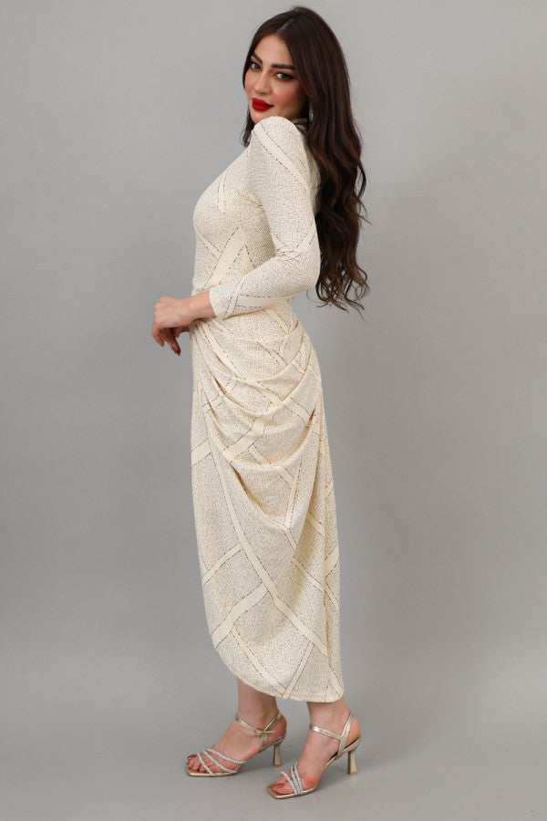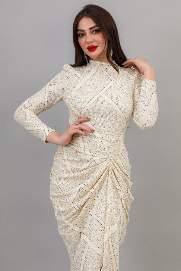 الخامة بوليستر مع نسبة سباندكس نوع التصميم فستان جورسيه بطيات وفتحه نوع القصة ميدي بطيات وفتحه من الجنب بكم طويل وياقه عاليه المناسبة خروج سهره او عام الخصر ضيق الياقة عاليه الاكمام طويله التمدد متوسط التمدد ارشادات العناية يغسل ويكوى بالبخار بدرجة حراره منخفضه 40 طول المودل
