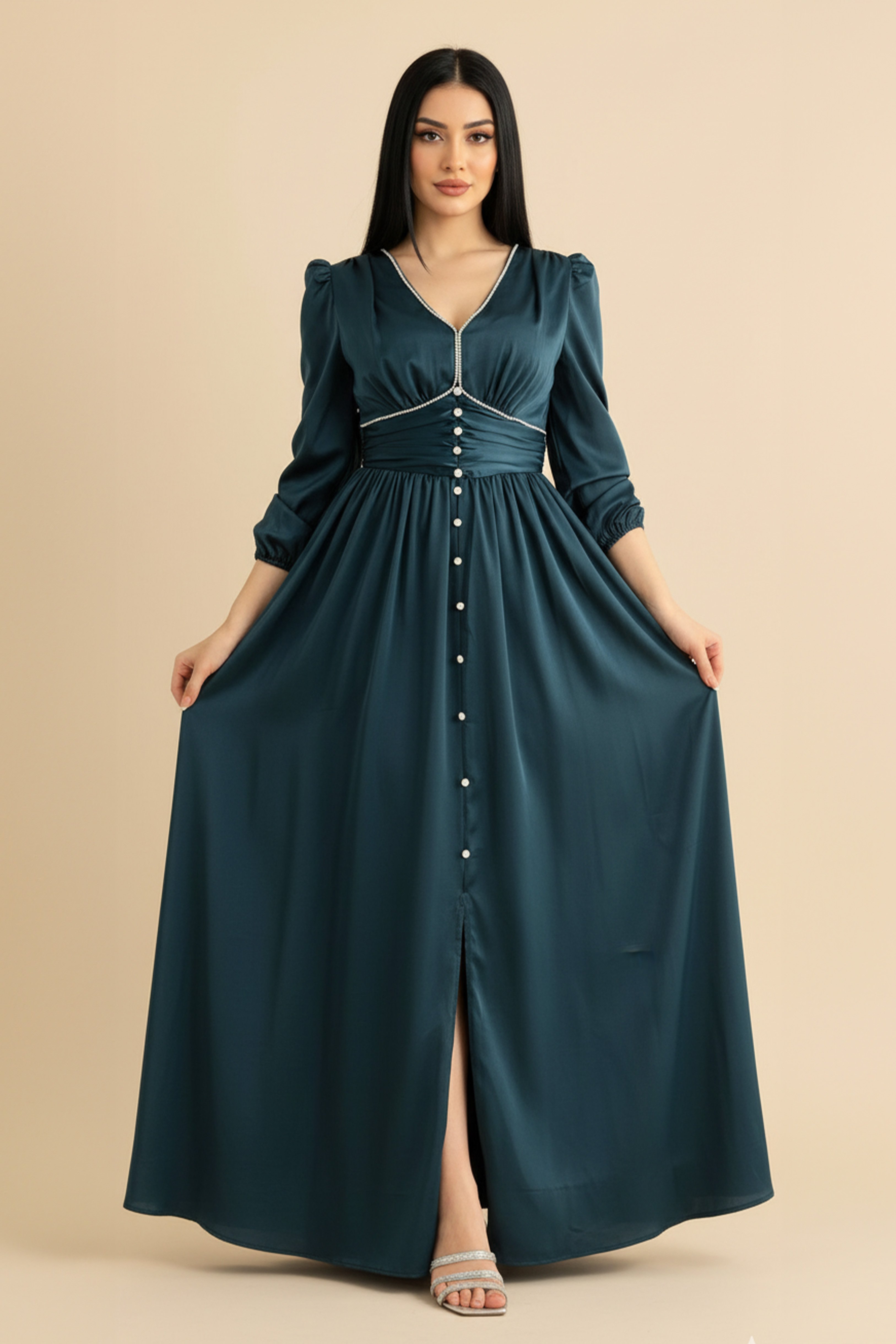 Petrol color crystal-embellished satin silk dress