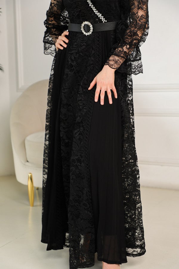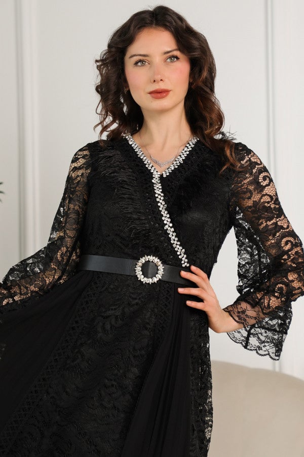 Material lace Design type Lace cloche dress embellished with crystals and feathers Story type Long, fitted, chiffon, V-neck, wrap, long ruffle sleeves, embellished with crystals and feathers, with a belt at the waist occasion Public outing, parties or special occasions waist Zim with a belt collar v sleeves Long stretching Non-stretchable Add-ons belt Care instructions Wash and iron with steam at a low temperature of 40