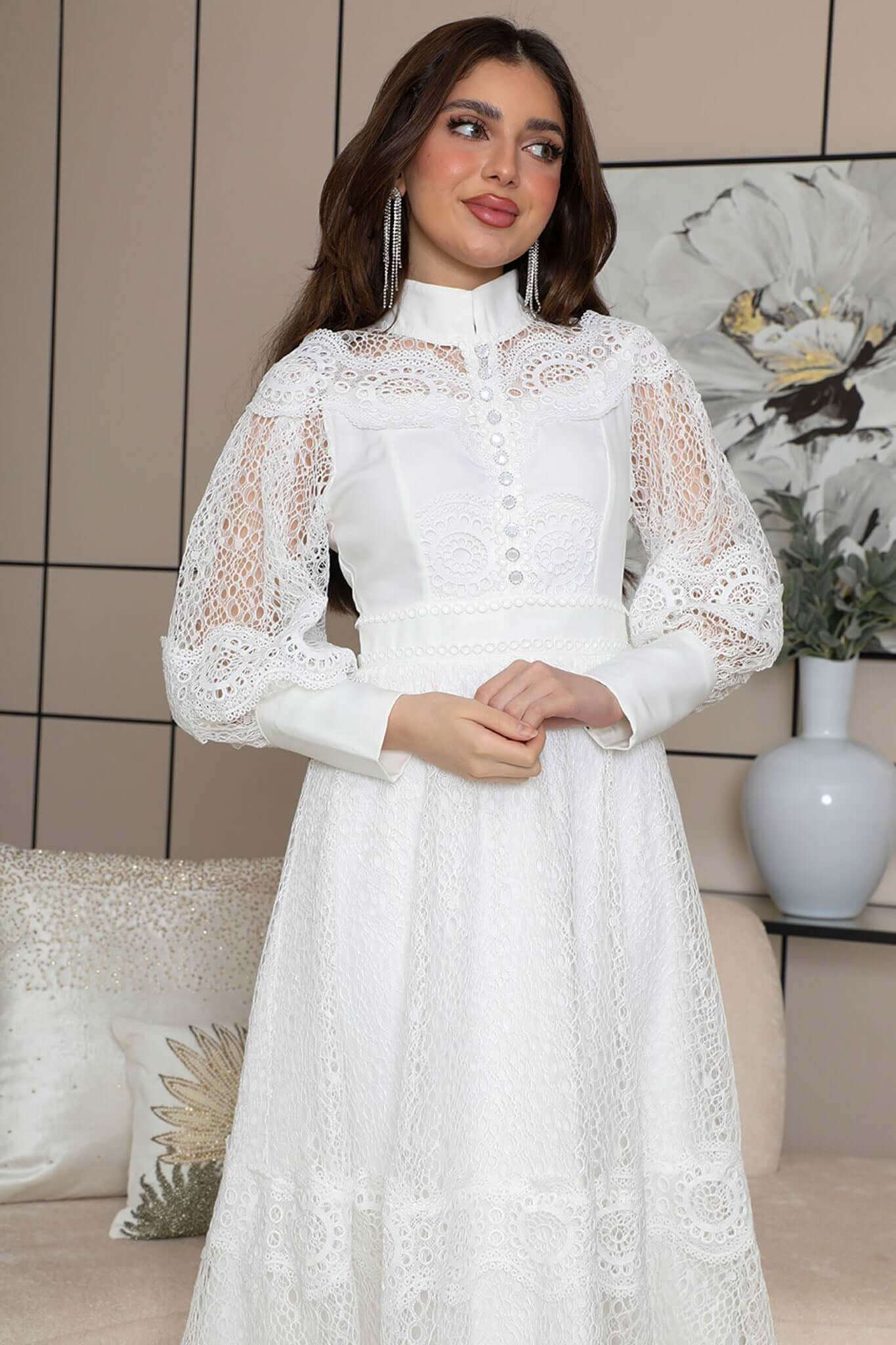 Design type Elegant midi lace dress Story type Elegant long sleeve lace midi dress The occasion Public outing or special occasions waist narrow collar High sleeves long stretching Non-stretchable Material lace Care instructions Machine wash and iron with steam at low temperature (40%) and hang dry.