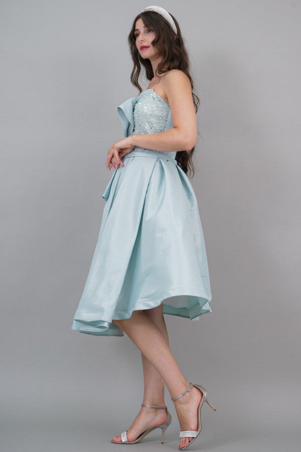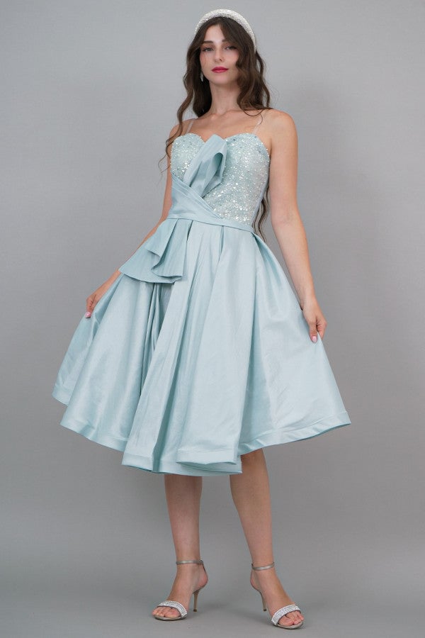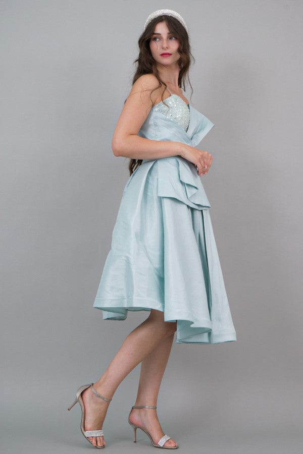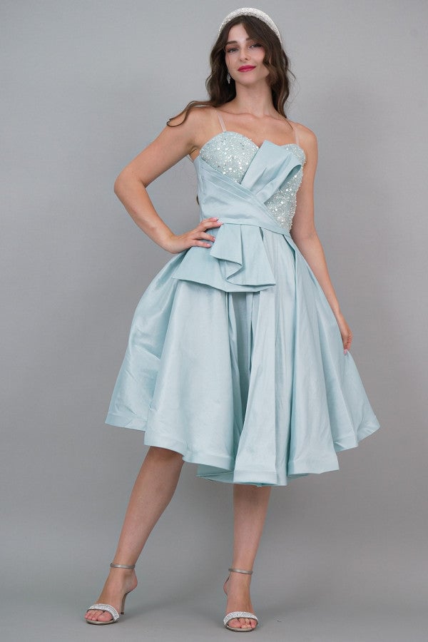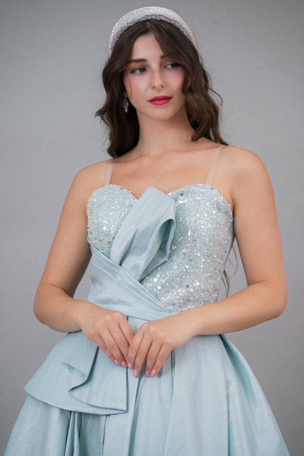 Tiffany color pleated embroidered bodice evening dress