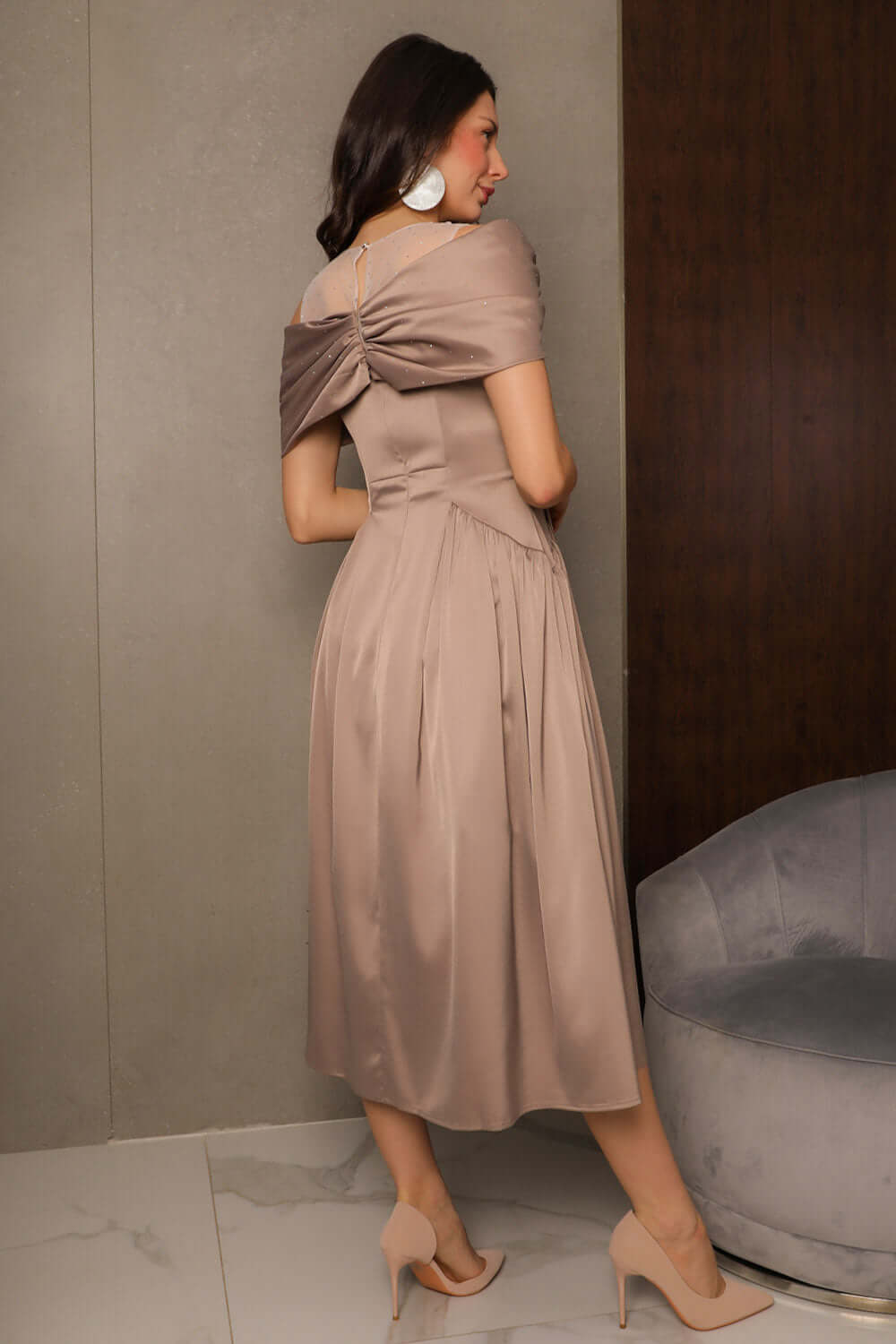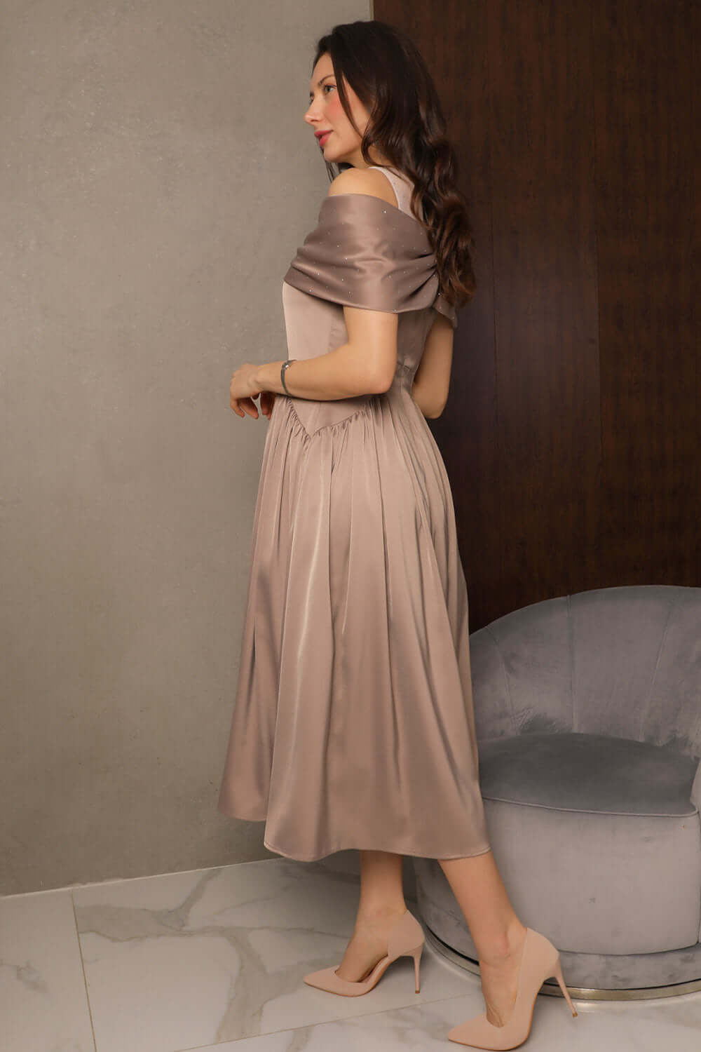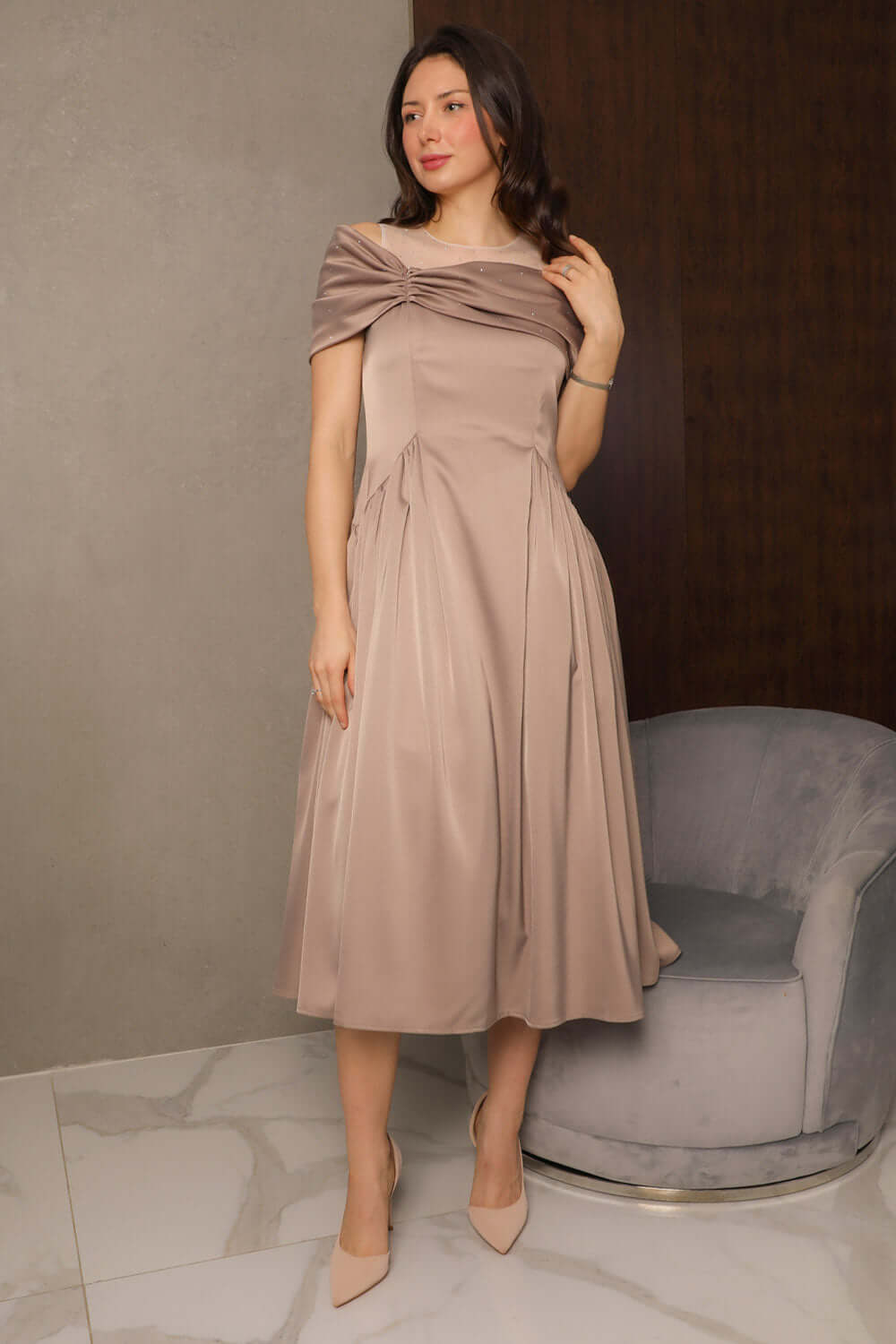 Material Satin crepe Design type Midi evening dress with pleats at the waist Story type Off-shoulder spring midi dress with a sheer halter neckline embellished with sequins and pleats at the waist occasion special occasions or parties waist narrow collar Off shoulder with sheer collar sleeves Book stretching Non-stretchable Care instructions Wash and iron with steam at a low temperature of 40 <!-- -->