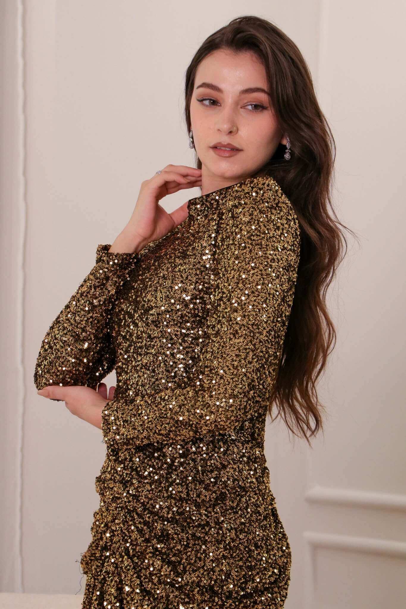 Gold sequin high neck evening dress