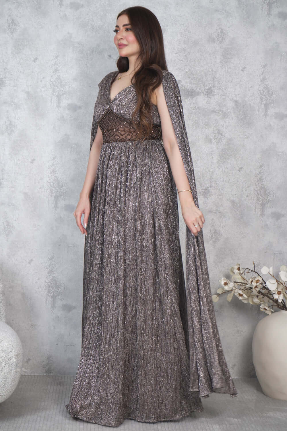 نوع التصميم فستان سهره طويل بأكمام كيب نوع القصة فستان سهره طويل بأكمام كيب مزين بالفصوص بياقة v المناسبه خروج عام او مناسابات خاصة الخصر ضيق الياقه v الاكمام كيب التمدد متوسط التمدد