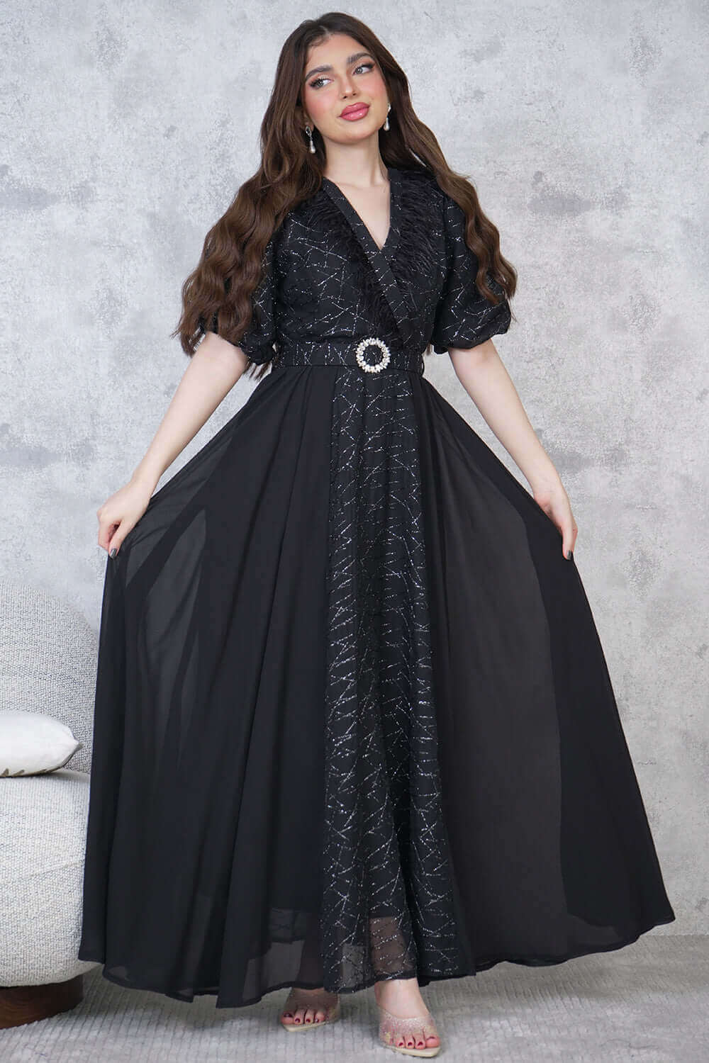 Design type Long dress with puff sleeves Story type Long dress with puff sleeves, decorated with feathers, belt at the waist and a v-neck The occasion Public outing or special occasions waist narrow collar v sleeves short stretching Non-stretchable Material chiffon Add-ons belt Care instructions Machine wash and iron with steam at low temperature (40%) and hang dry.