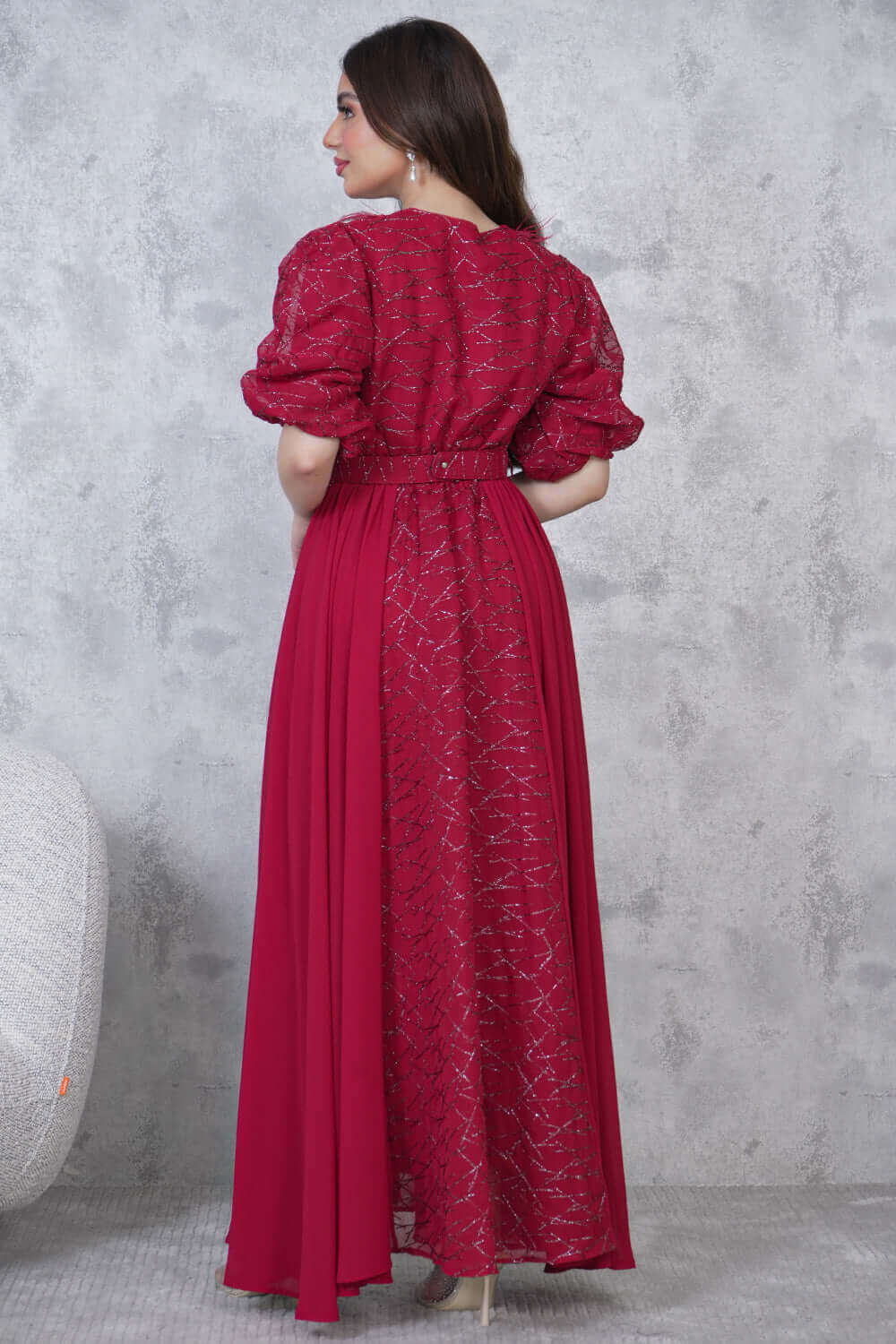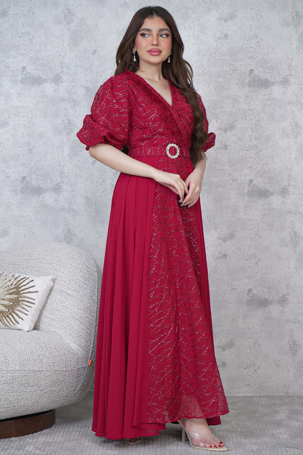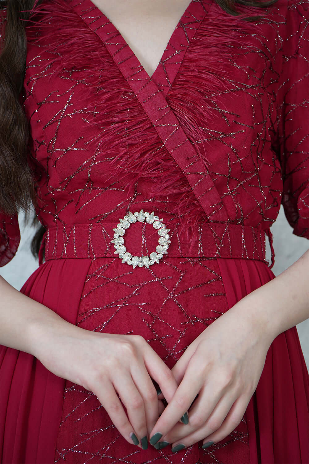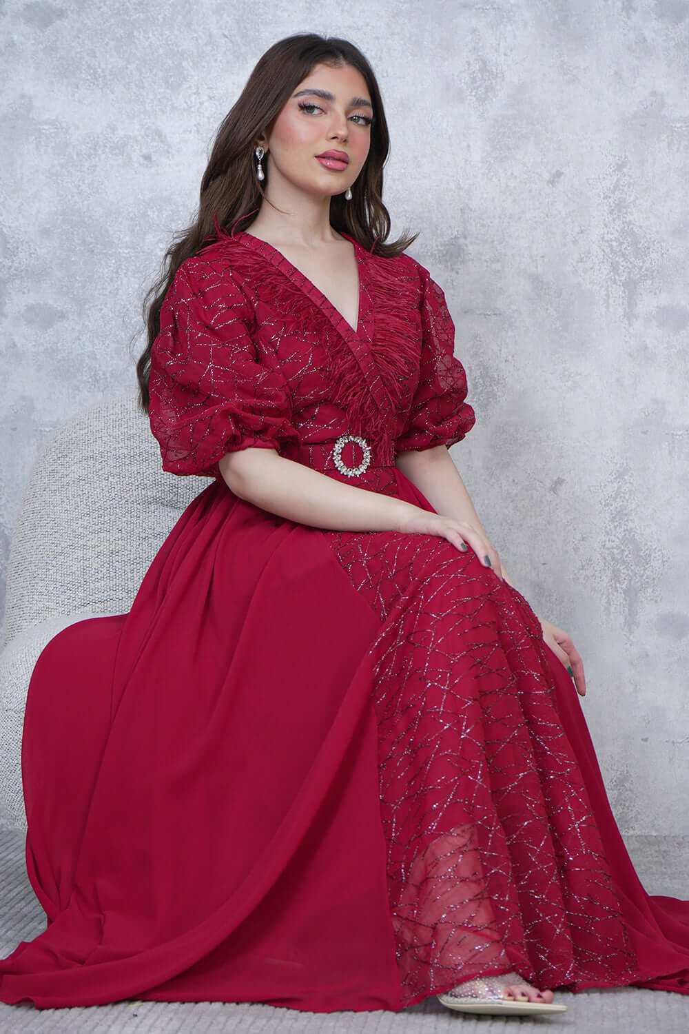 Design type Long dress with puff sleeves Story type Long dress with puff sleeves, decorated with feathers, belt at the waist and a v-neck The occasion Public outing or special occasions waist narrow collar v sleeves short stretching Non-stretchable Material chiffon Add-ons belt Care instructions Machine wash and iron with steam at low temperature (40%) and hang dry.