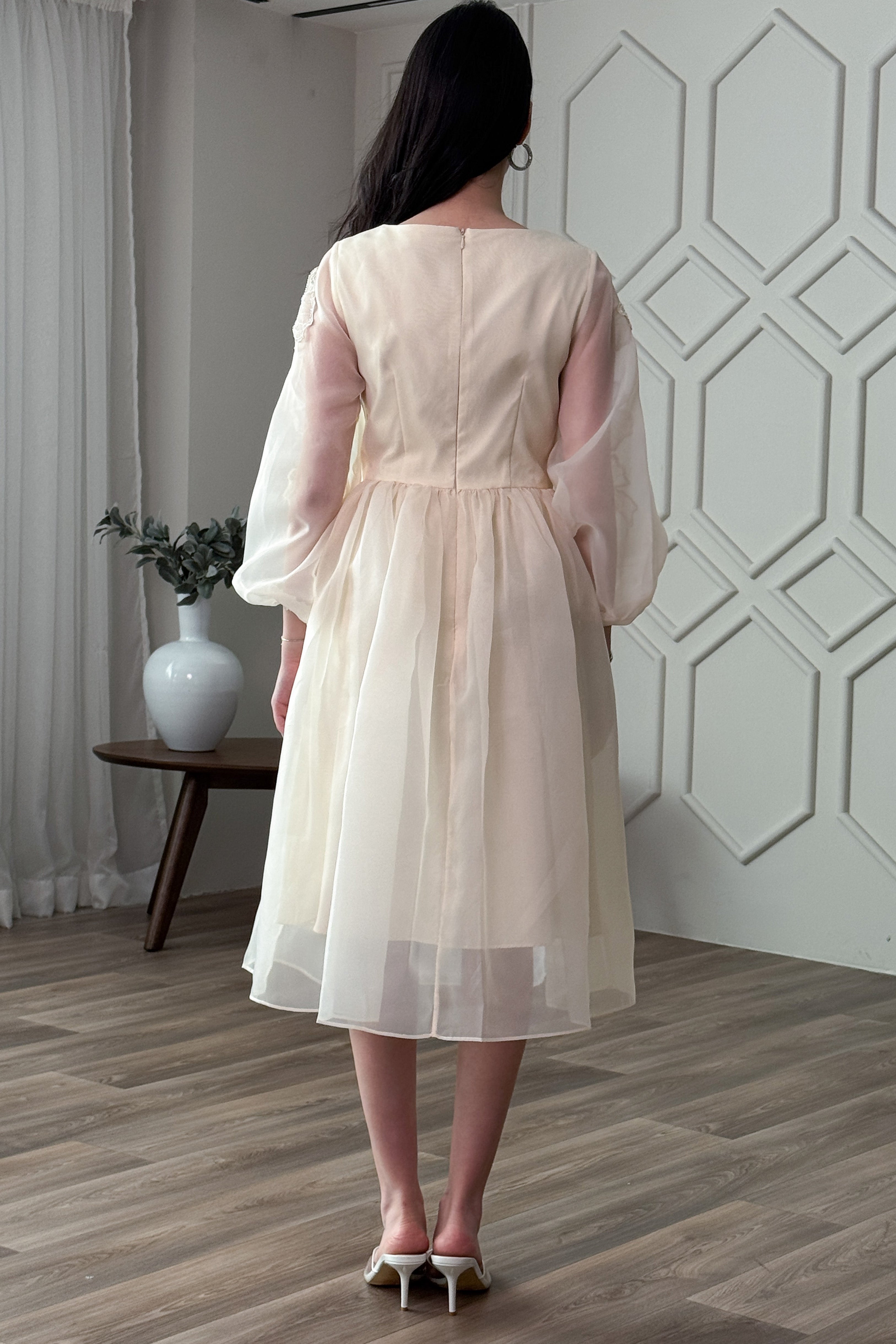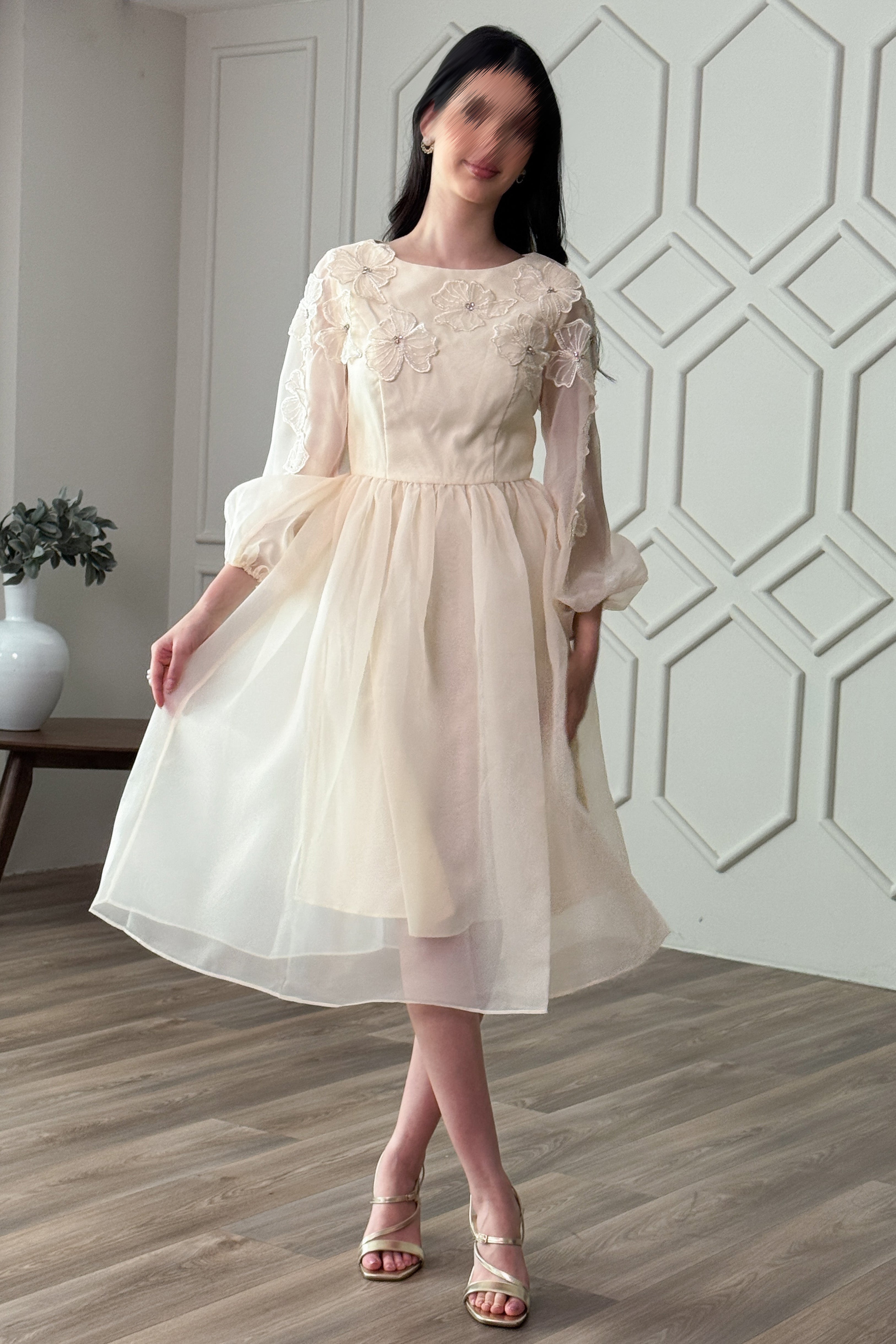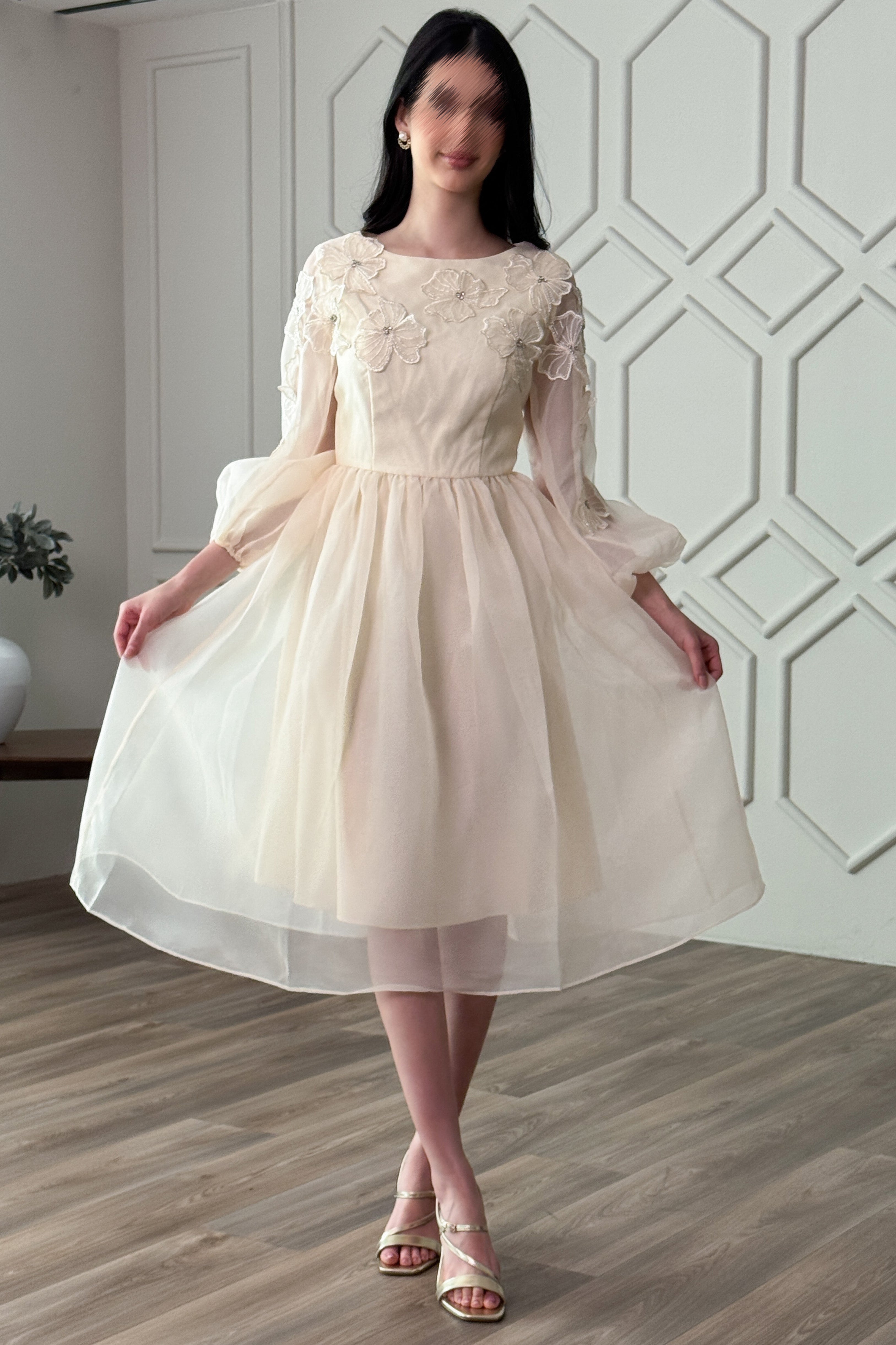 Design type Short chiffon dress with rose appliqués Story type Short chiffon dress with rose appliqués and long puff sleeves The occasion Public outing or special occasions waist narrow collar Circular sleeves long stretching Non-stretchable Material chiffon Care instructions Machine wash and iron with steam at low temperature (40%) and hang dry.