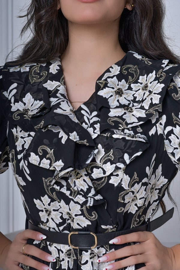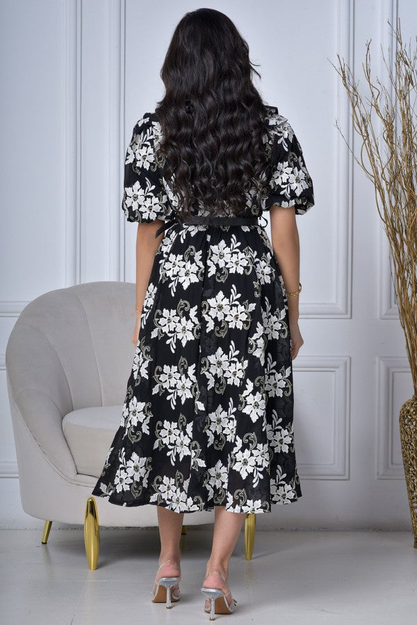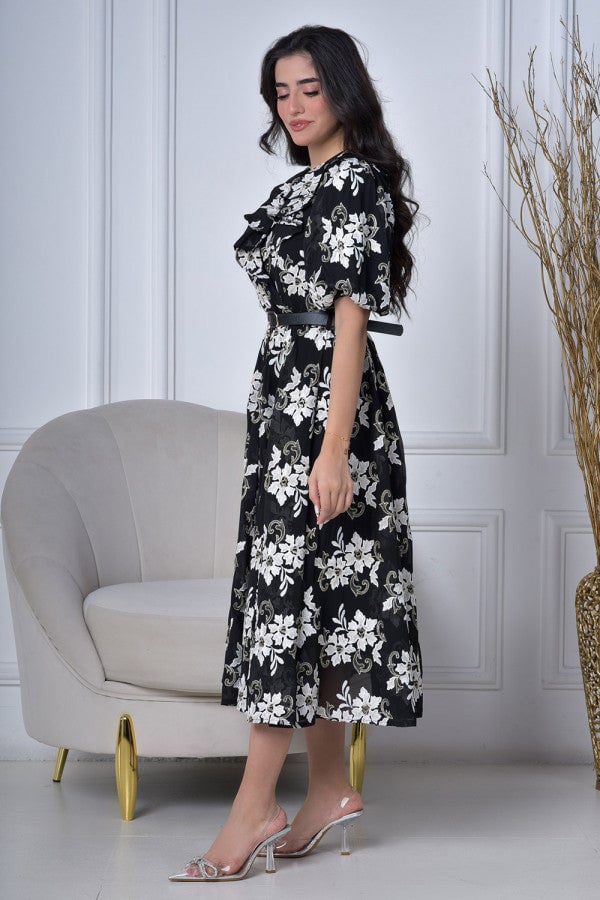 الخامة بوليستر نوع التصميم فستان كلوش مطرز بالورد نوع القصة ميدي كلوش مزموم الخصر بحزام وياقه v بكشكش بكم قصير بف المناسبة خروج عام او حفلات او مناسبات خاصه الخصر زم كلوش الياقة v الاكمام قصير بف التمدد غير قابل لتمدد الاضافات حزام ارشادات العناية يغسل ويكوى بالبخار بدرجة حراره منخفضه 40 طول المودل
