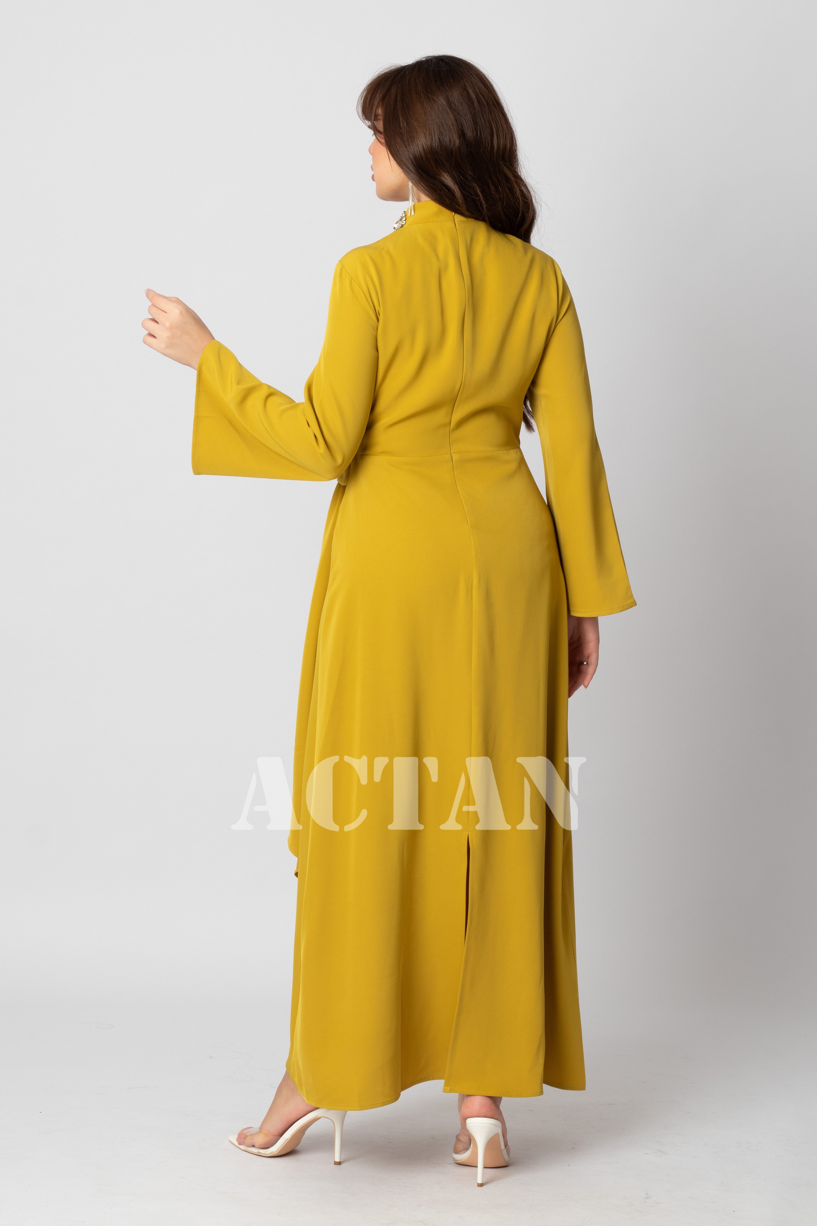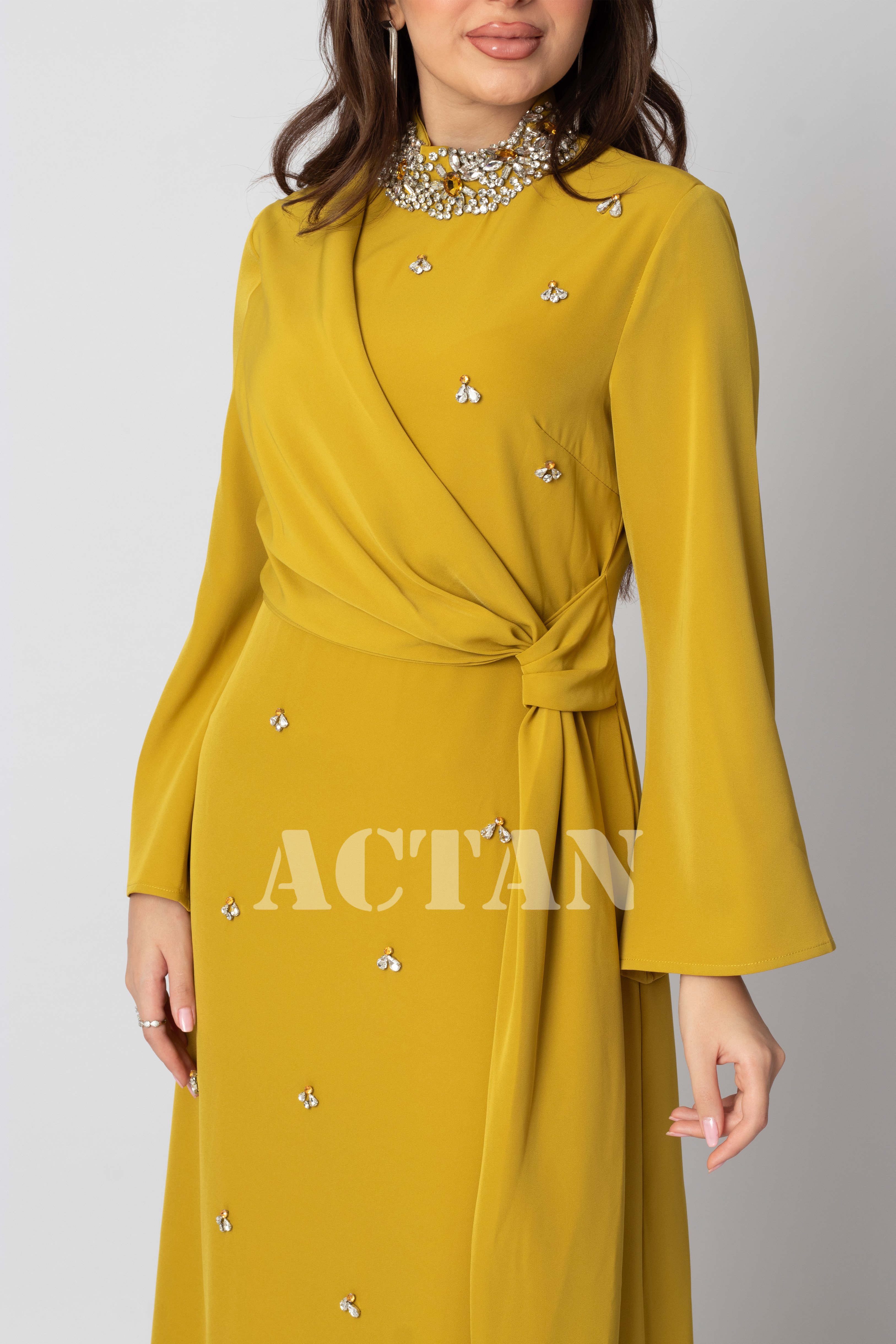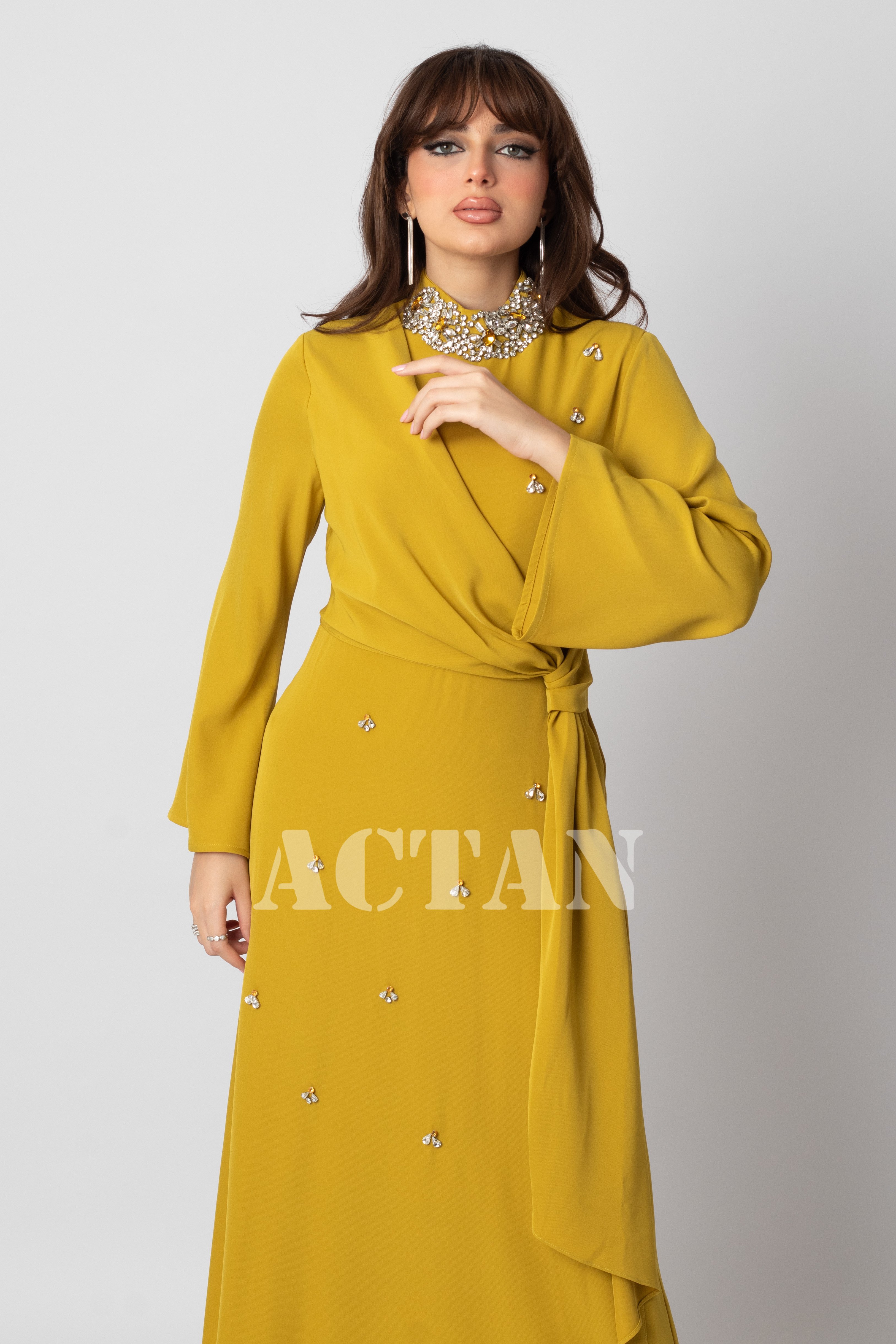 Design type Crystal-embellished collar maxi dress Story type Side-tie maxi dress with long sleeves and a crystal-embellished collar The occasion Public outing or special occasions waist narrow collar high circular sleeves long stretching Non-stretchable Material crepe