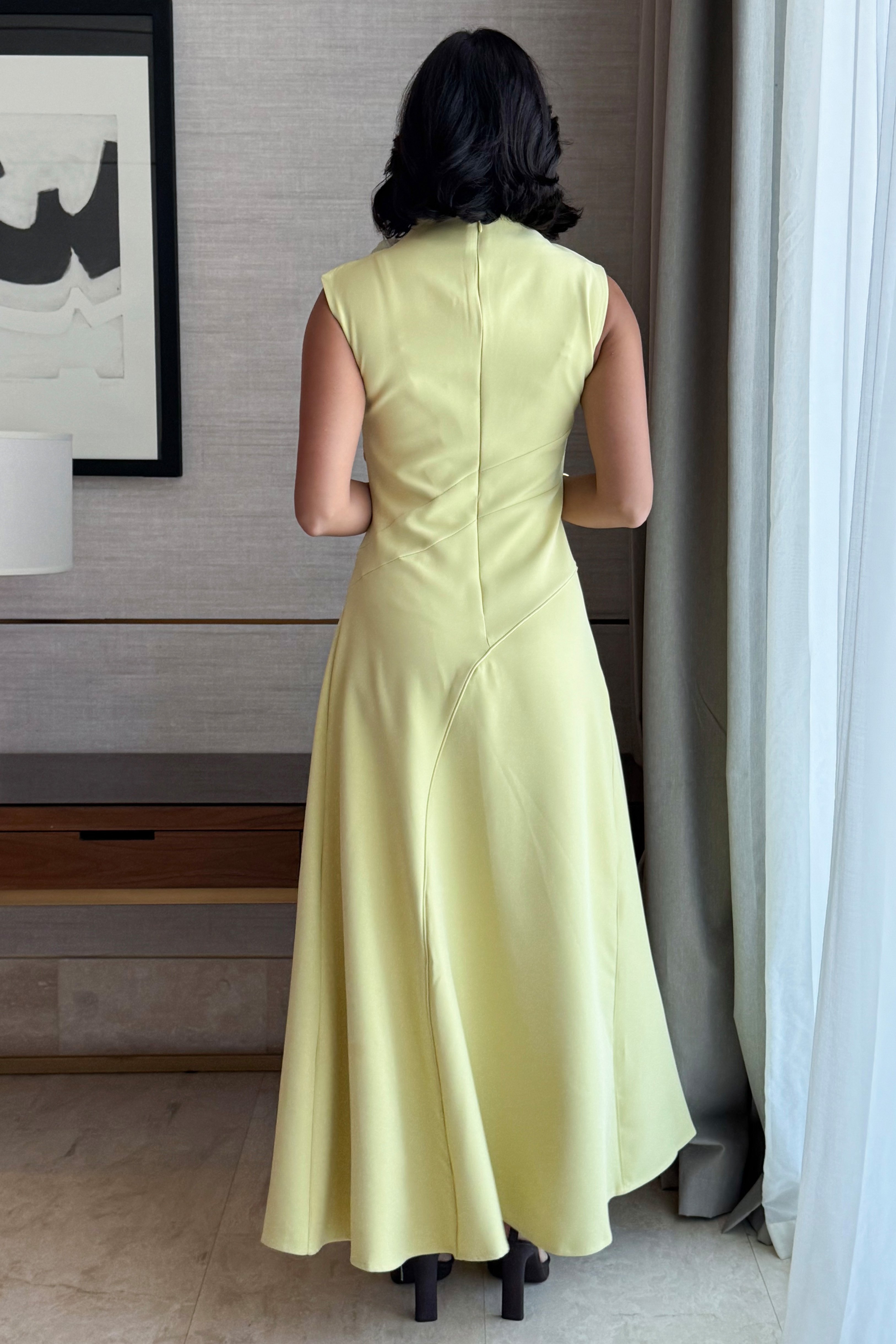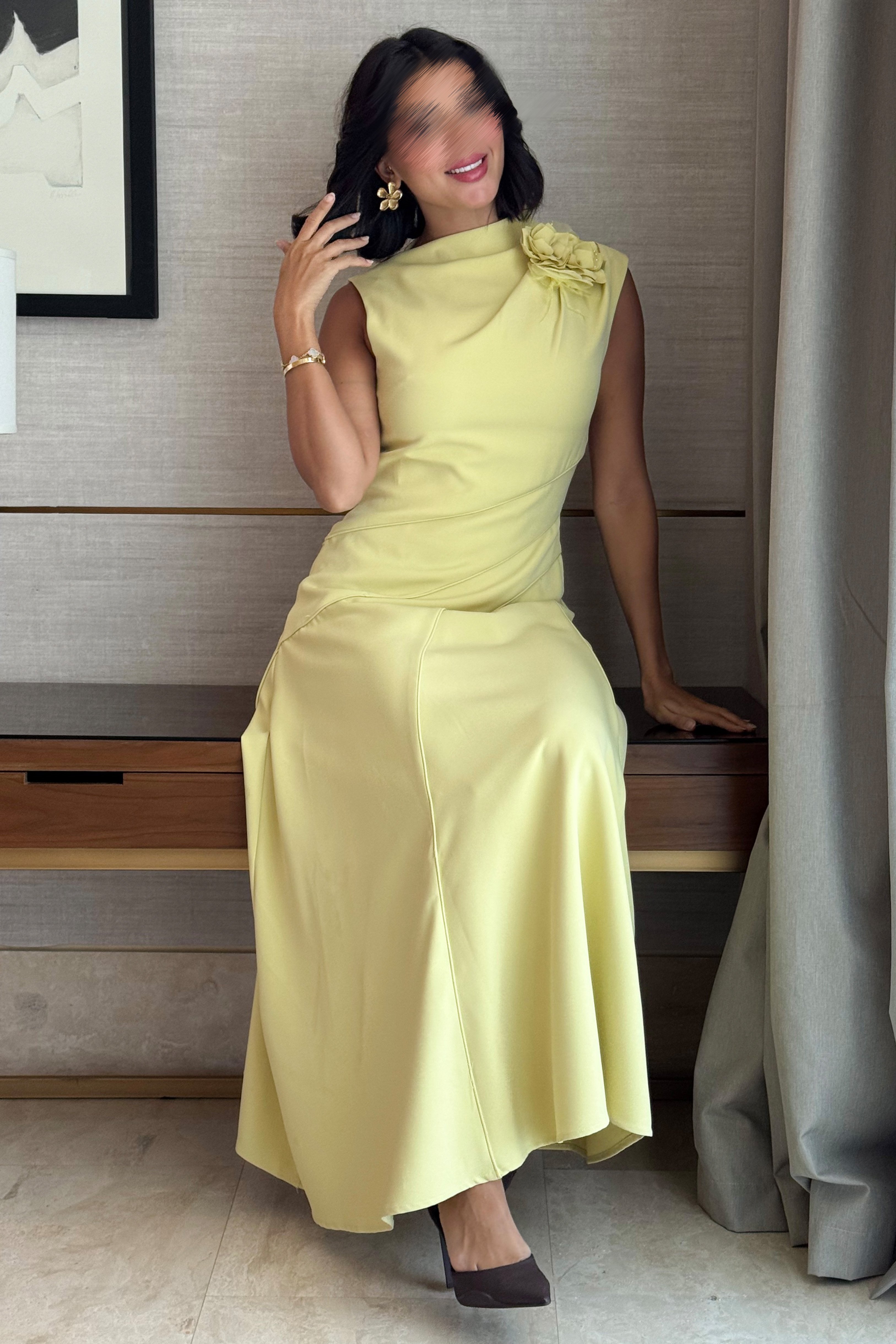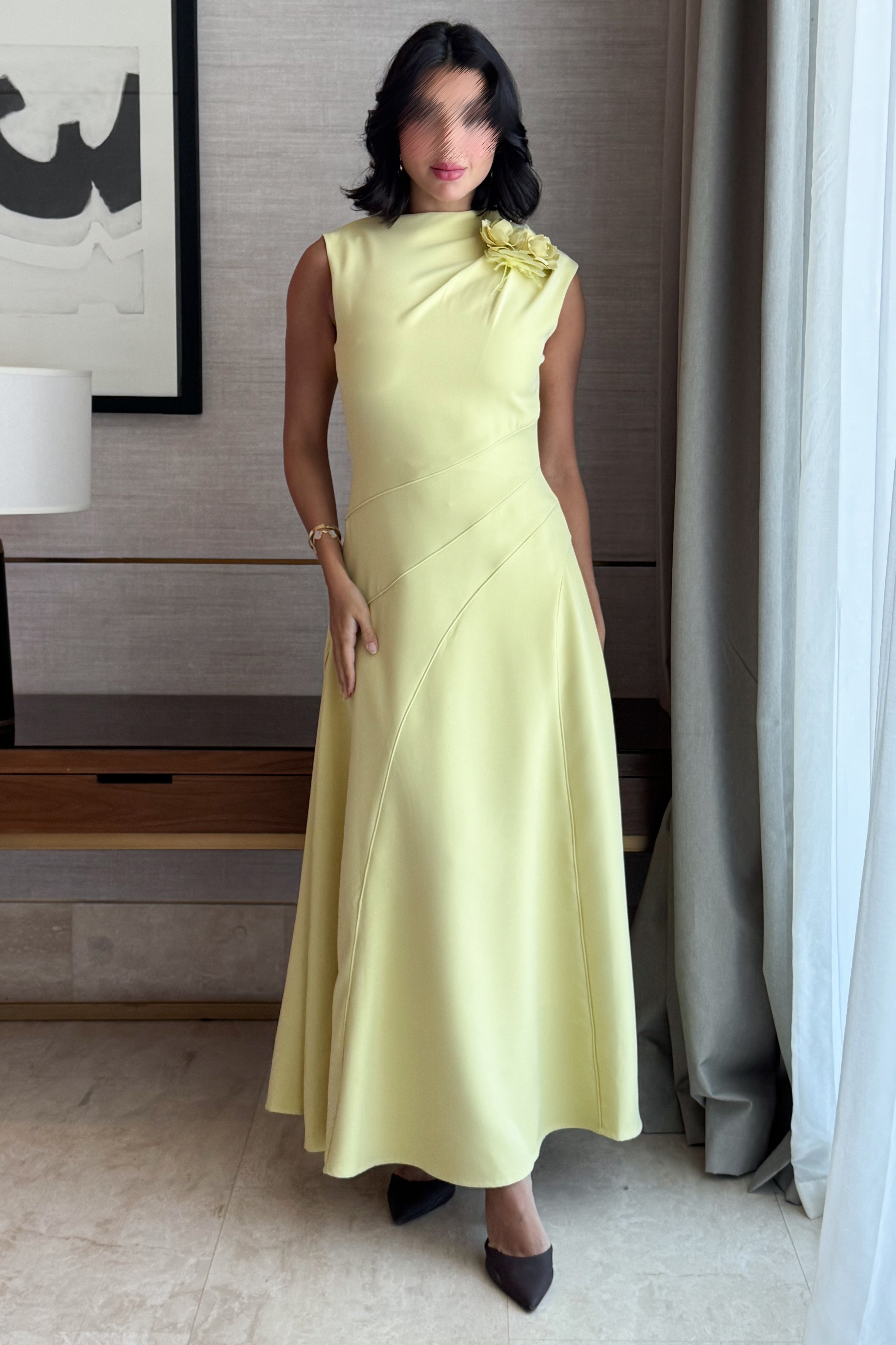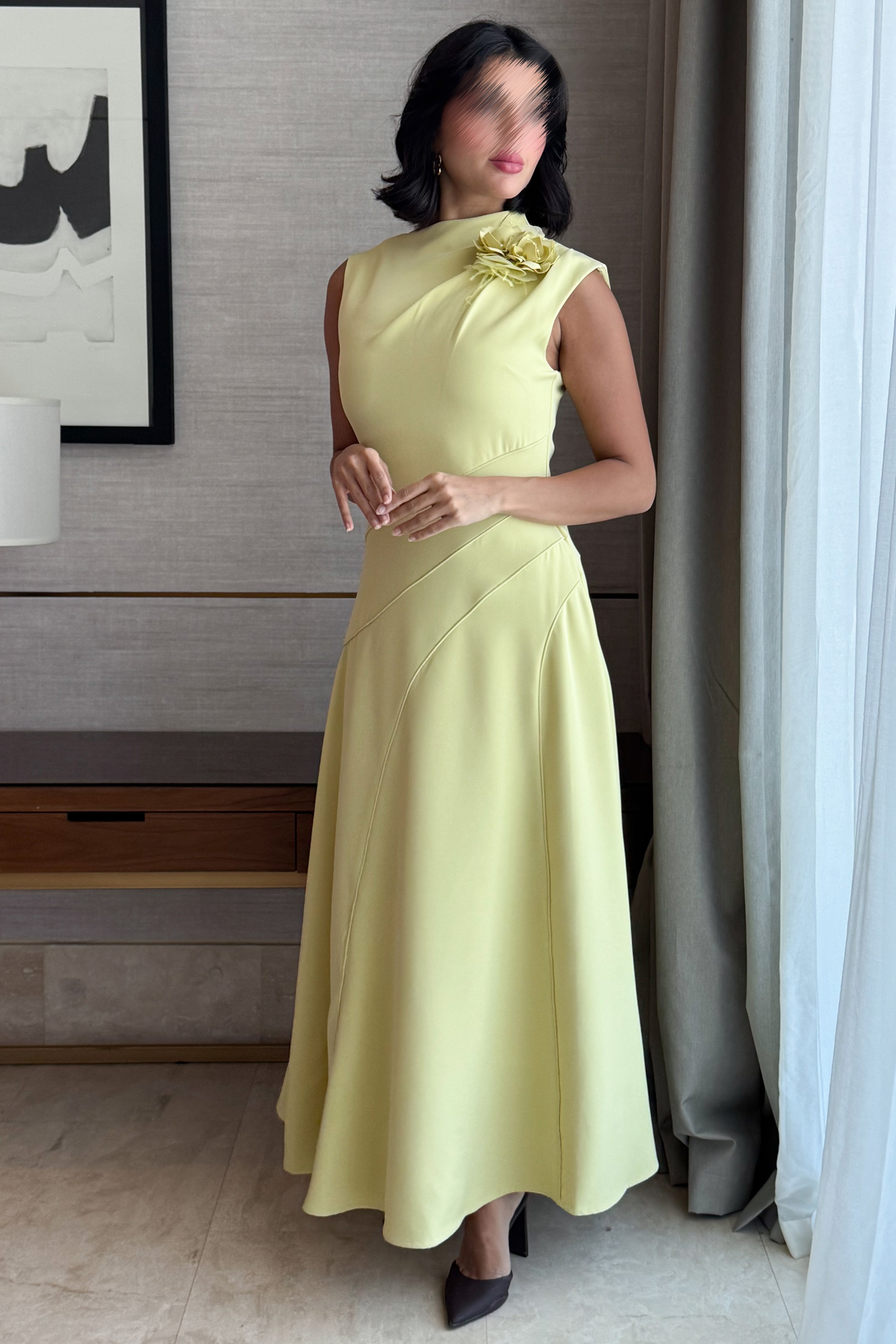 فستان ماكسي ضيق مزين ببروش ورد لون اخضر
