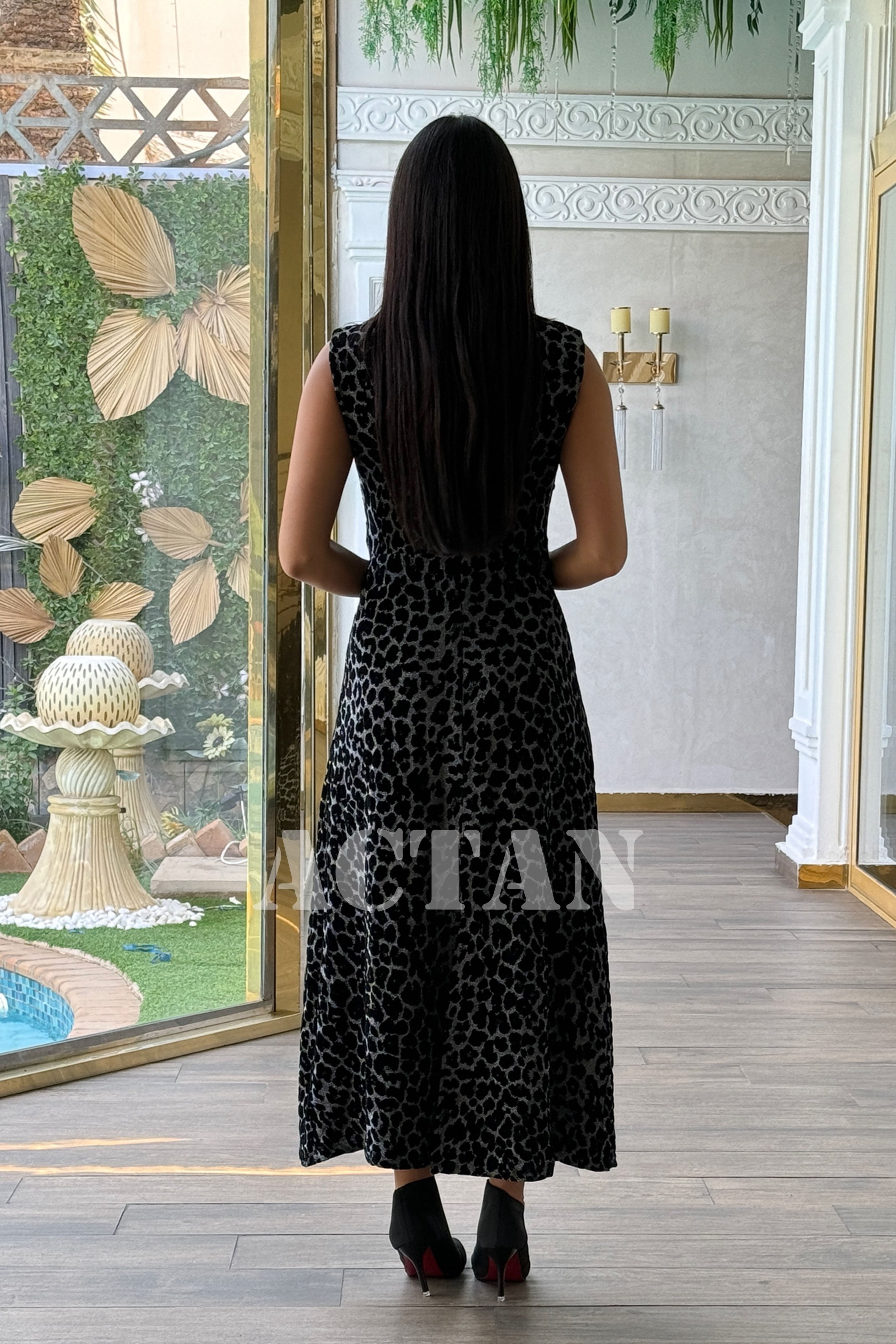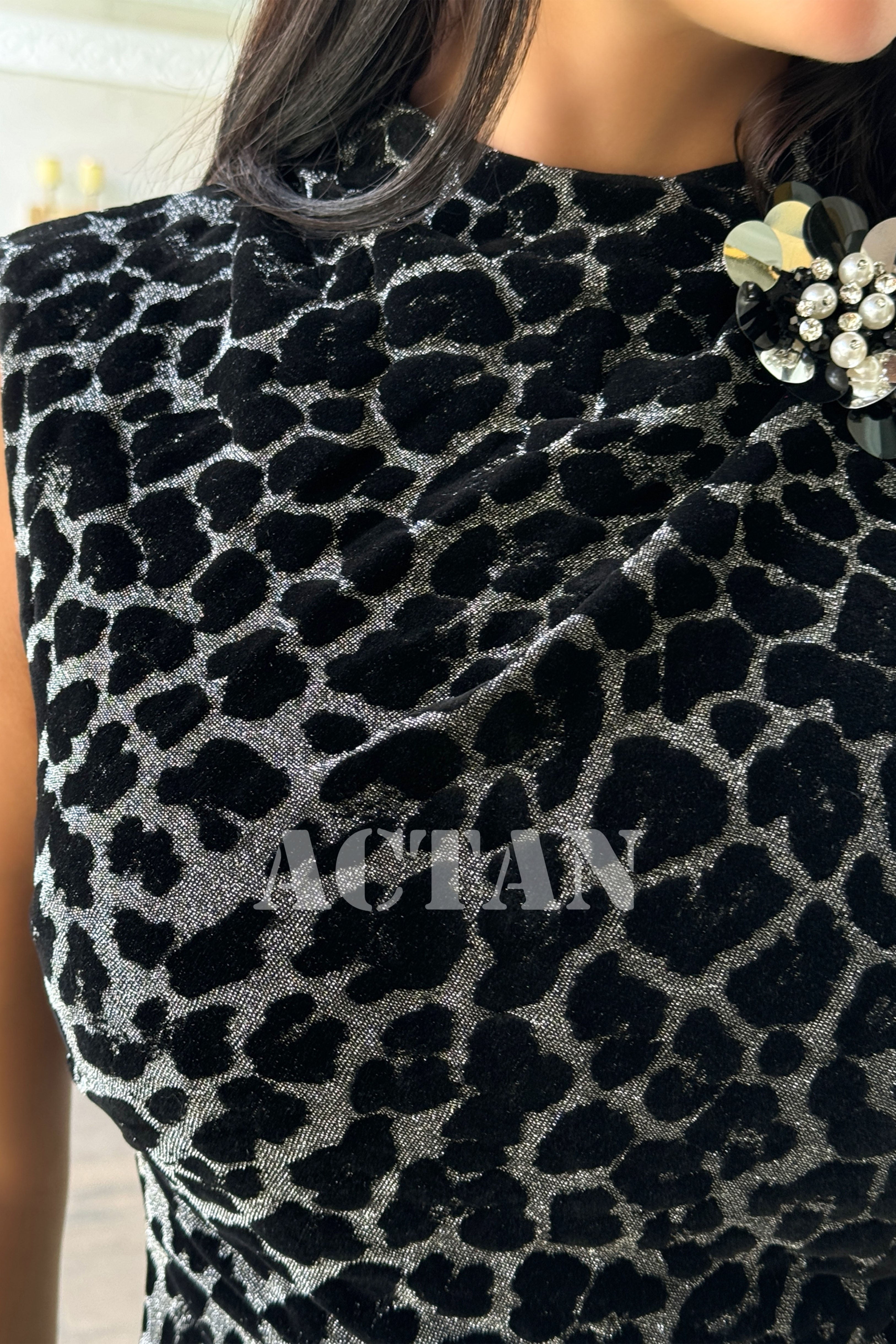 Design type Leopard print velvet dress with brooch Story type Leopard print velvet dress with draped brooch The occasion Public outing or special occasions waist narrow collar High sleeves without stretching Expandable Material velvet Care instructions Wash and steam iron at low temperature 40 percent and hang dry