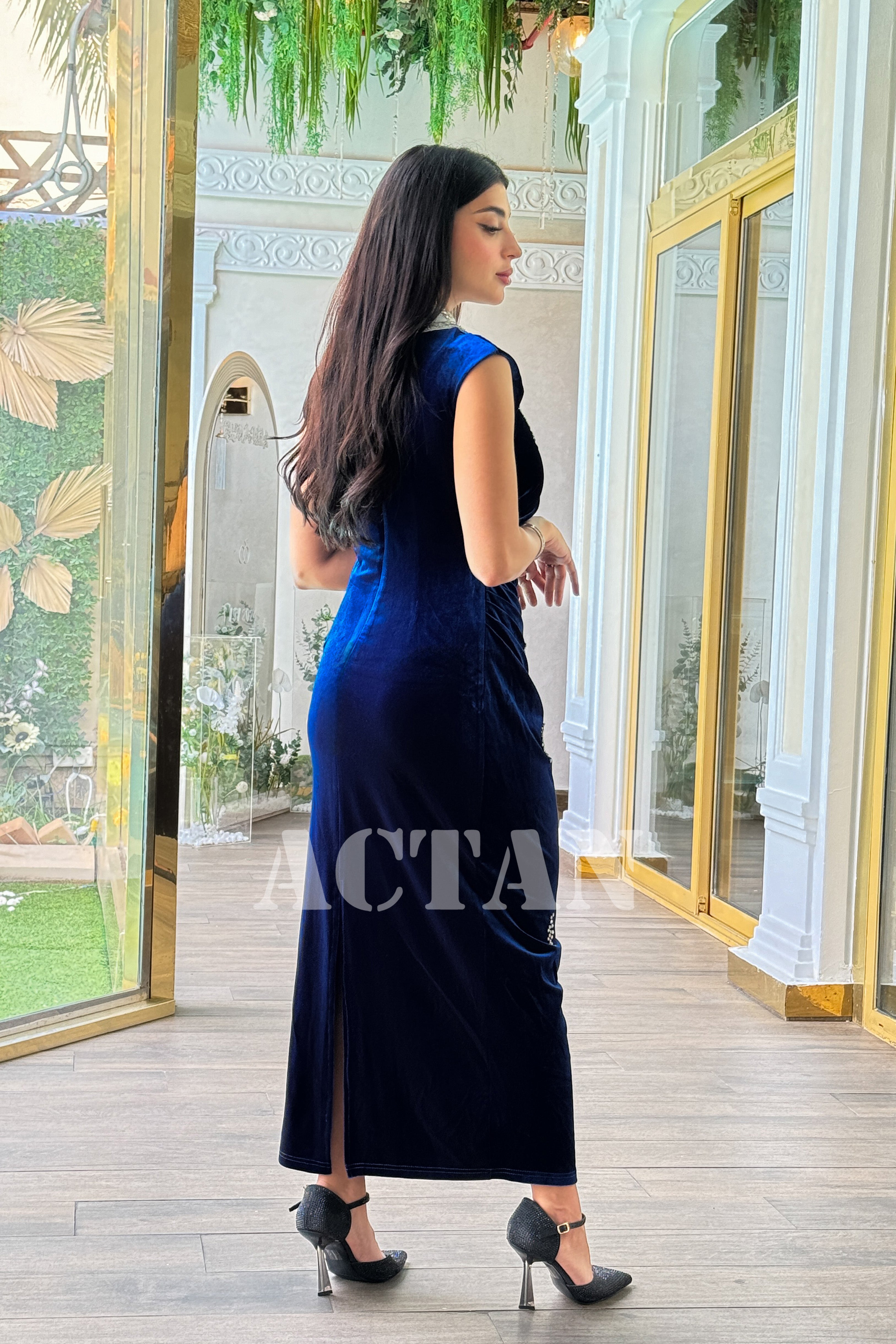 Design type Draped velvet dress with a large collar and crystals Story type Draped velvet dress with a large folded collar and crystal embellishments and a slit at the back The occasion Public outing or special occasions waist narrow collar Folded sleeves Sleeveless stretching Expandable Material velvet Care instructions Wash and steam iron at low temperature 40 percent and hang dry