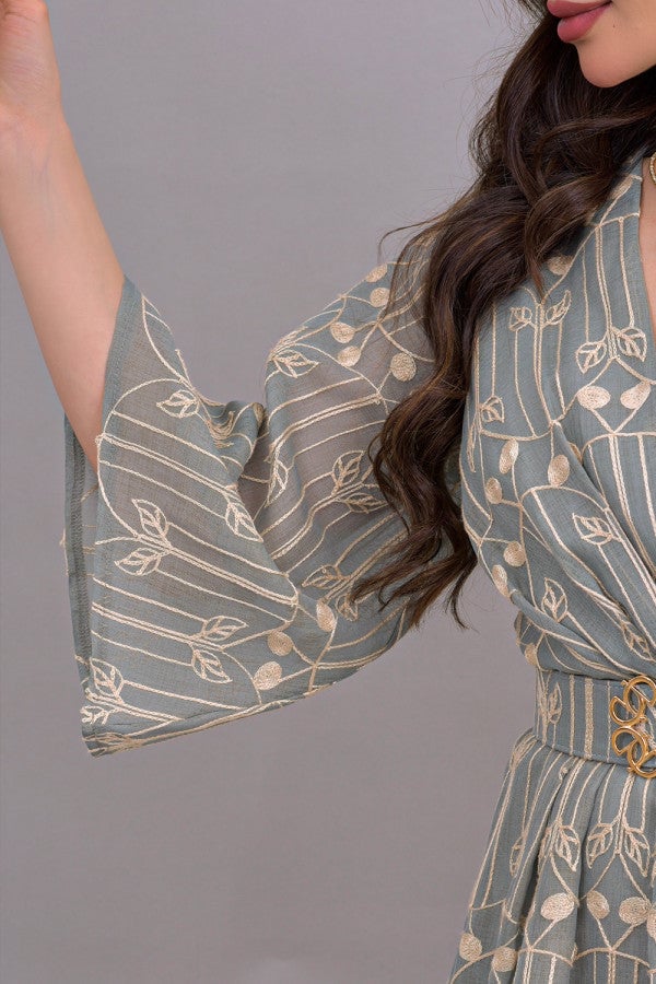 Material polyester Design type Dress embroidered with golden ribbons Story type Long dress with a v-neck occasion Public outing, parties or special occasions waist Zam with fractures collar v sleeves Widely confused stretching Non-stretchable Add-ons belt Care instructions Wash and iron with steam at a low temperature of 40