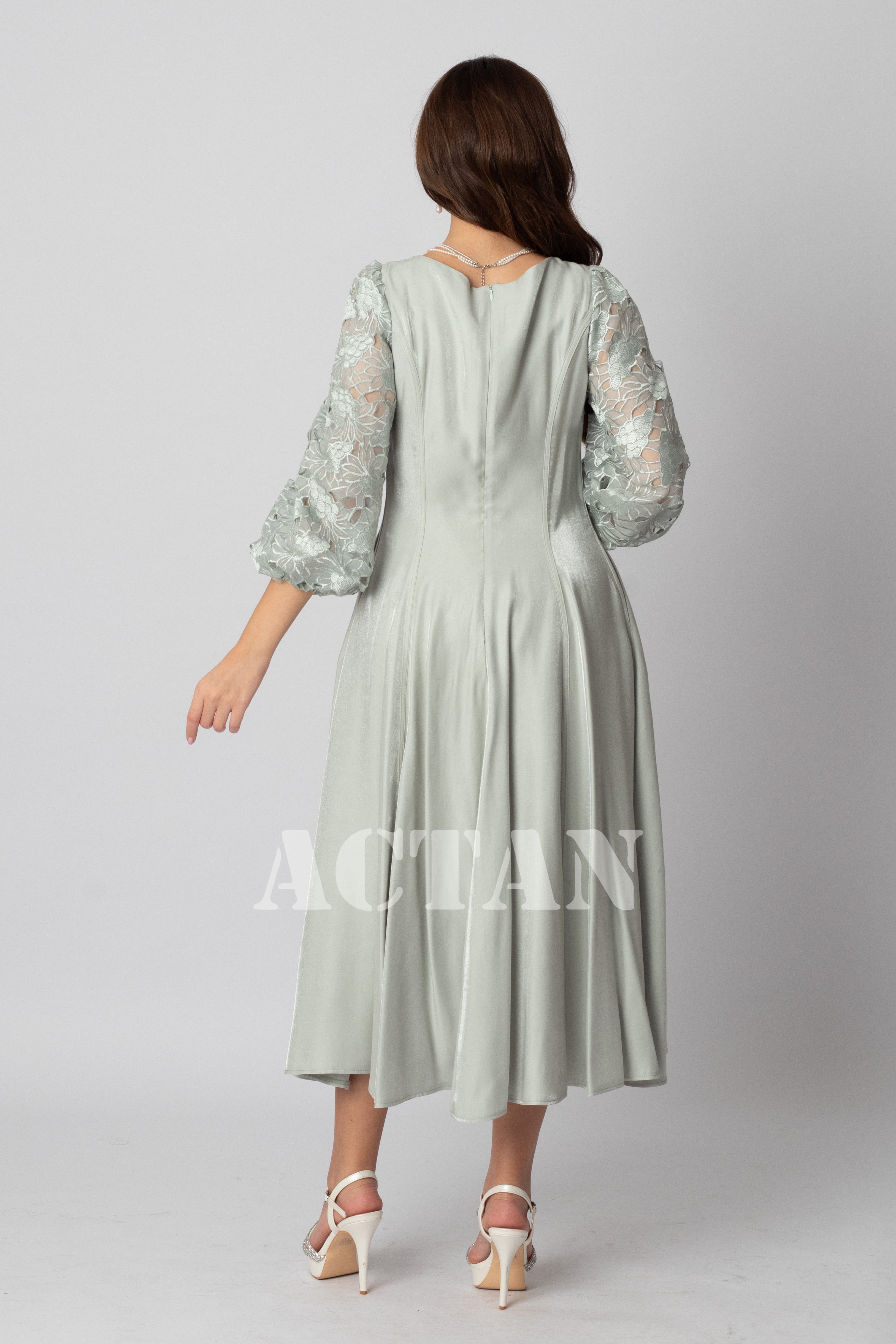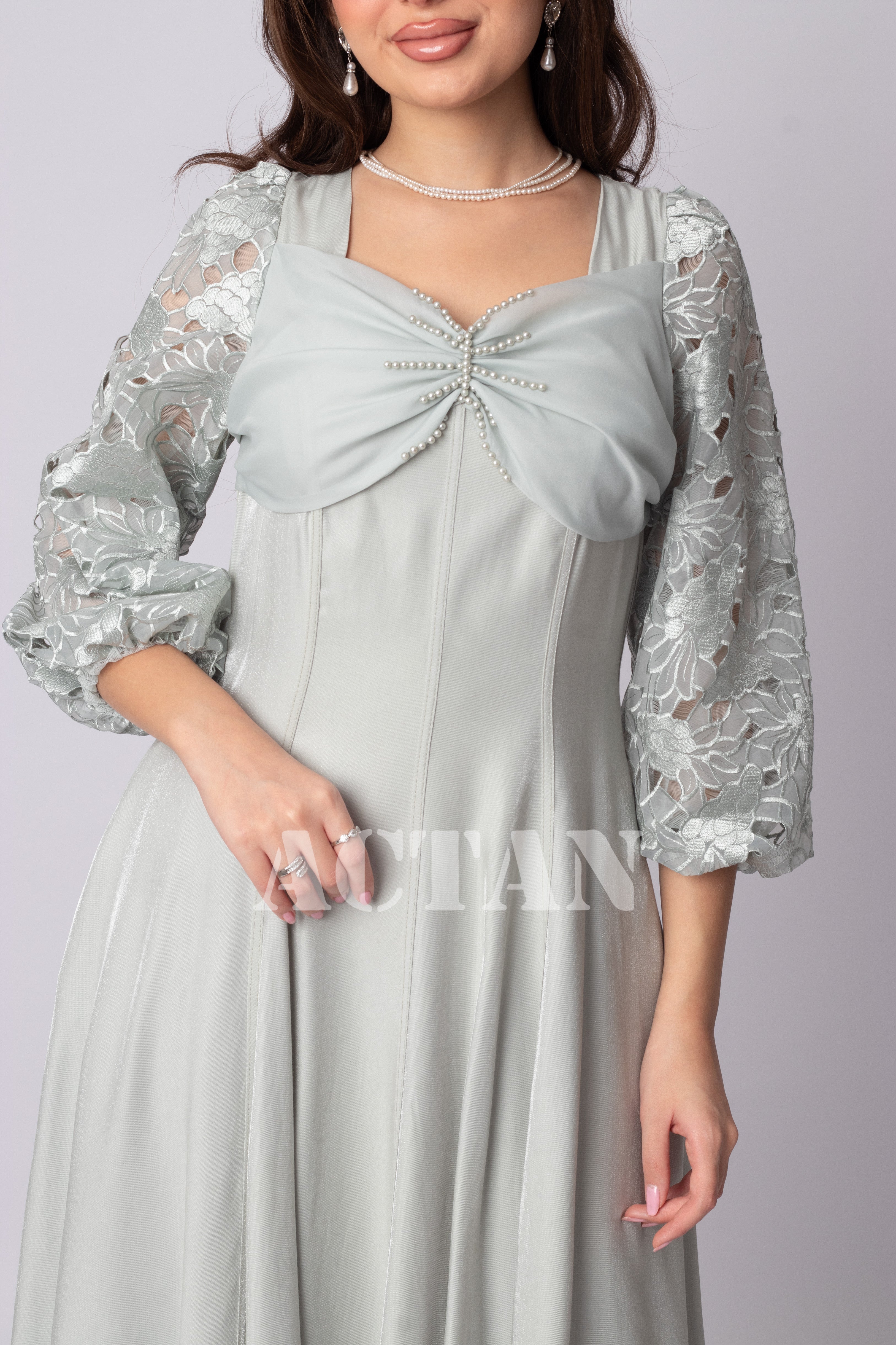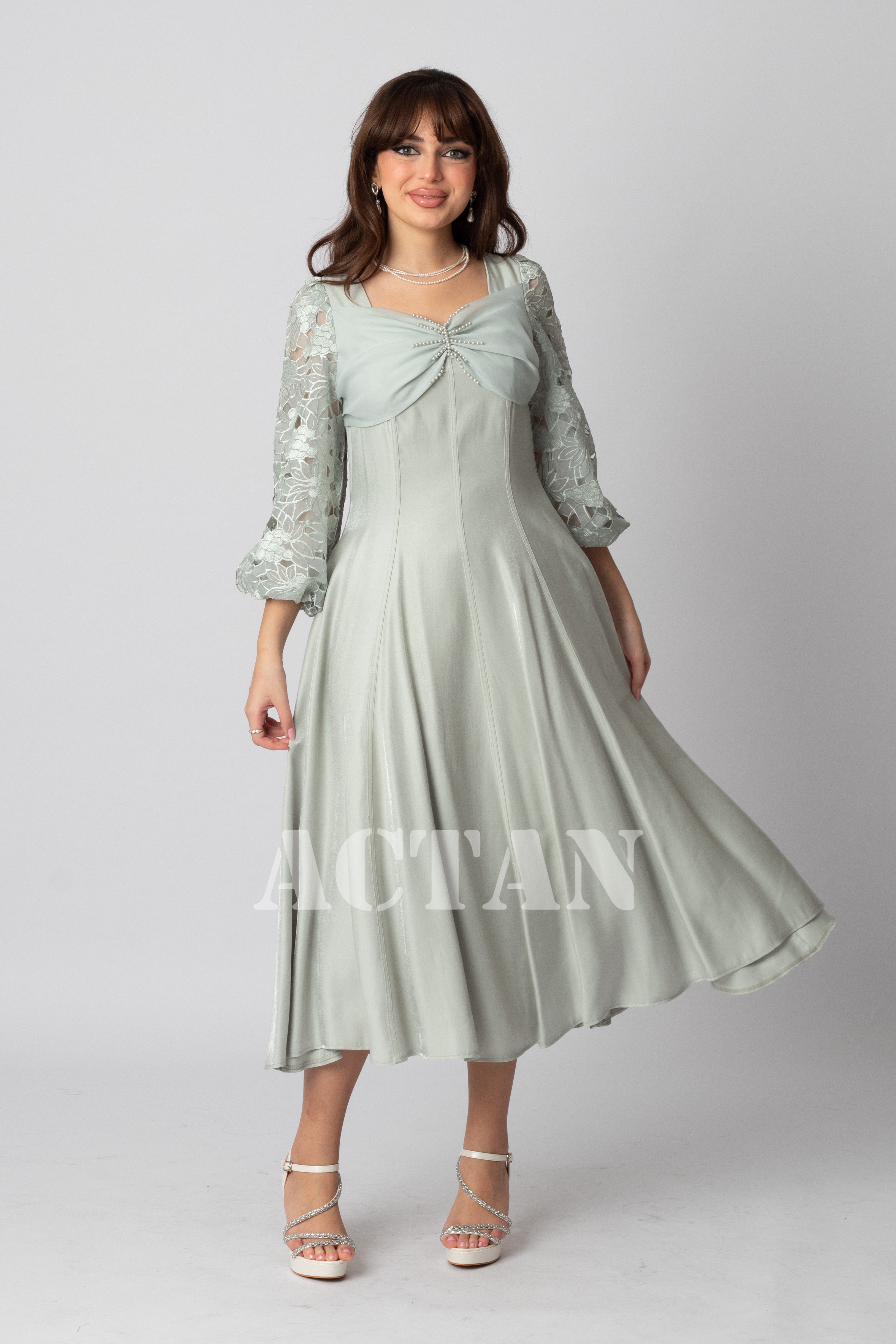 Design type Pearl-embellished guipure sleeve midi dress Story type Long sleeve guipure midi dress embellished with pearls The occasion Public outing or special occasions waist narrow collar heart-shaped sleeves long stretching Non-stretchable Material crepe Care instructions Machine wash and iron with steam at low temperature (40%) and hang dry.