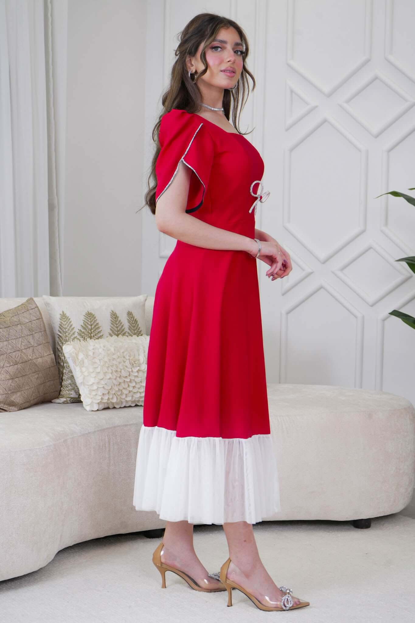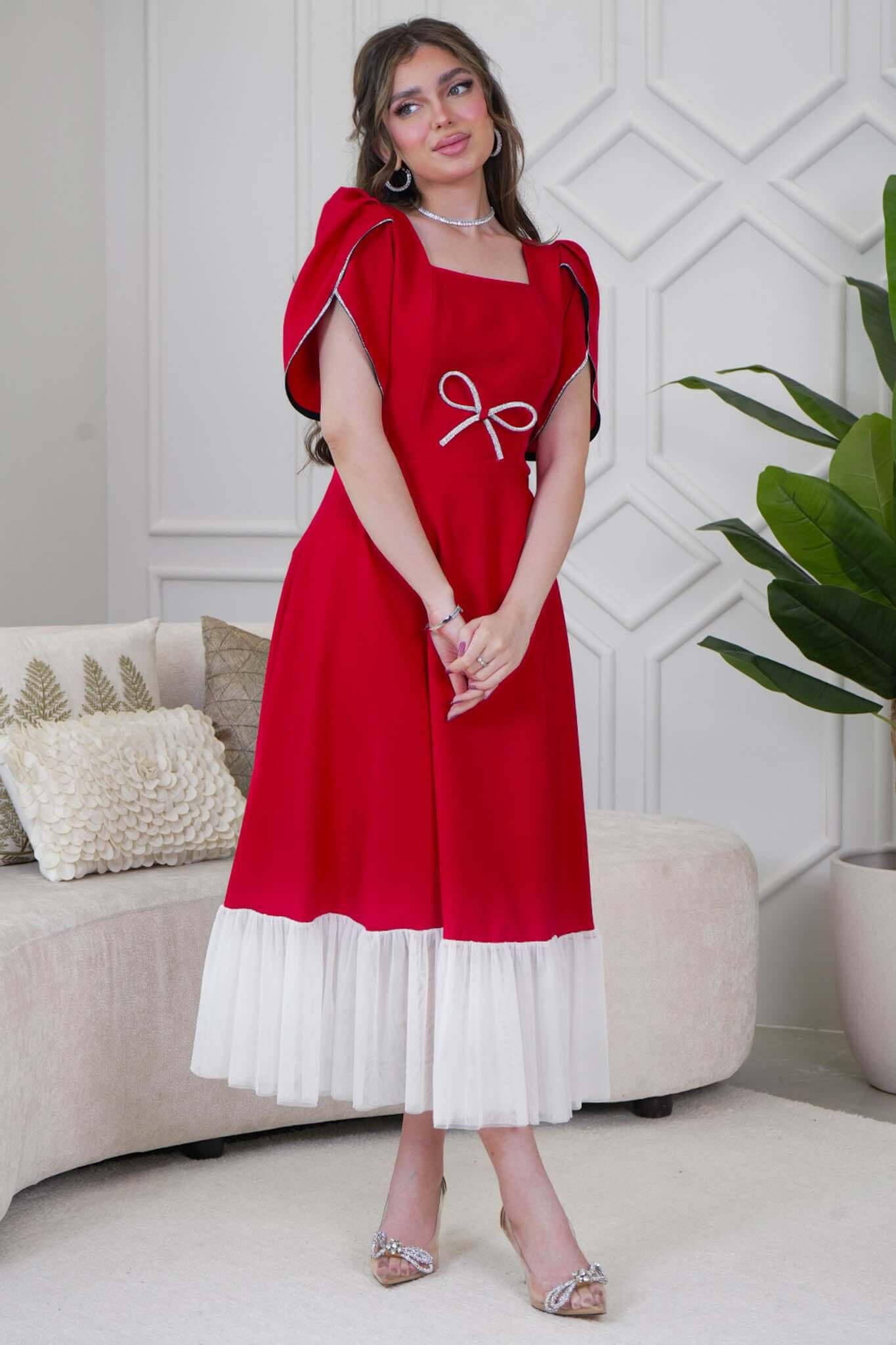نوع التصميم فستان ميدي بأكمام قصيرة مزينة بفصوص نوع القصة فستان ميدي بأكمام قصيرة مزينة بفصوص بياقة مربعة المناسبه خروج عام او مناسابات خاصة الخصر ضيق الياقه مربعة الاكمام قصيرة التمدد غير قابل للتمدد الخامة كريب إرشادات العناية يغسل ويكوى بالبخار بدرجة حراره منخفضه 40-بالمئه ويجفف بالتعليق