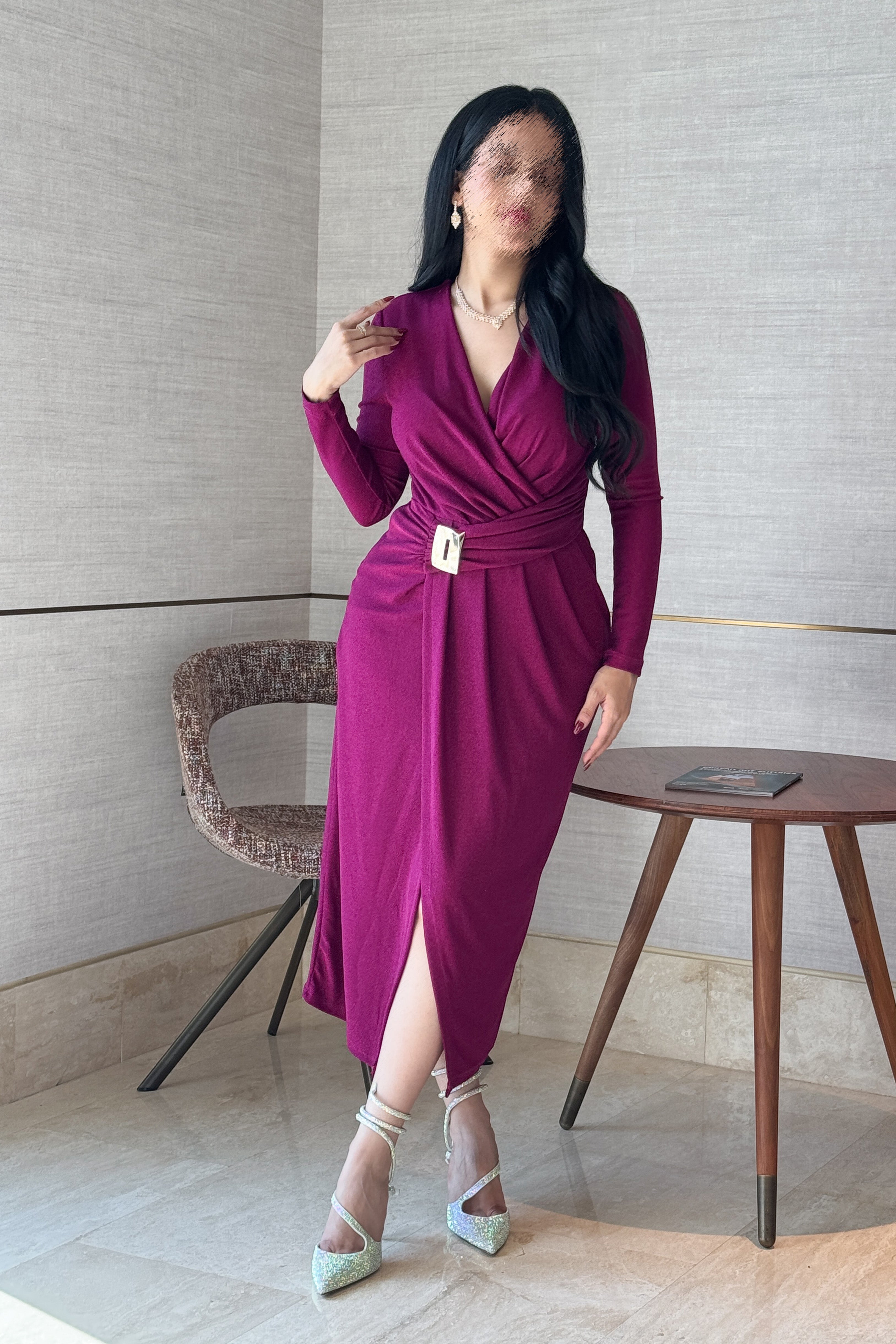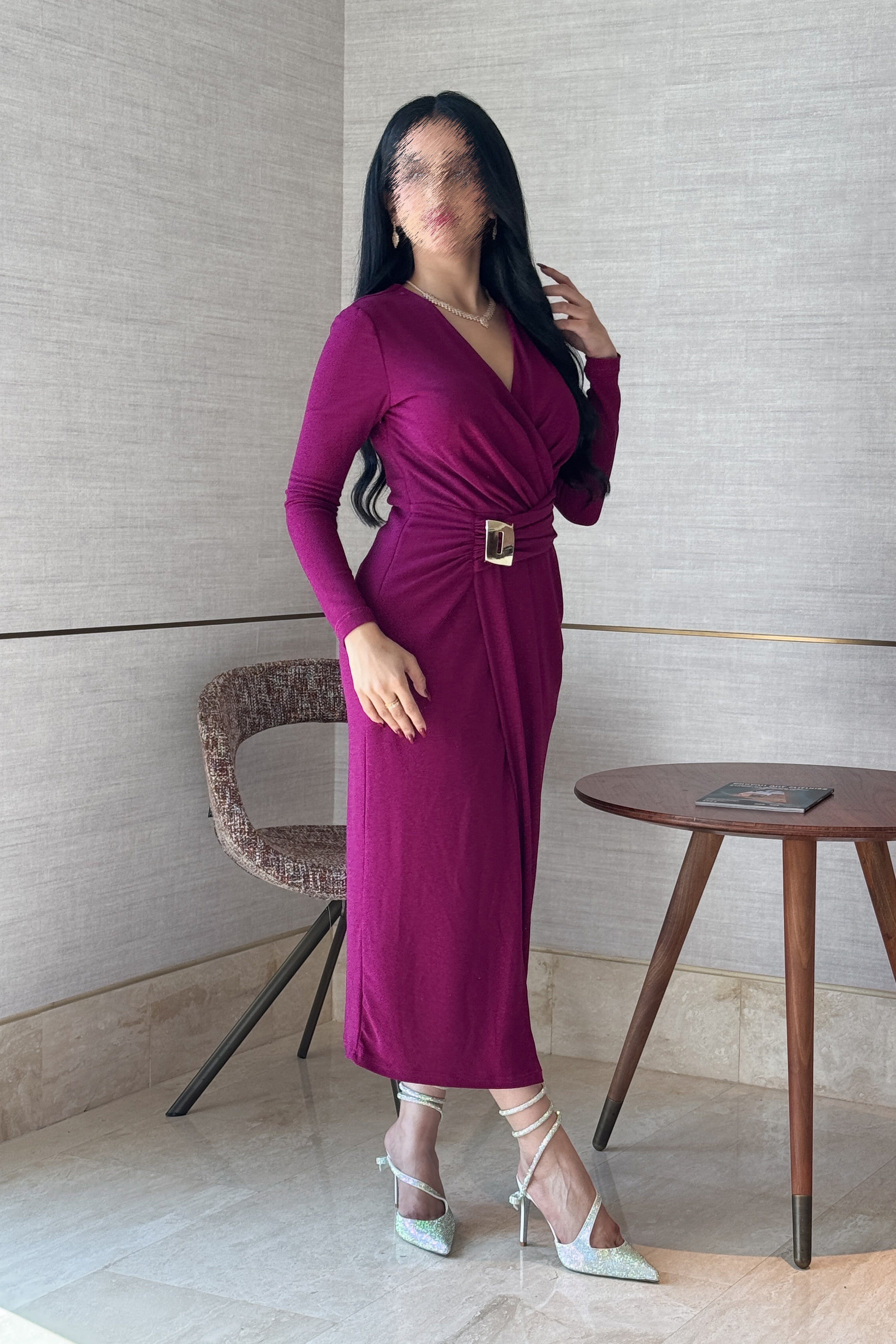Design type Pleated midi dress with brooch Story type Pleated midi dress with glitter brooch and long sleeves The occasion Public outing or special occasions waist narrow collar v sleeves long stretching Expandable Material Jersey Care instructions Machine wash and iron with steam at low temperature (40%) and hang dry.