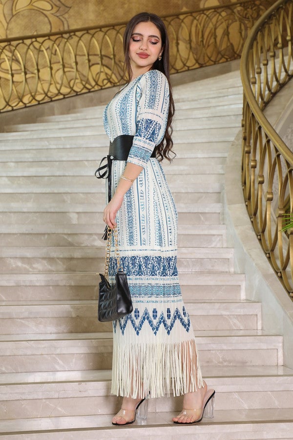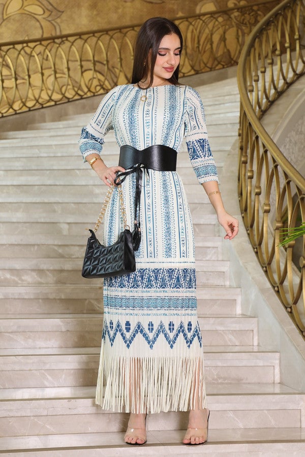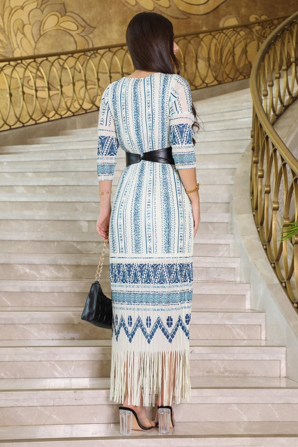 Blue fringed patterned midi dress