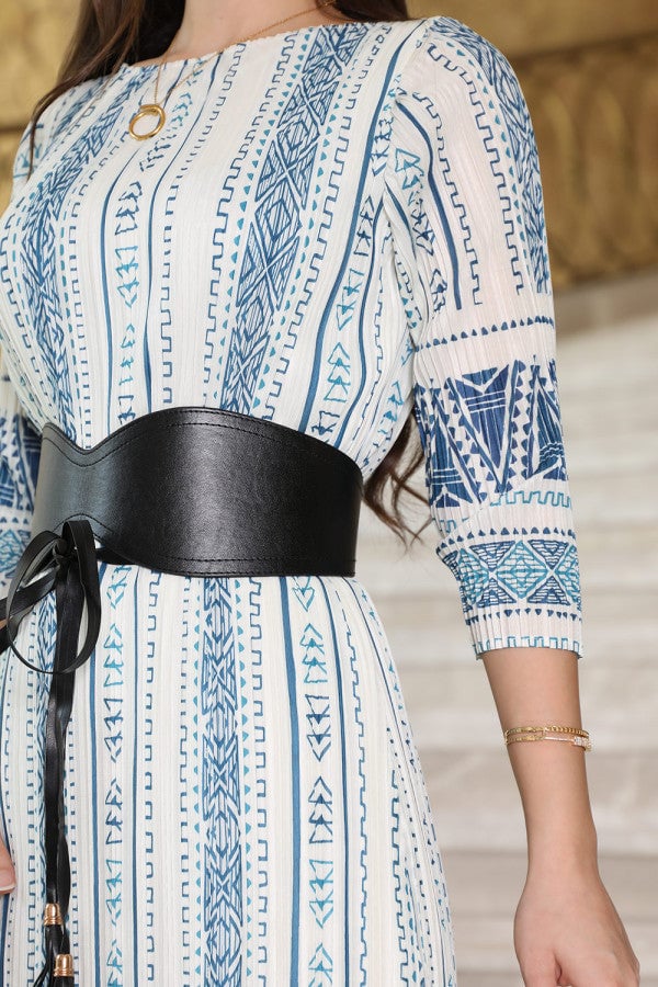 : فستان ميدي بنقش مزين بهدب وحزام على الخصر وكم حيران
