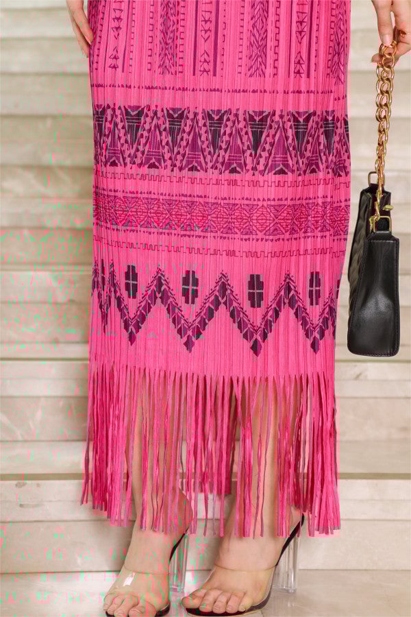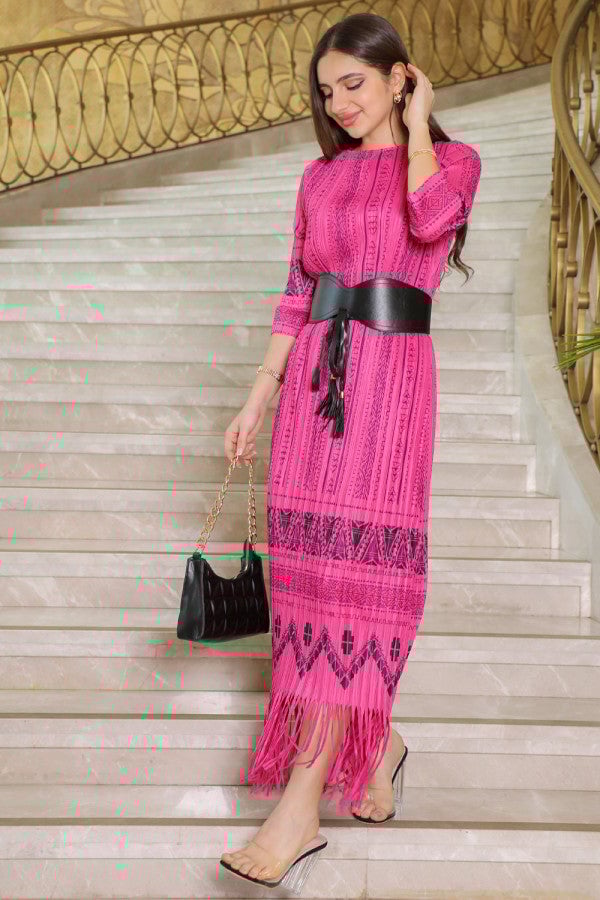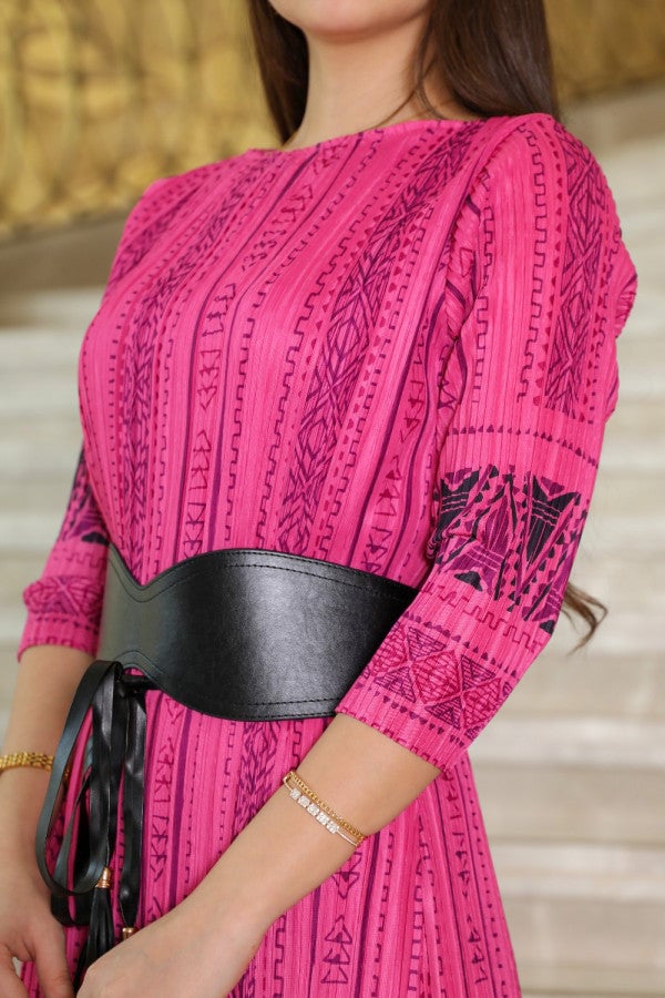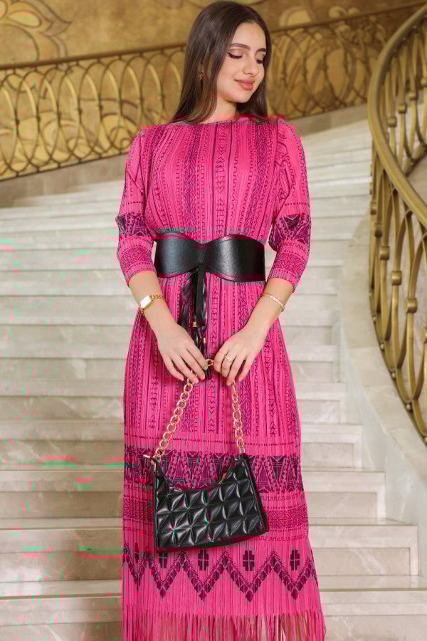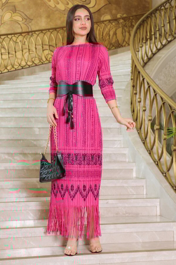 : فستان ميدي بنقش مزين بهدب وحزام على الخصر وكم حيران