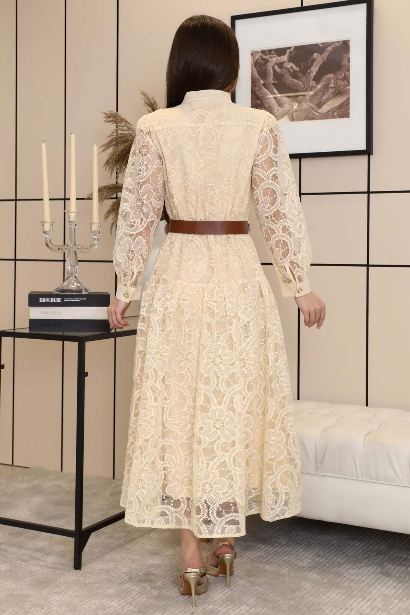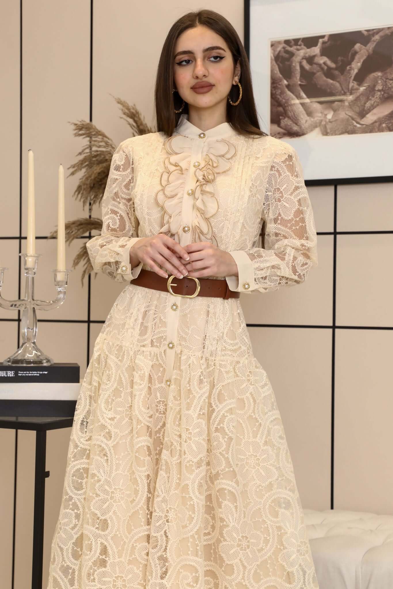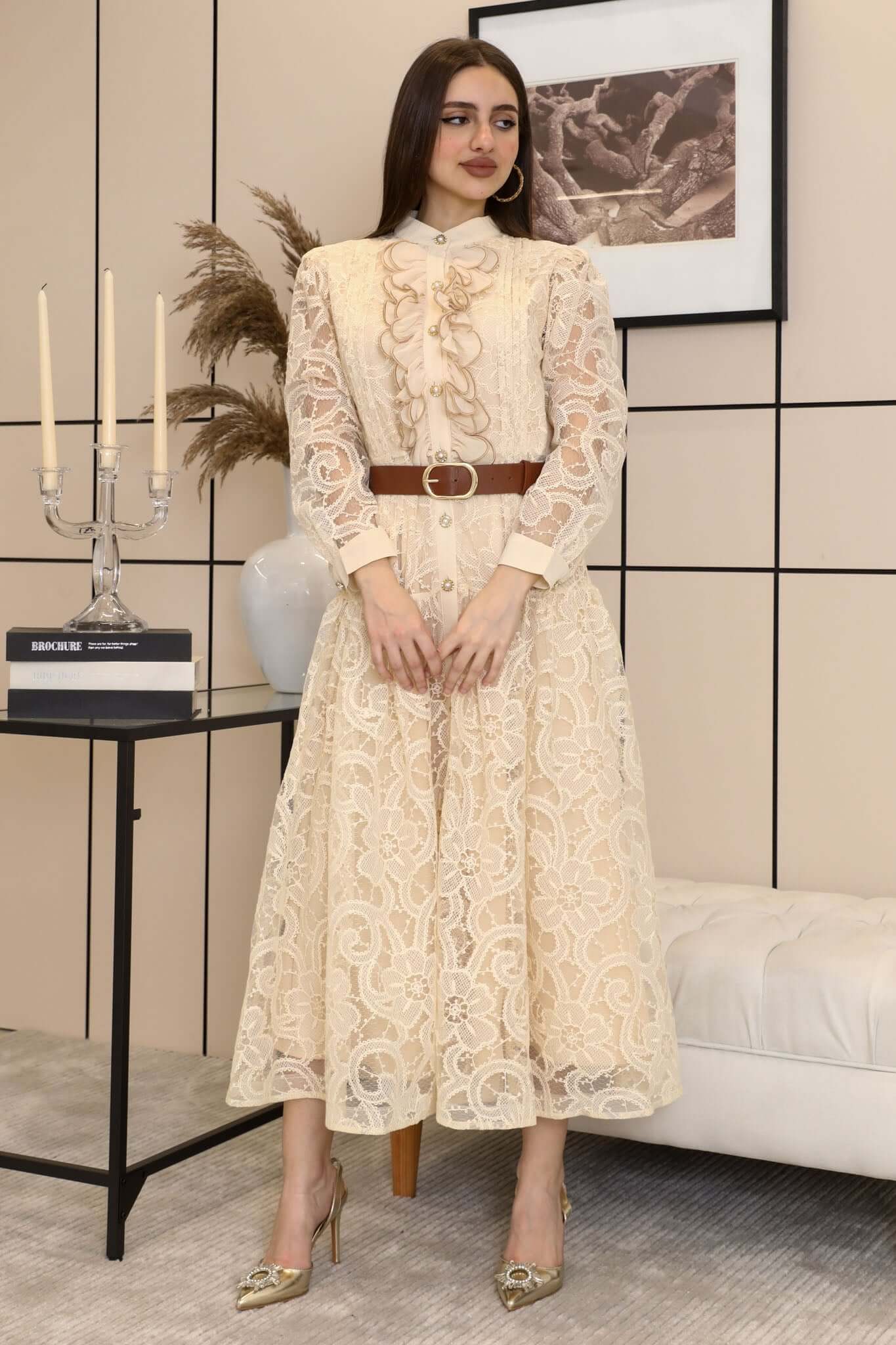Design type Ruffle lace midi dress Story type Midi dress with buttons, ruffle detailing at the chest, belt at the waist, long sleeves, and a high collar The occasion Public outing or special occasions waist narrow collar High sleeves long stretching Non-stretchable Material lace Add-ons belt Care instructions Machine wash and iron with steam at low temperature (40%) and hang dry.