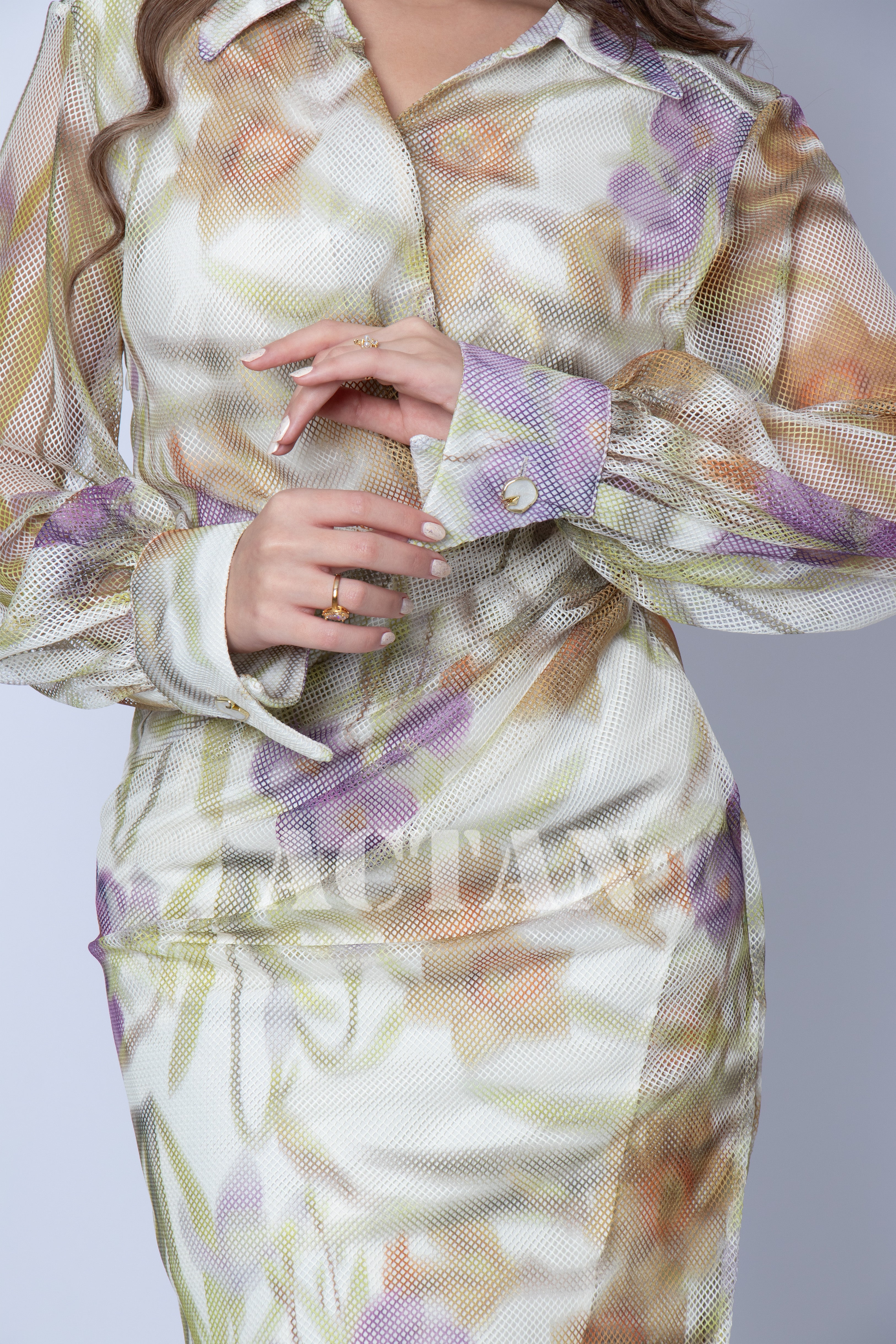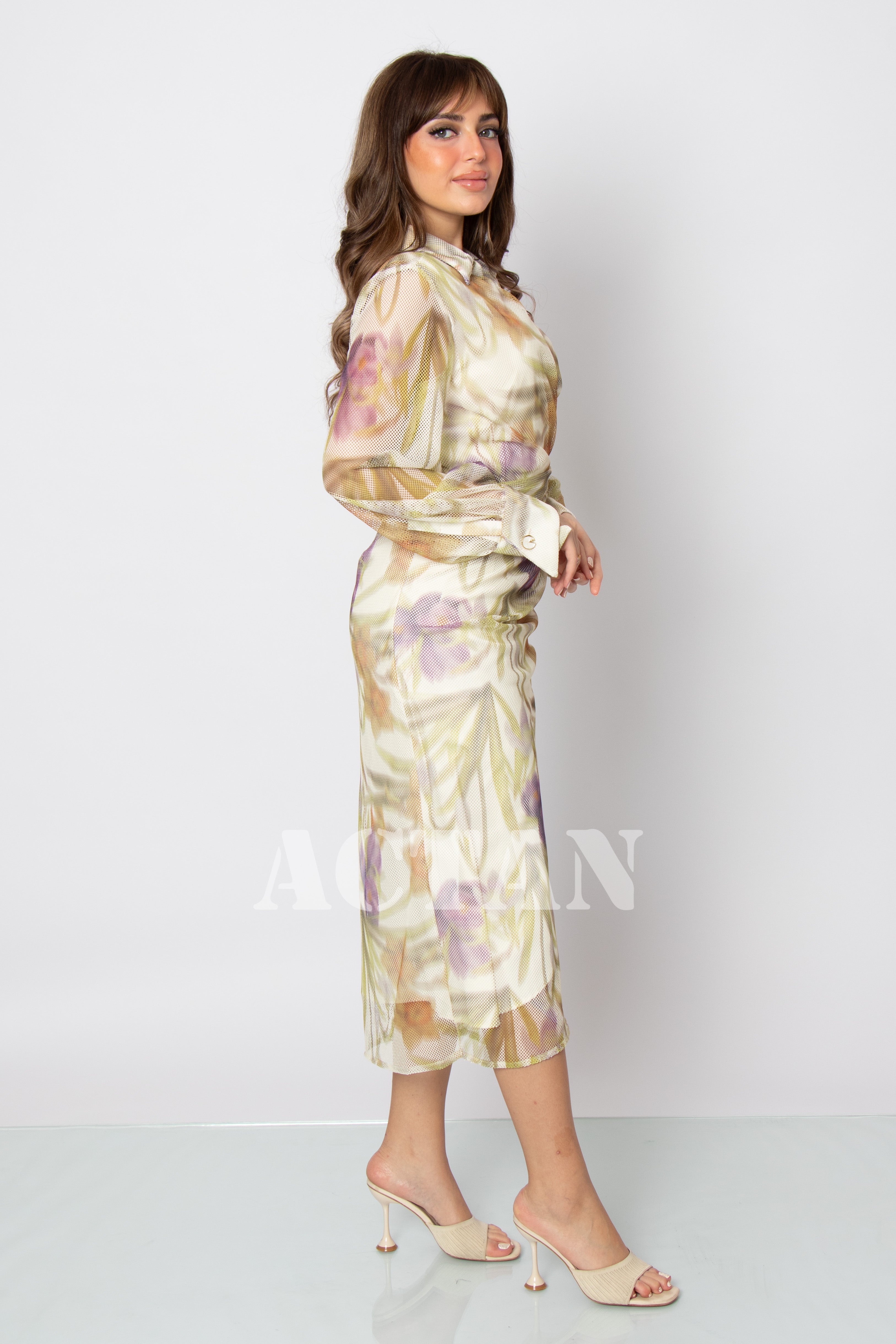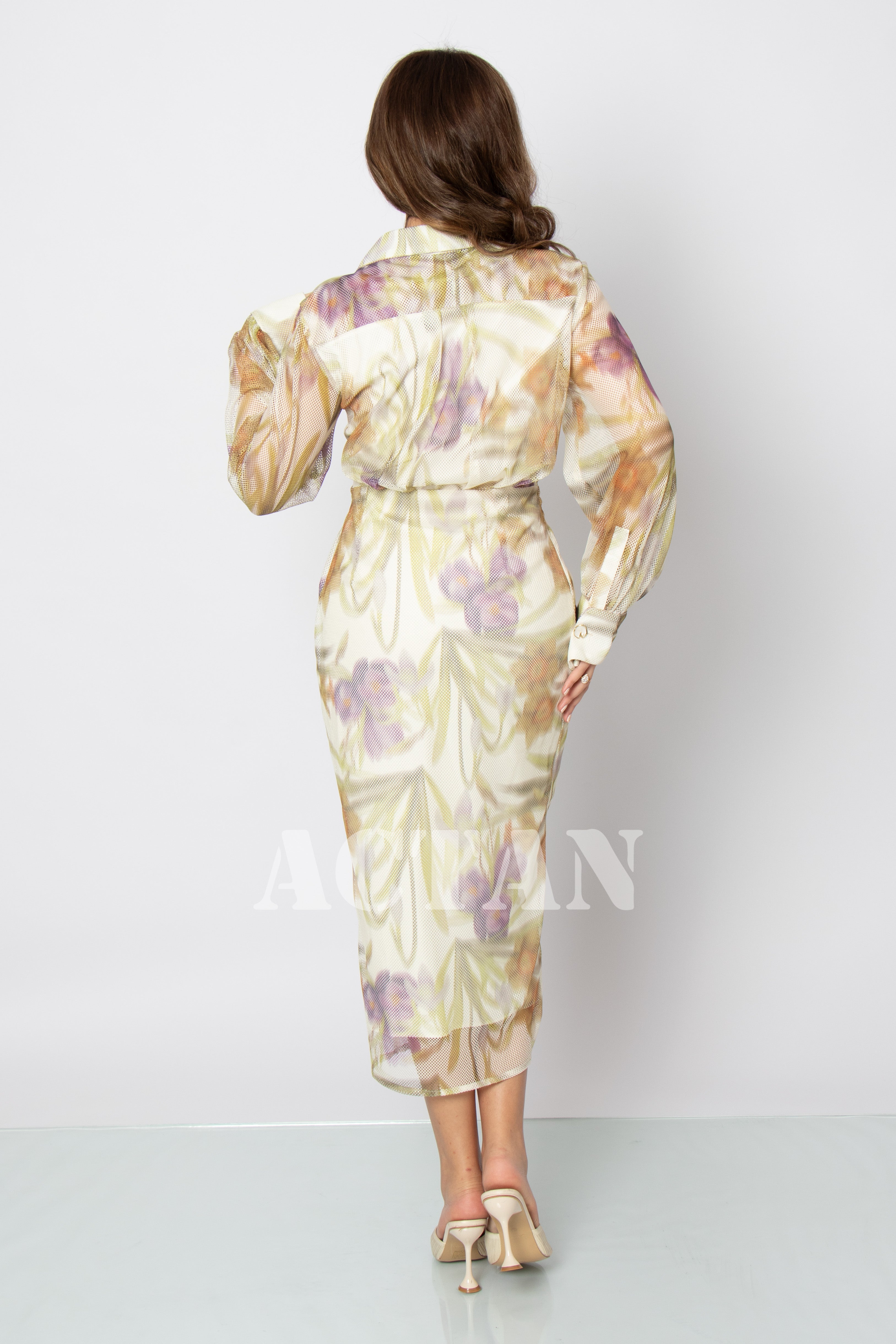 Design type Floral print draped midi dress Story type Draped floral print midi dress with a folded collar The occasion Public outing or special occasions waist narrow collar Folded sleeves long stretching Non-stretchable Material mesh fabric Care instructions Machine wash and iron with steam at low temperature (40%) and hang dry.