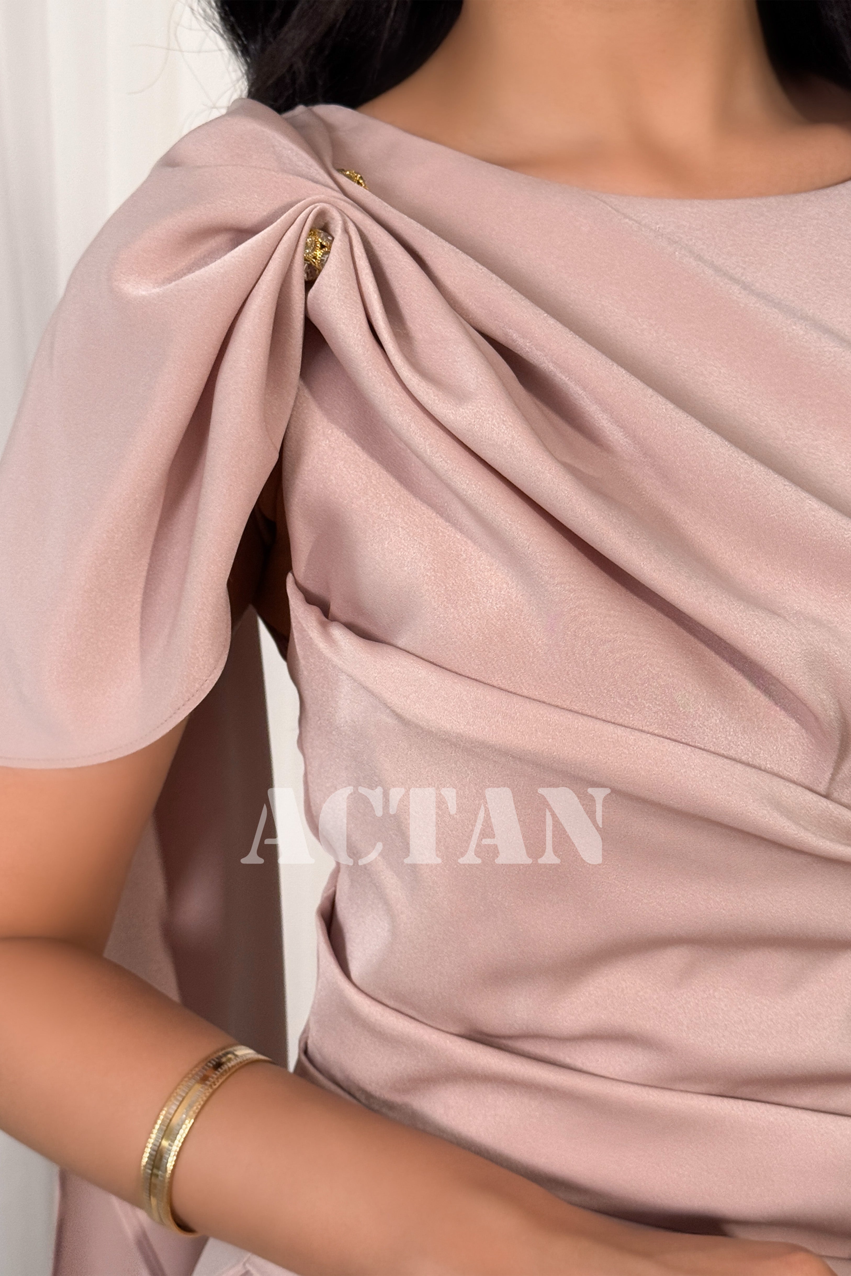 Design type Draped midi dress with scarf Story type Draped midi dress with brooch-embellished scarf and open back The occasion Public outing or special occasions waist narrow collar Circular sleeves short stretching Non-stretchable Material crepe Care instructions Wash and steam iron at low temperature 40 percent and hang dry