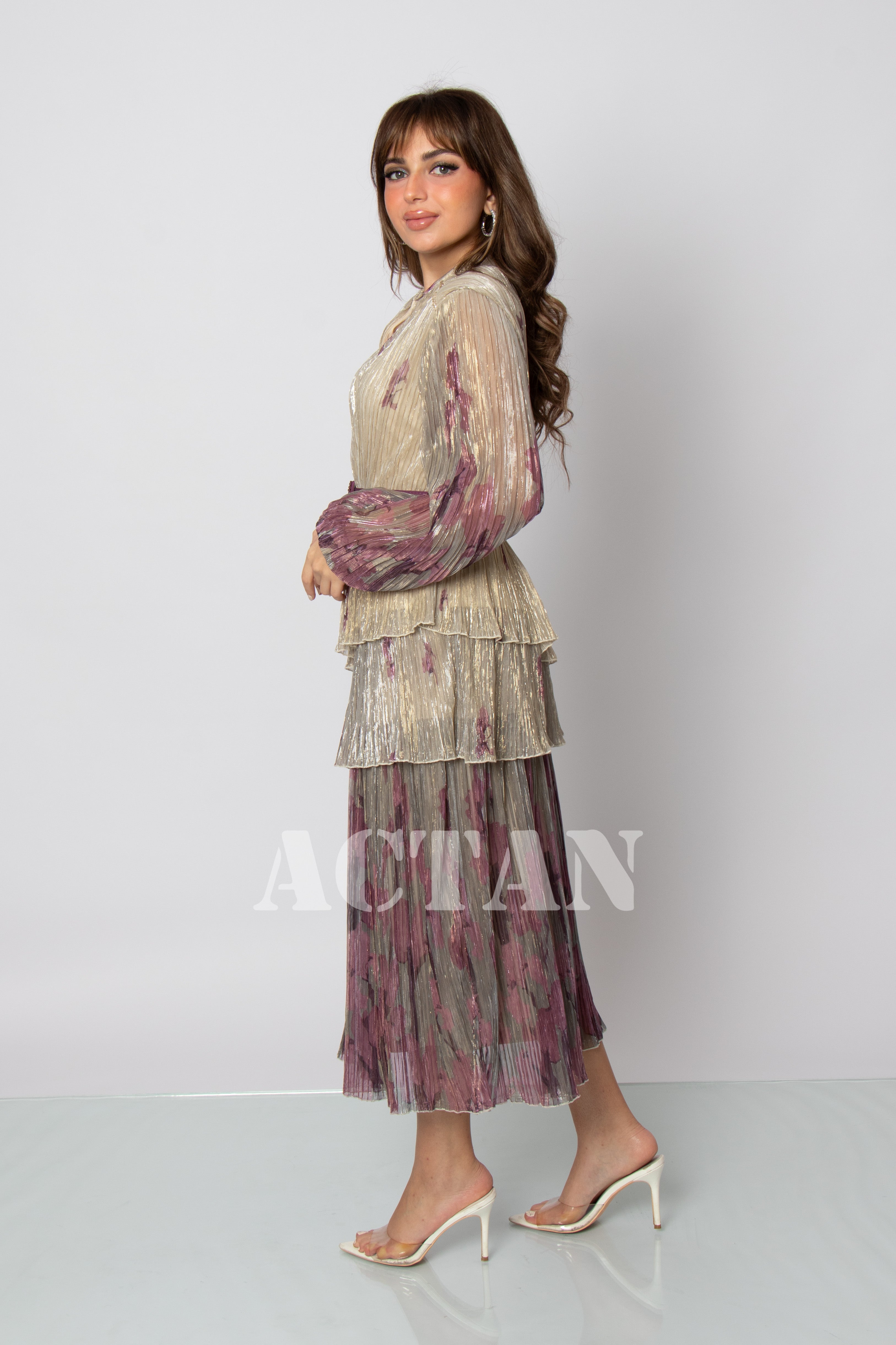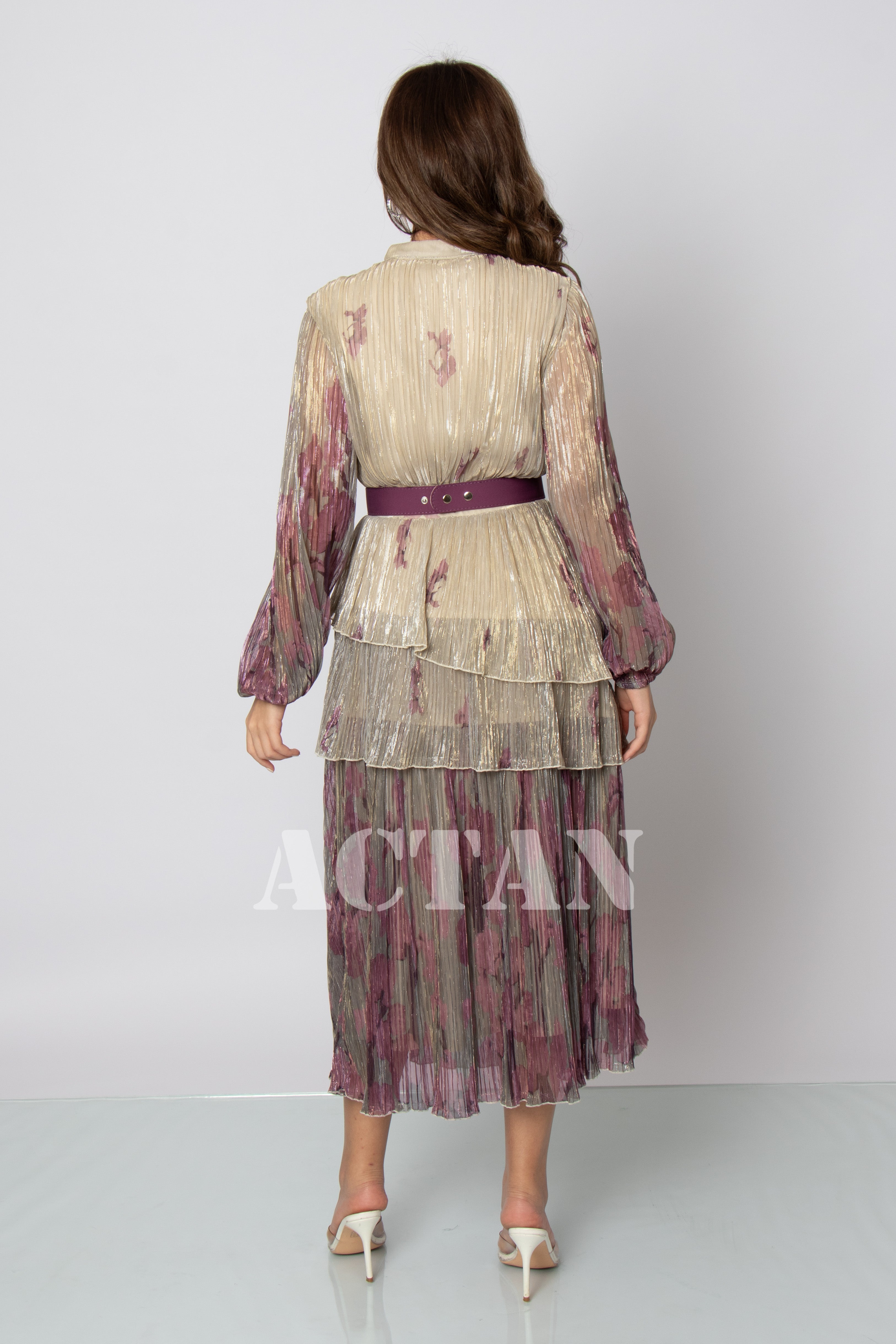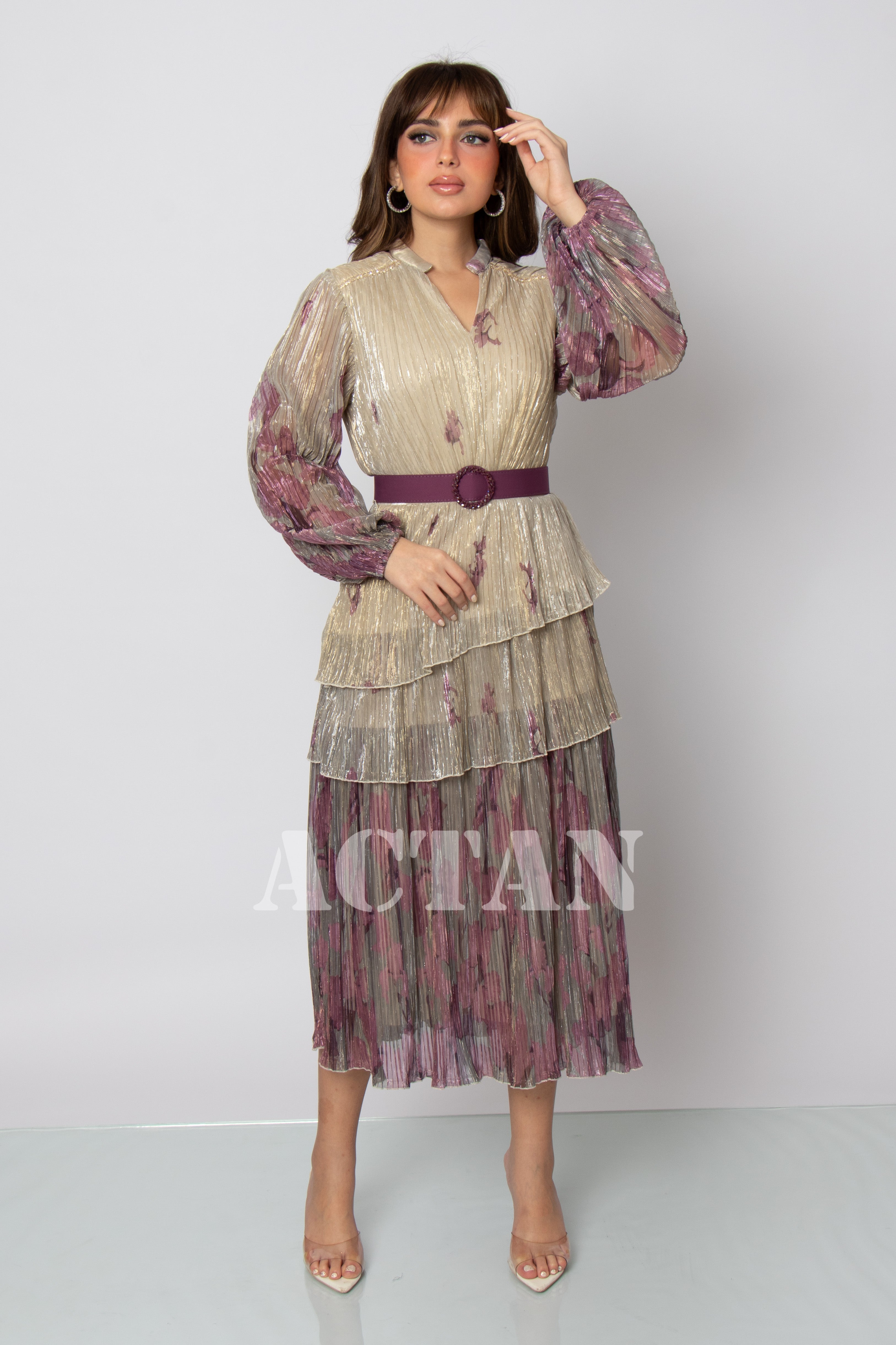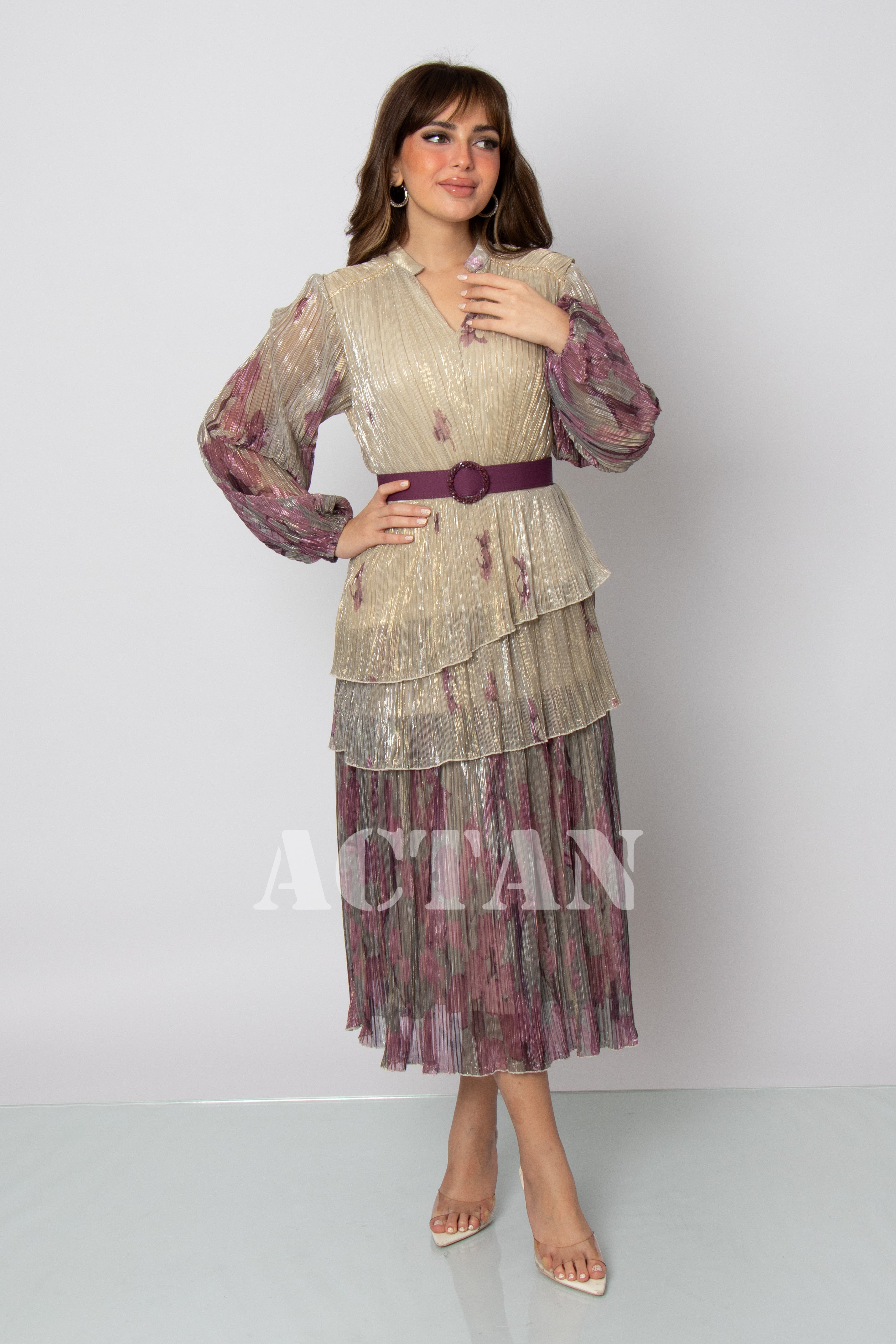 Design type Tiered chiffon midi dress Story type Layered chiffon midi dress with belt at waist, long sleeves and a V-neck The occasion Public outing or special occasions waist narrow collar V sleeves long stretching Non-stretchable Material chiffon Add-ons belt Care instructions Machine wash and iron with steam at low temperature (40%) and hang dry.