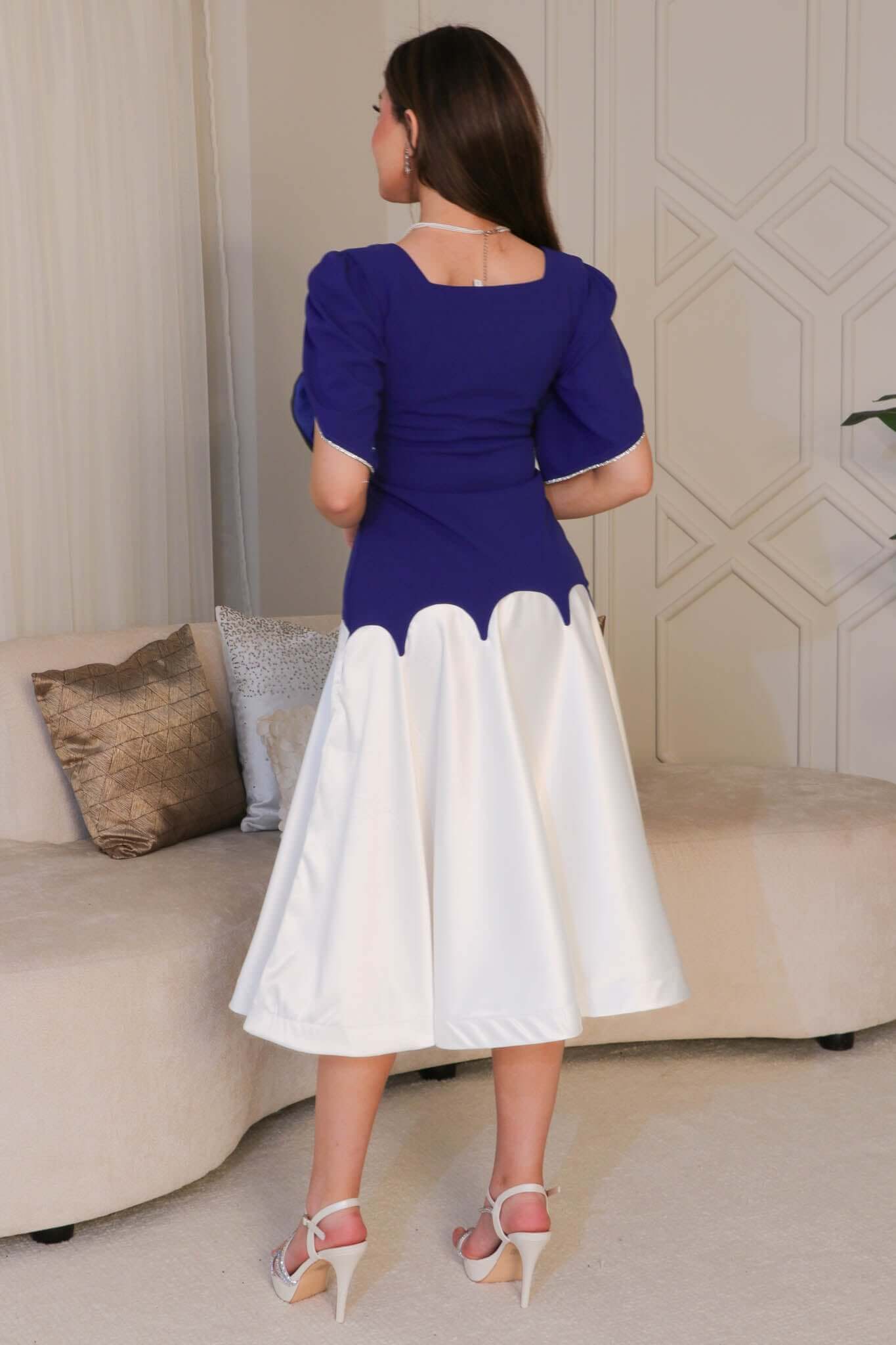: فستان ميدي مدموج الألوان مزين بالفصوص بأكمام قصيرة