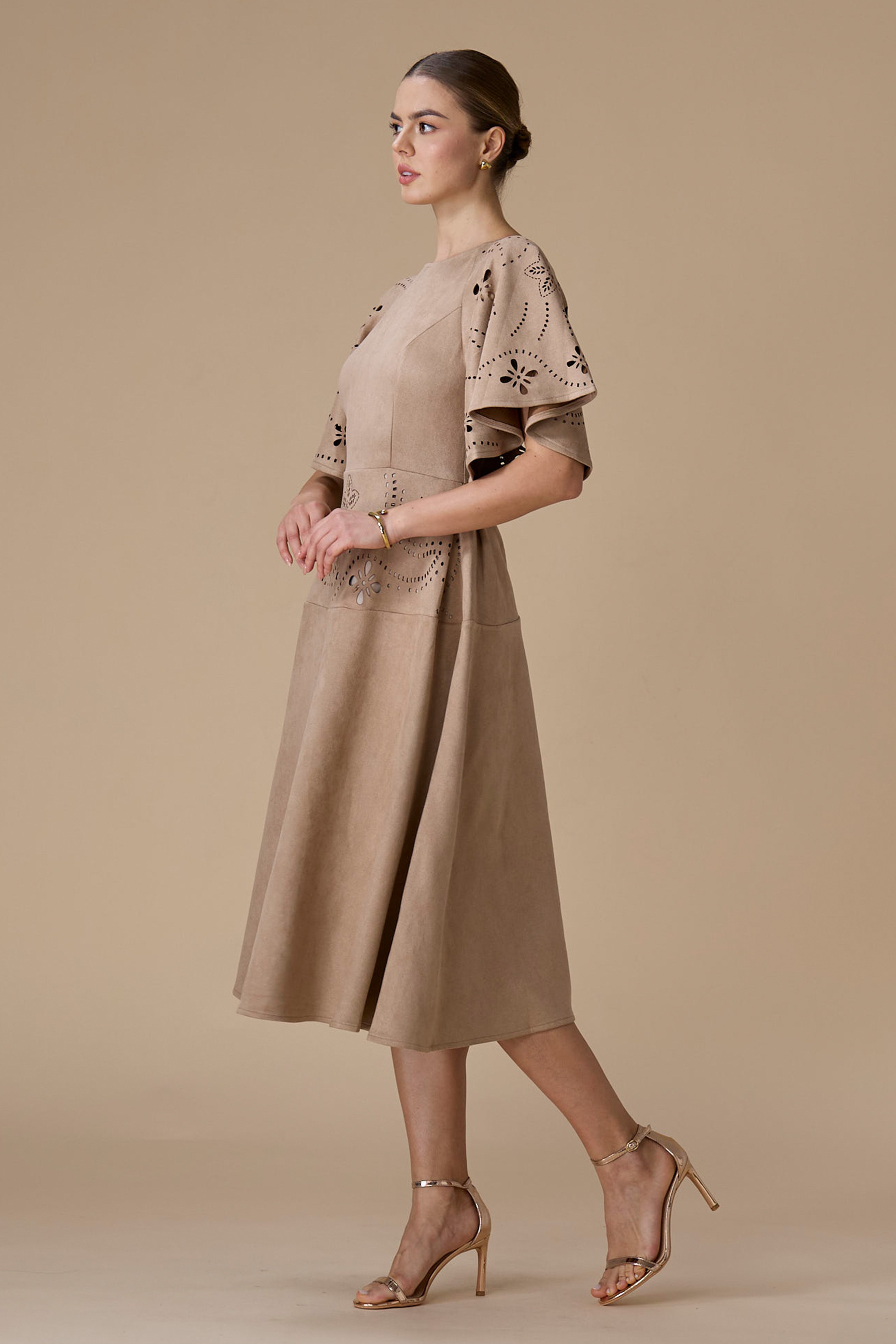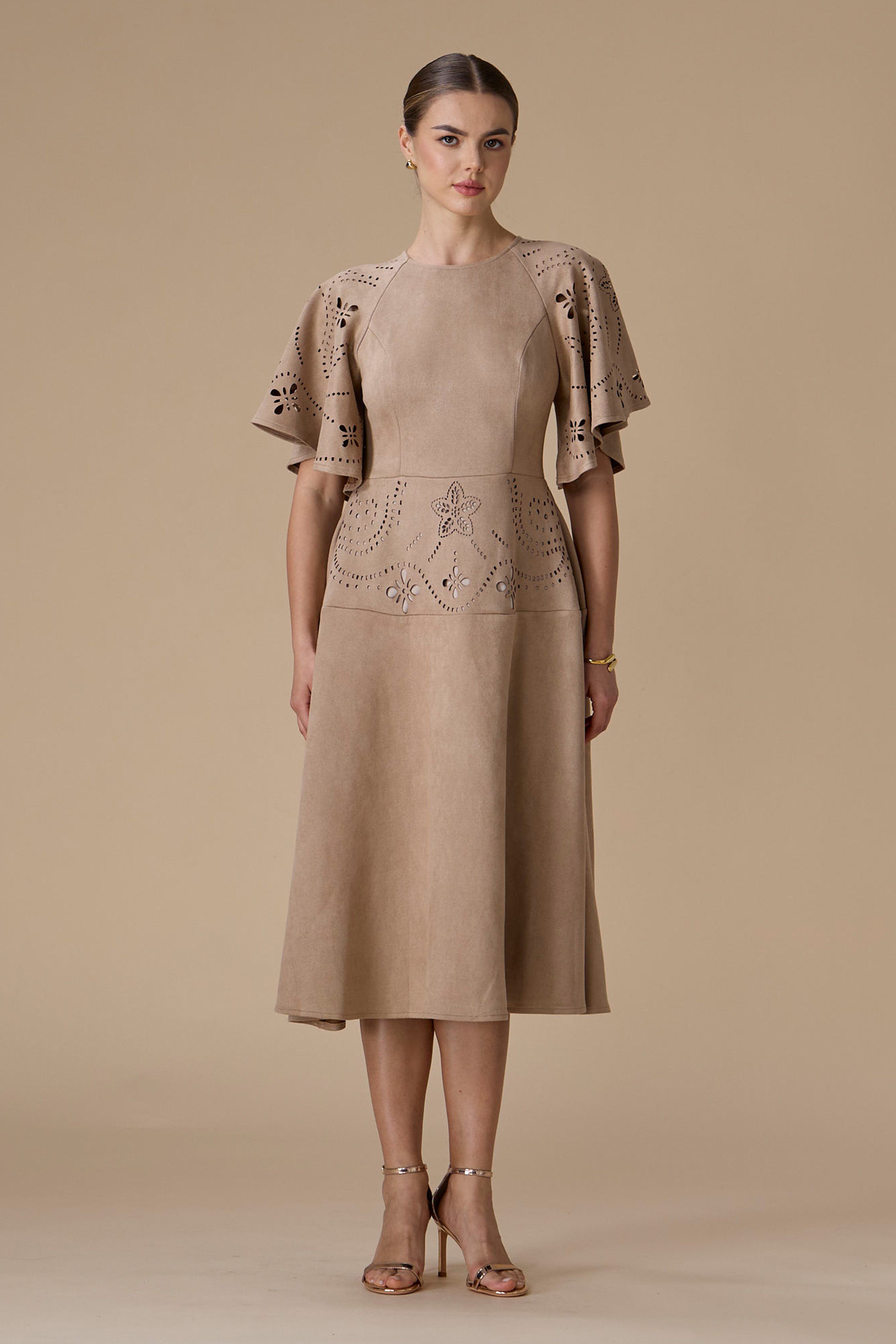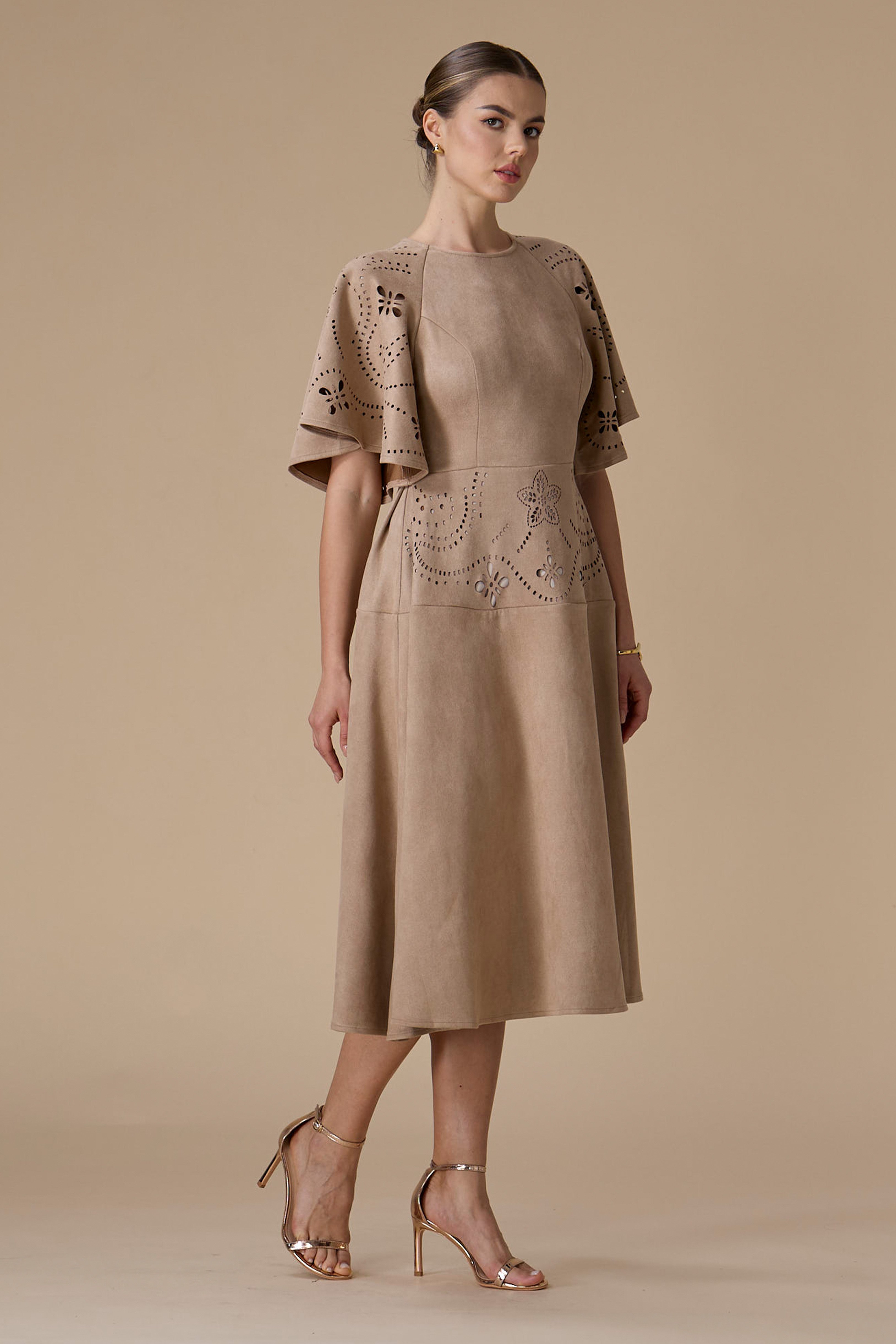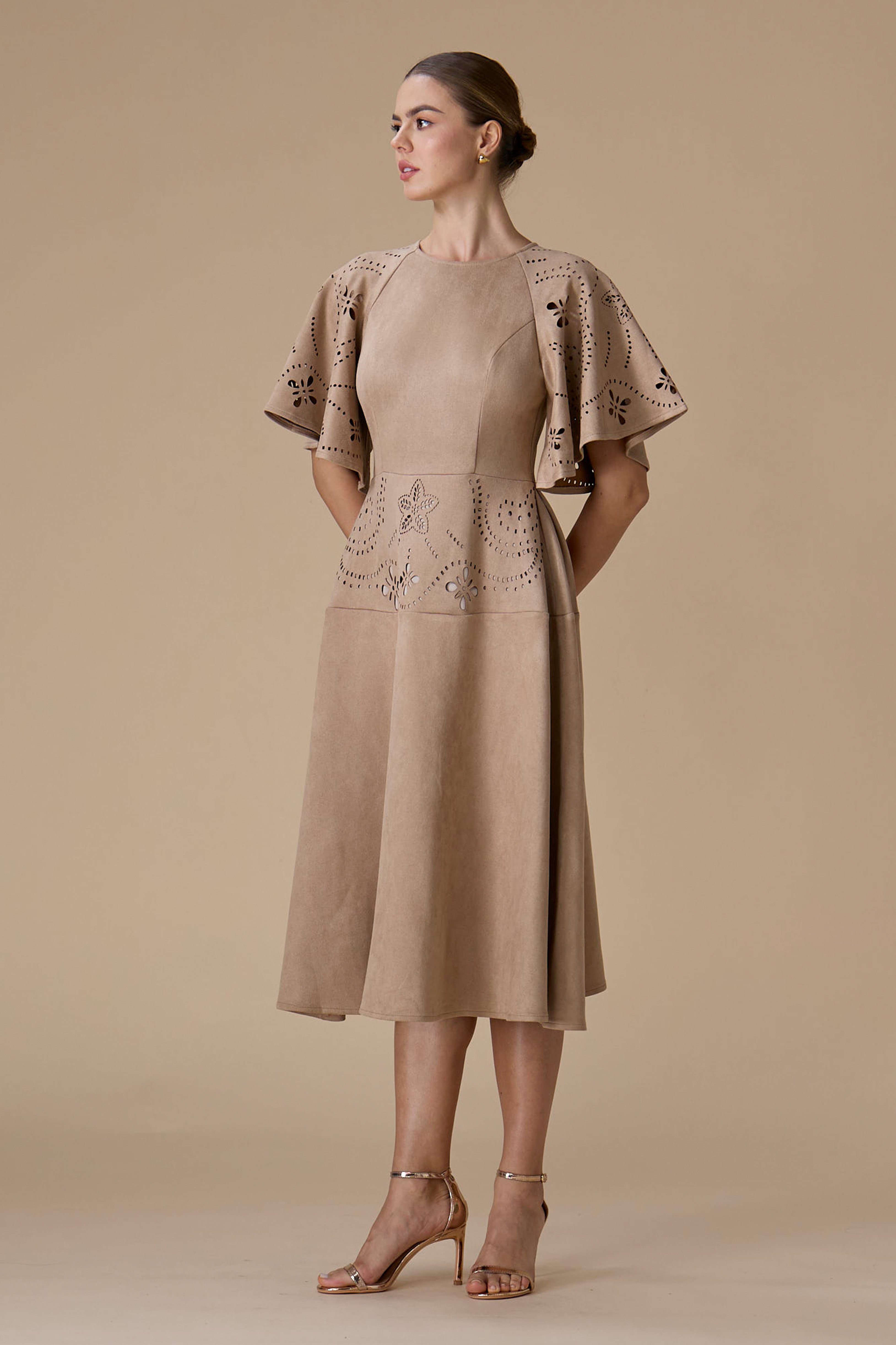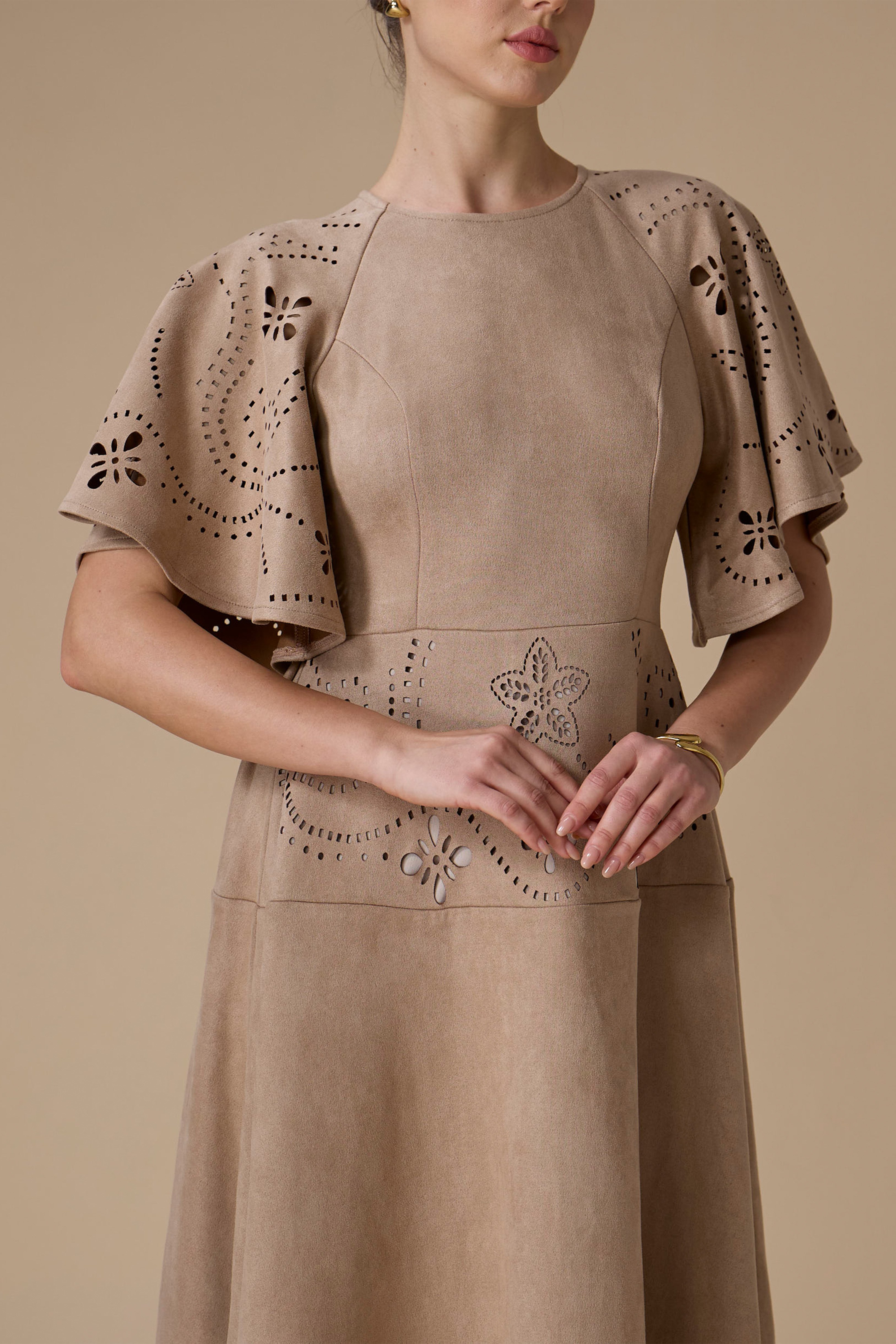 فستان بيج ميدي شامواه مخرم بنقوش الليزر بأكمام كاب وياقة دائرية