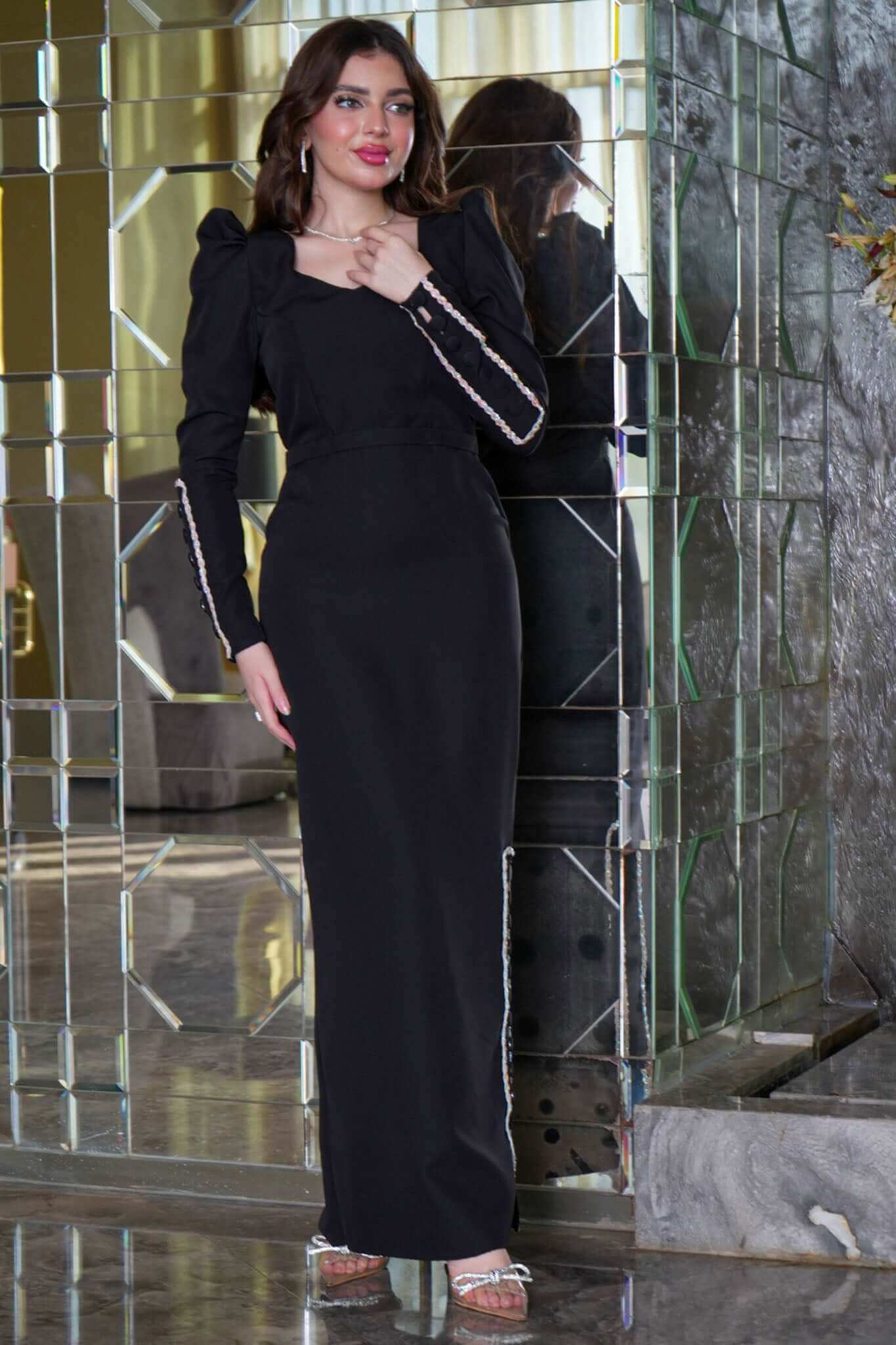 : فستان راقي مزين بحزام كريستالي، أكمام بف طويلة وقوية، بياقة هارت