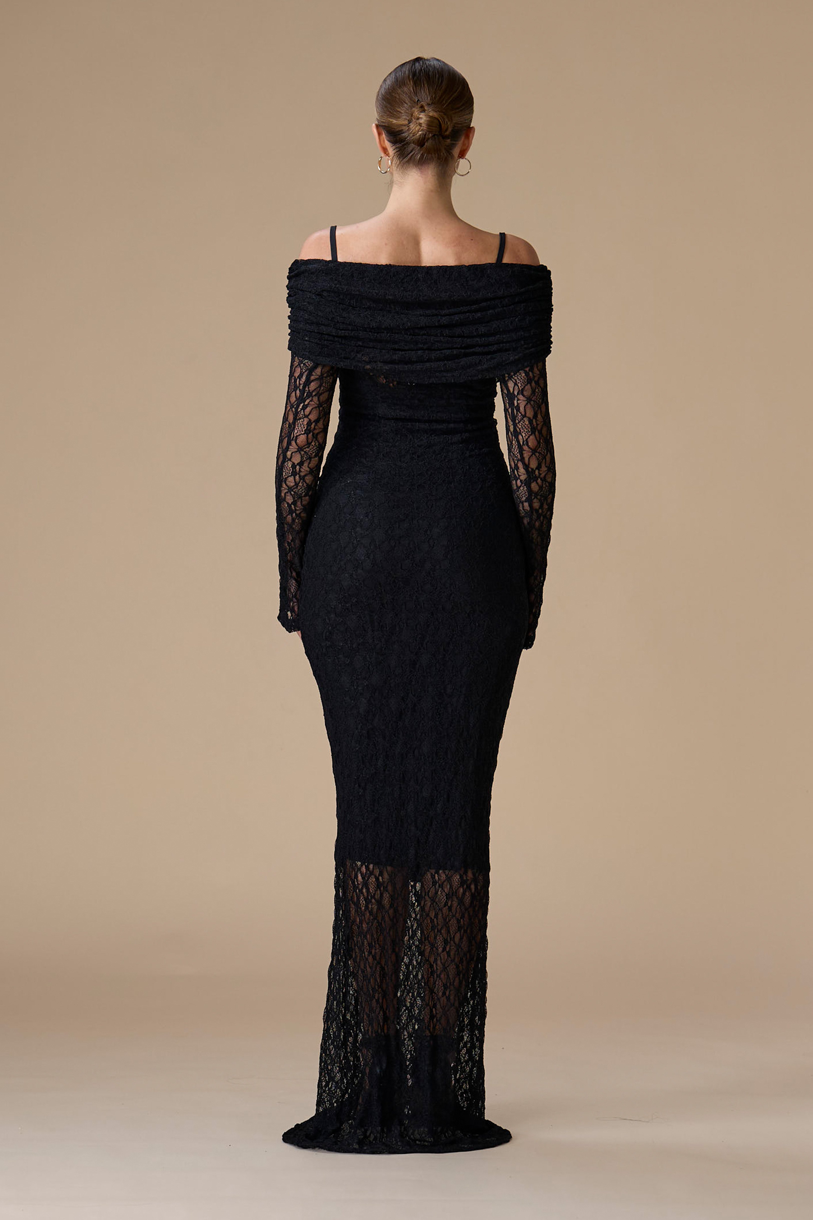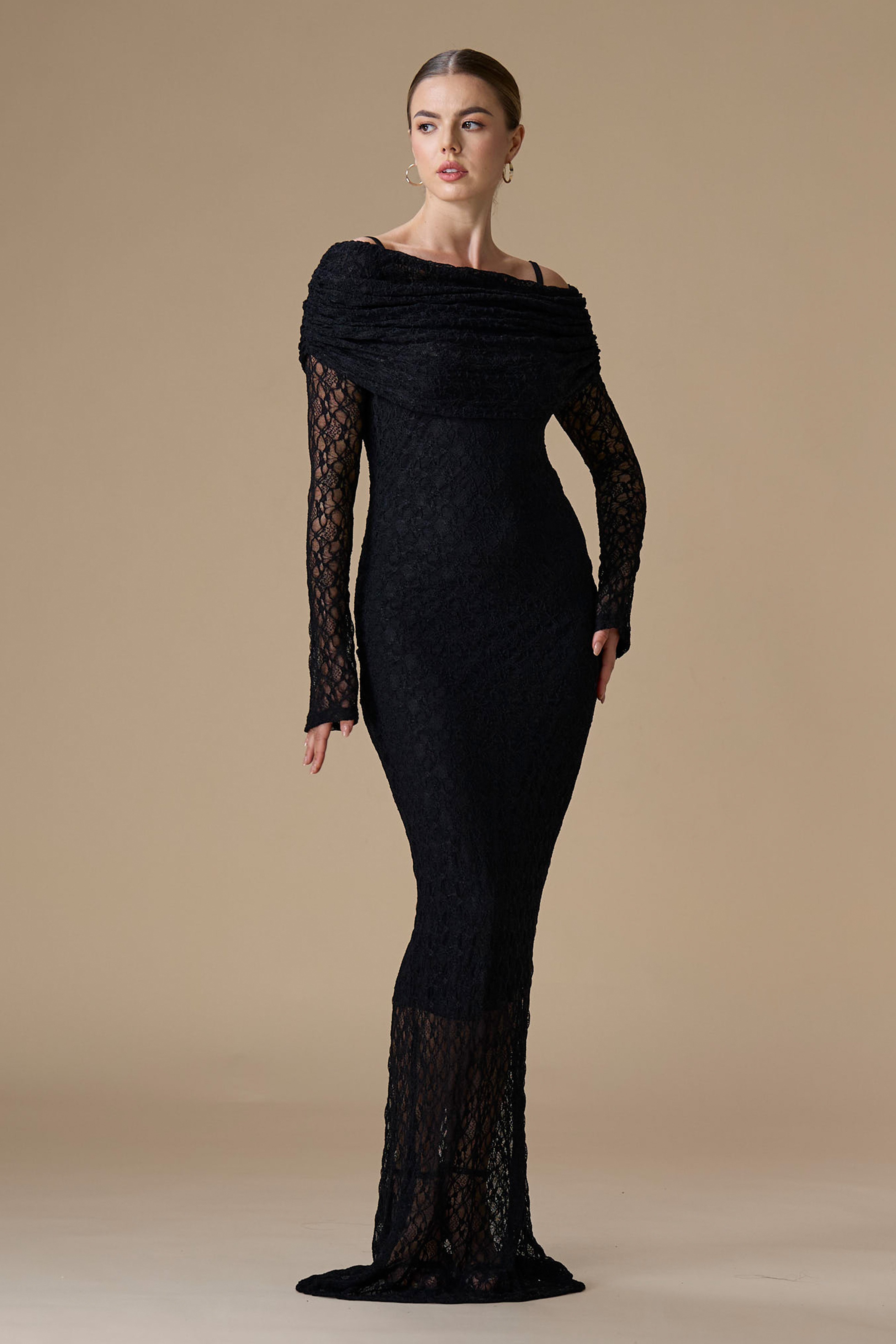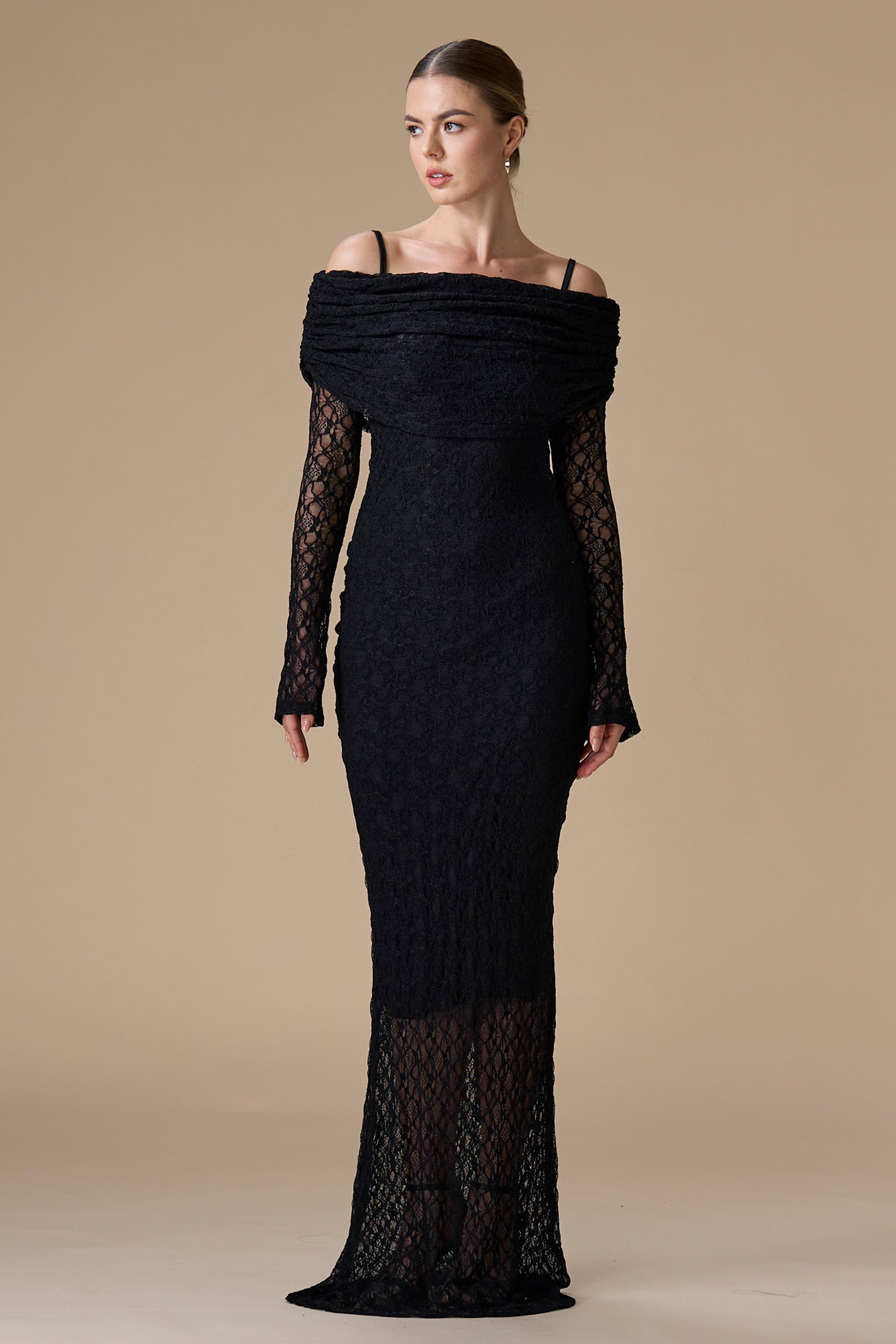 - نوع القصة: فستان أسود طويل ضيق بقصة أوف شولدر مع أكمام طويلة