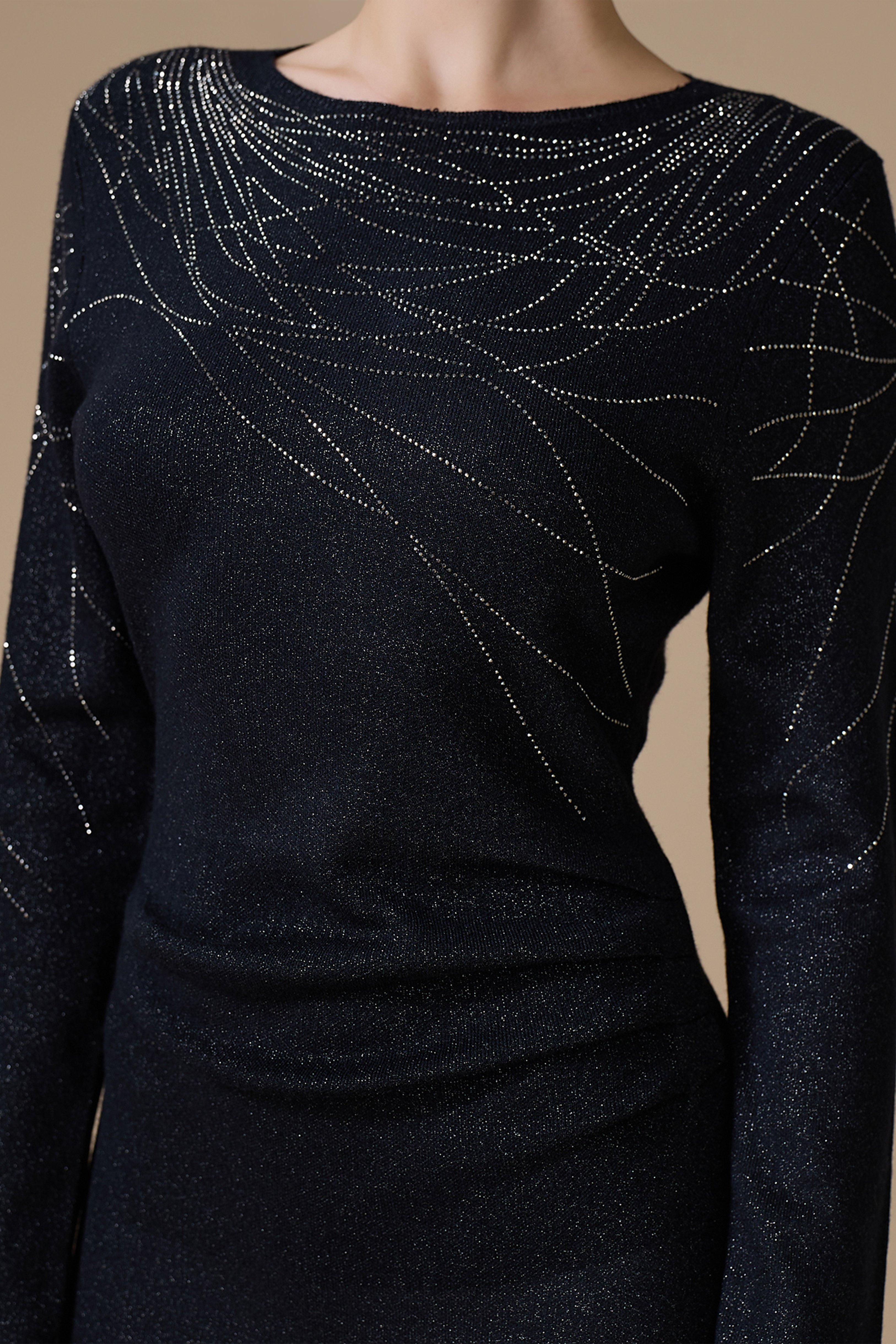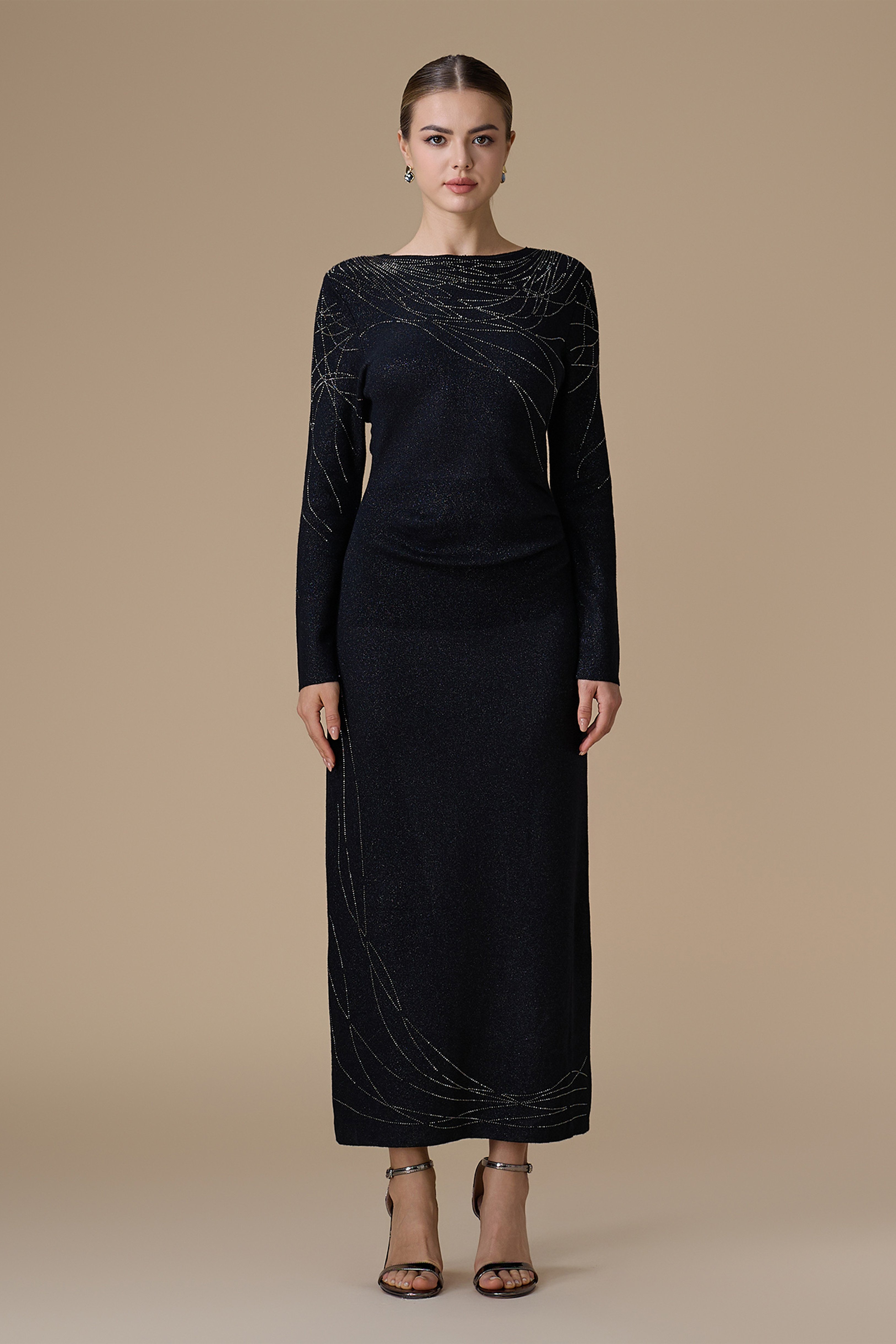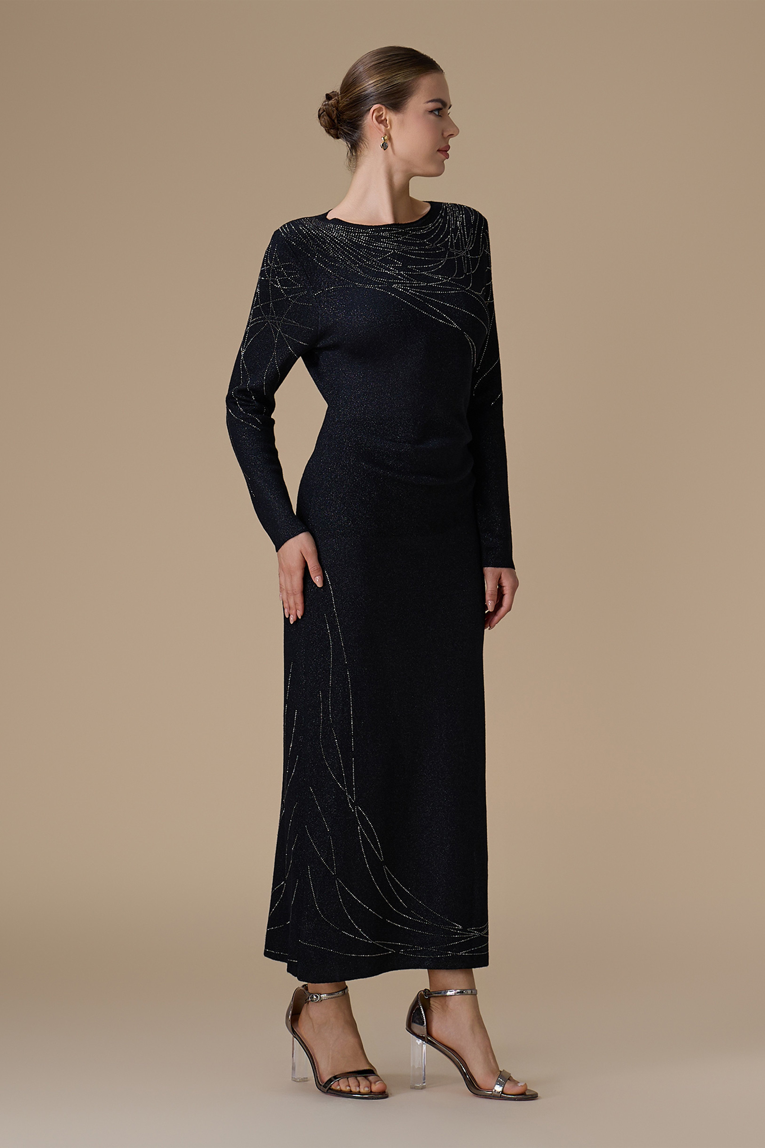 - نوع القصة: فستان طويل ميتاليك أسود بخطوط لامعة وقصة مستقيمة، بياقة مستديرة وأكمام طويلة ضيقة مع تمدد مريح