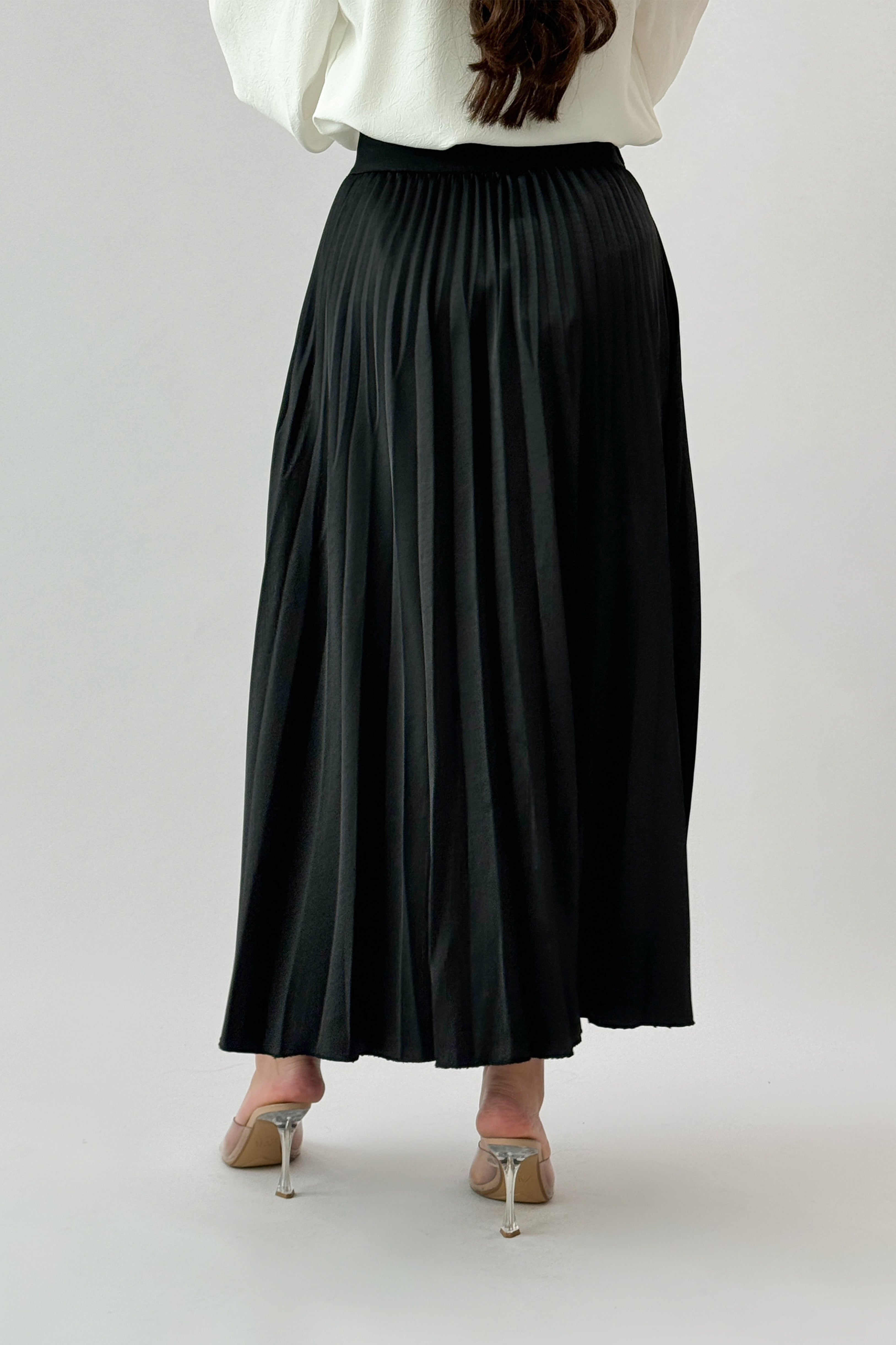 Black satin pleated skirt