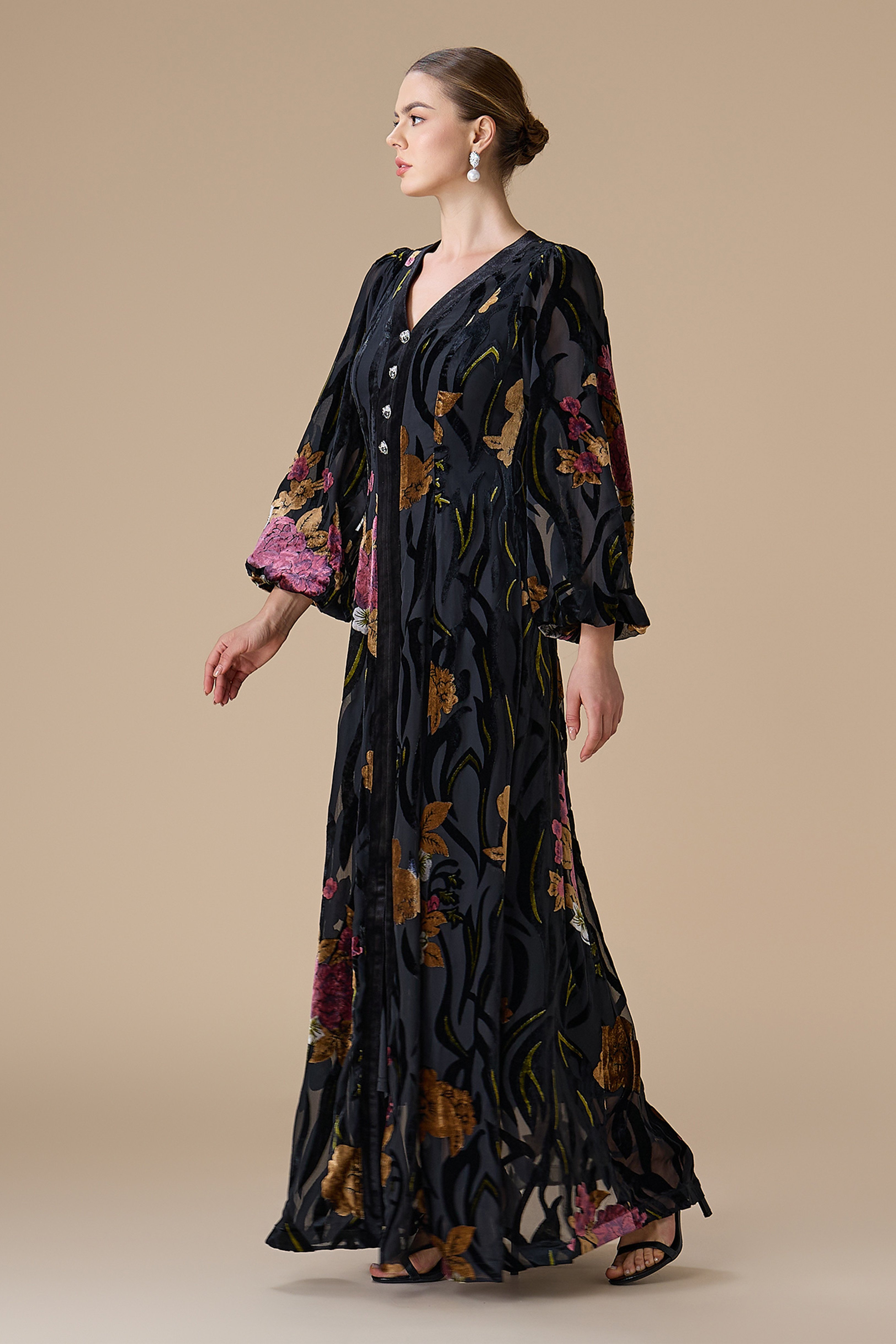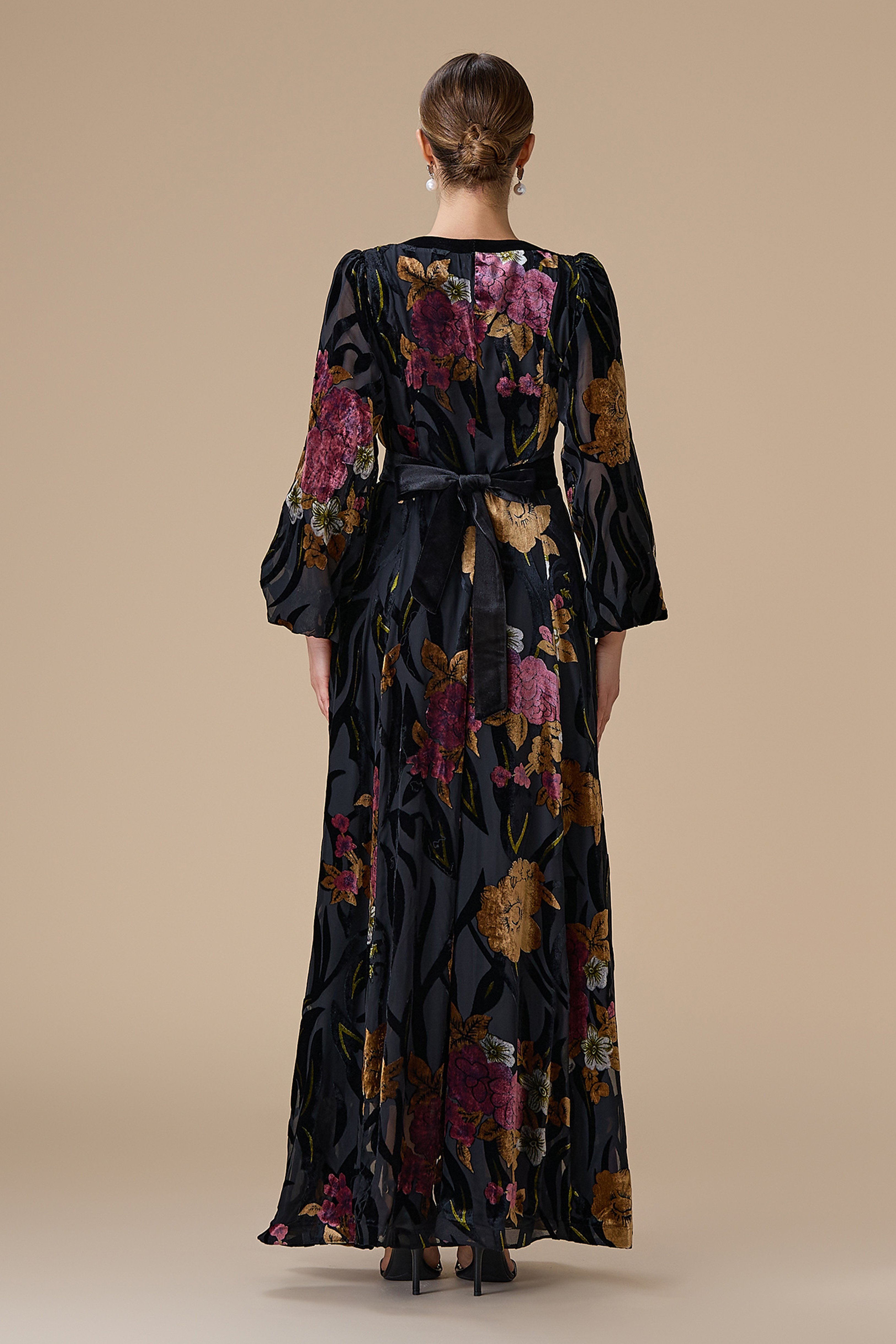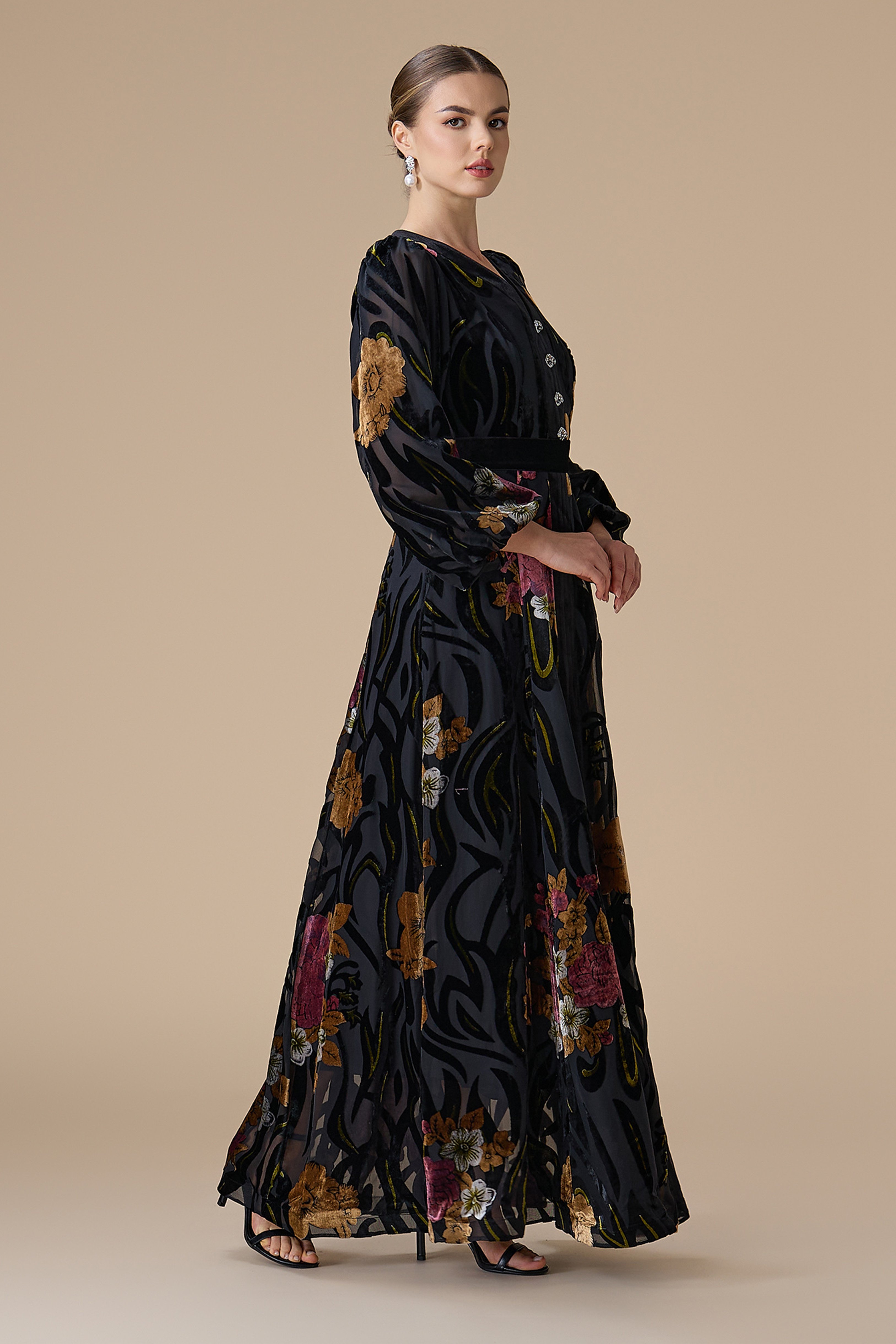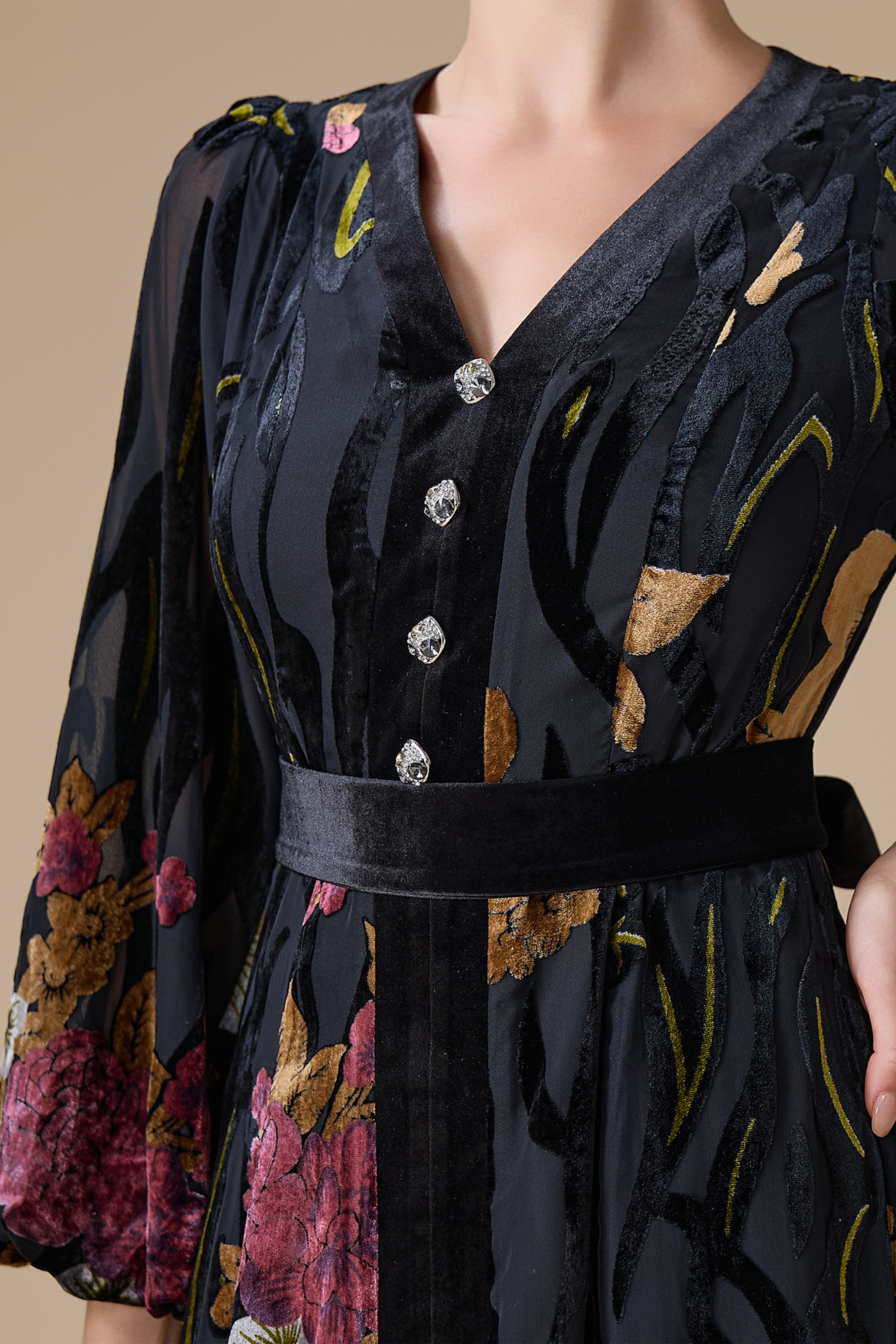 فستان طويل مخمل أسود بطبعة ورود مع أزرار أمامية وحزام يحدد الخصر، بياقة V وأكمام طويلة واسعة